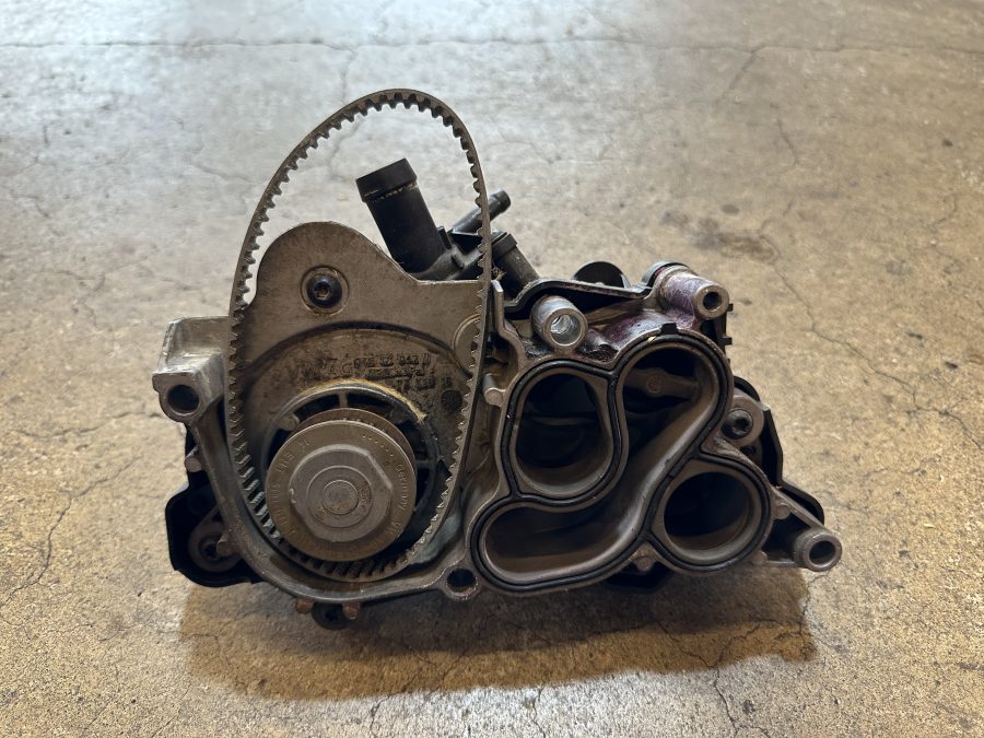 点検した結果エンジンのウォーターポンプから漏れていました。写真の赤丸のところミッションの上にピンク色の水が溜まっています。これがLLCです。しかしながらウォーターポンプ。。。VWのLLC漏れの定番ですね。。。他の輸入車や国産車でもあるある修理とは思いますが。このGOLF7のエンジンのウォーターポンプはエンジン後方に付いているのが特徴ですね。通常はエンジン前方でタイミングベルト駆動されています。
