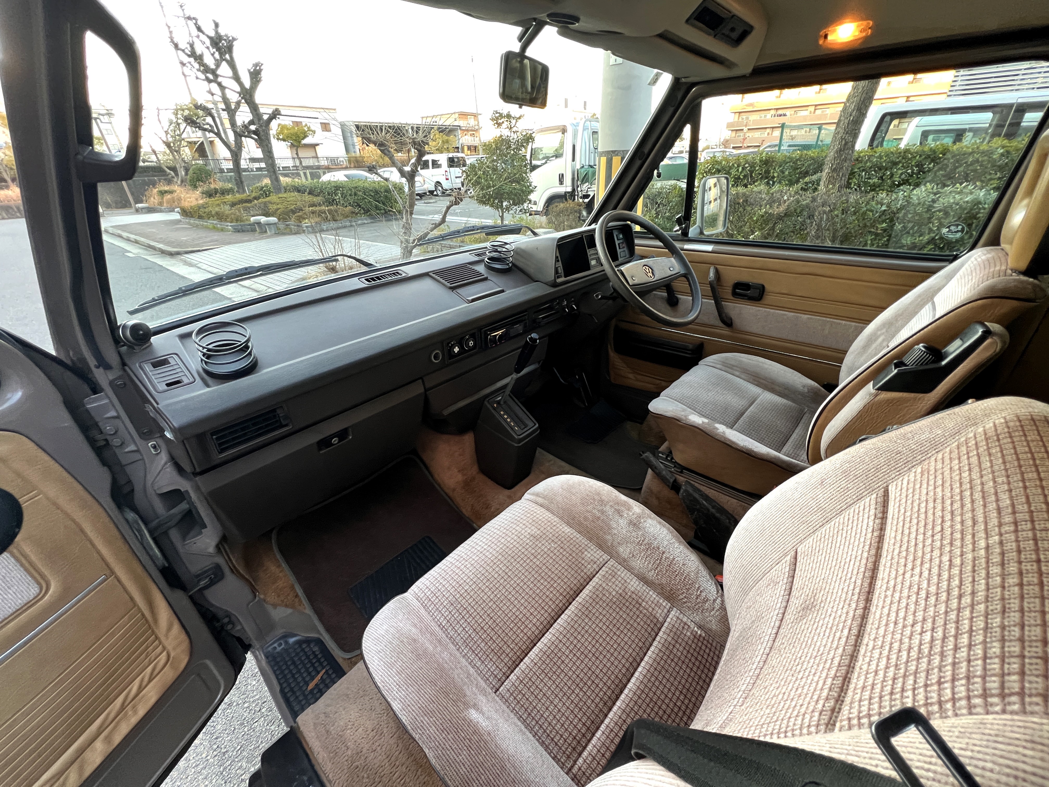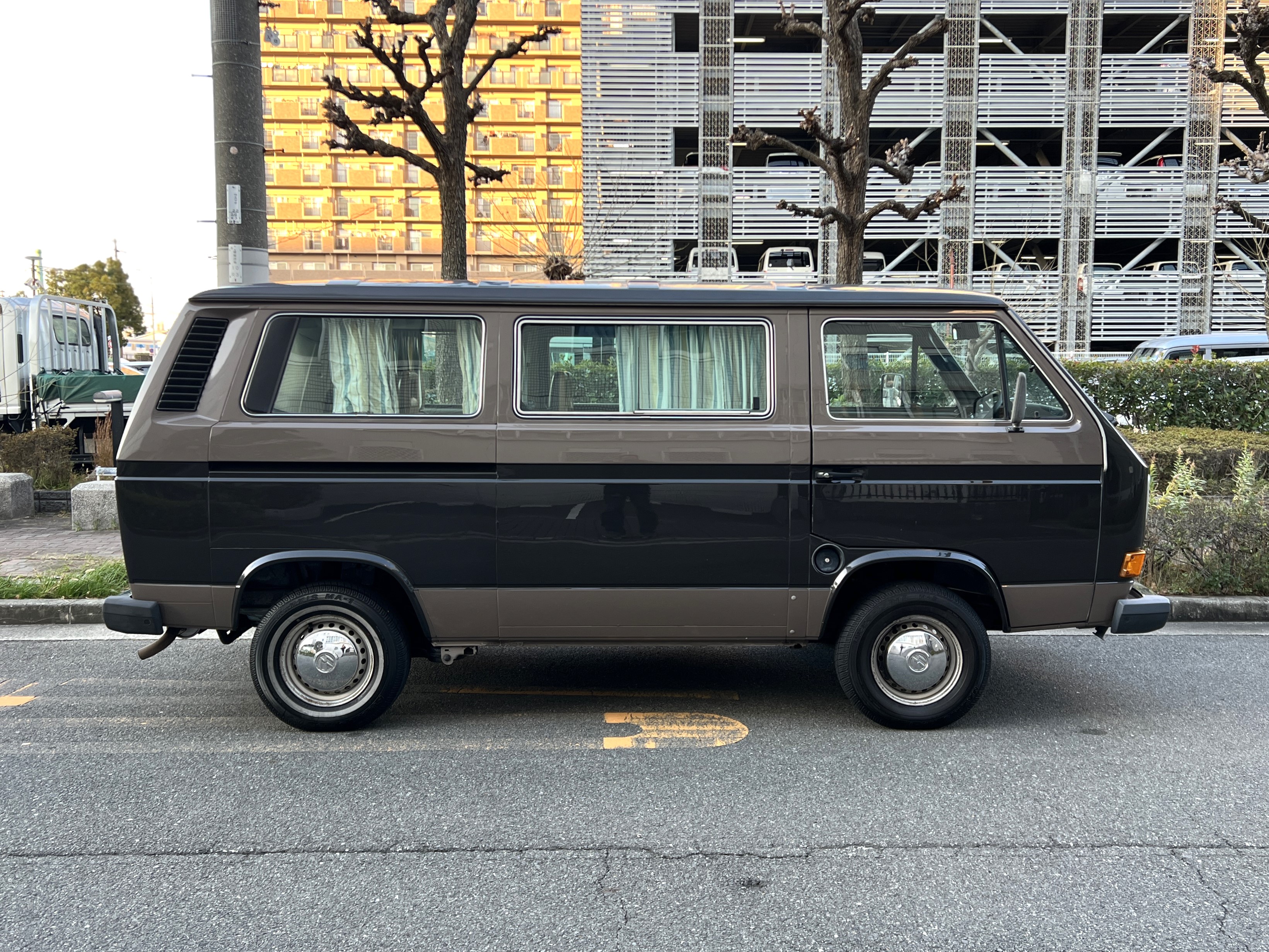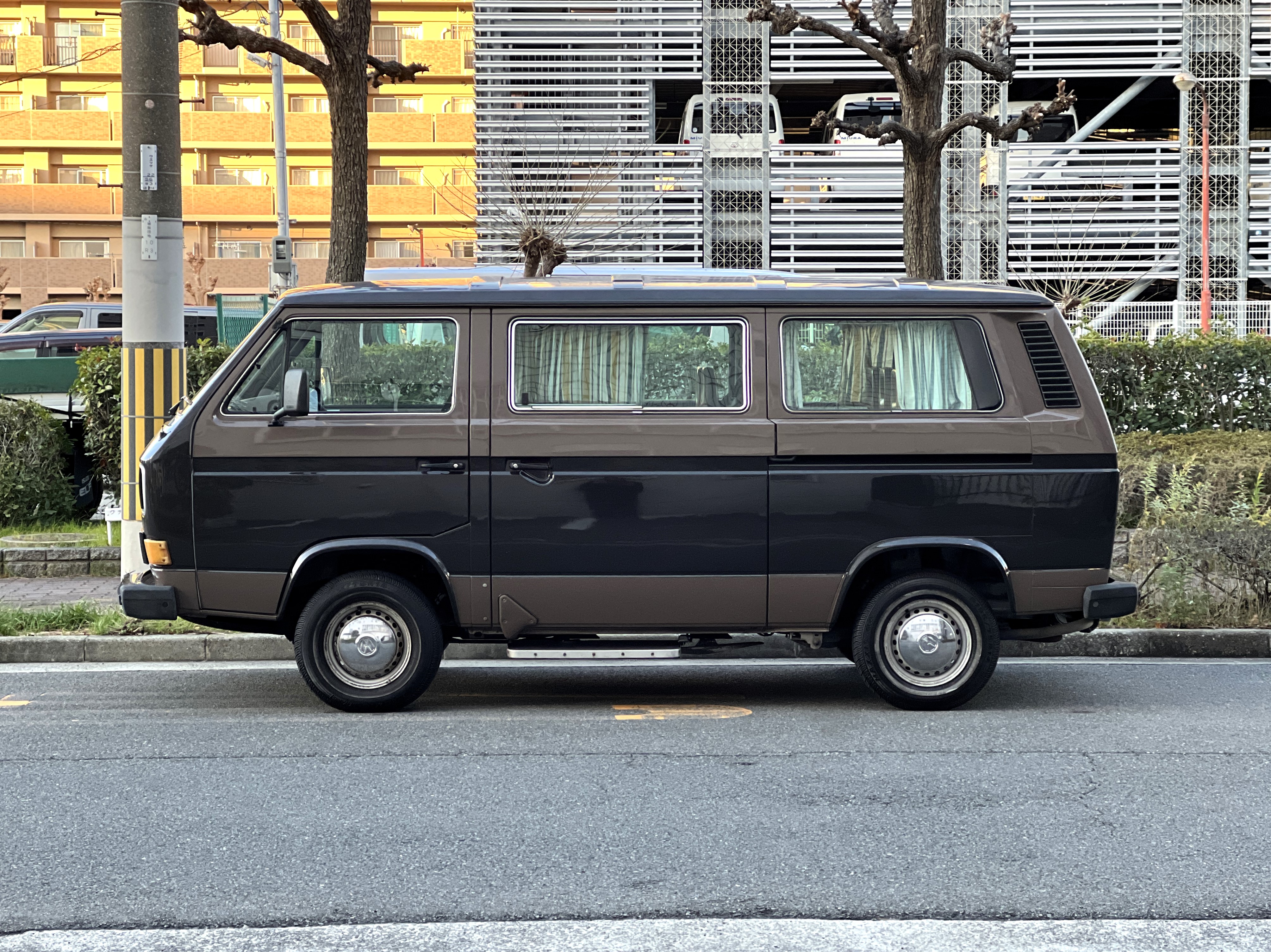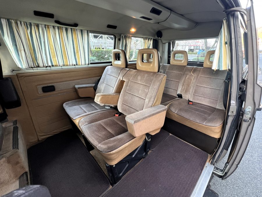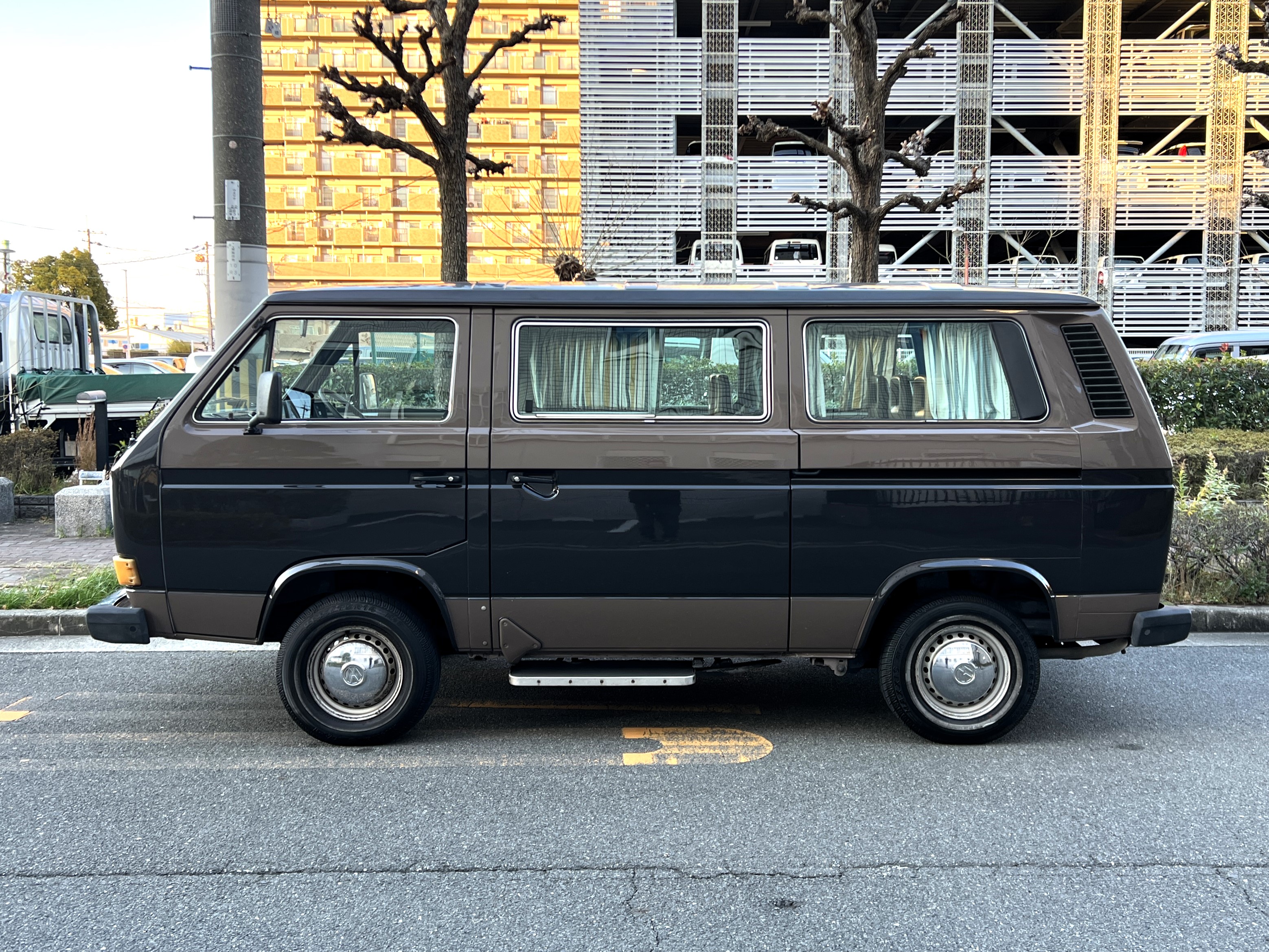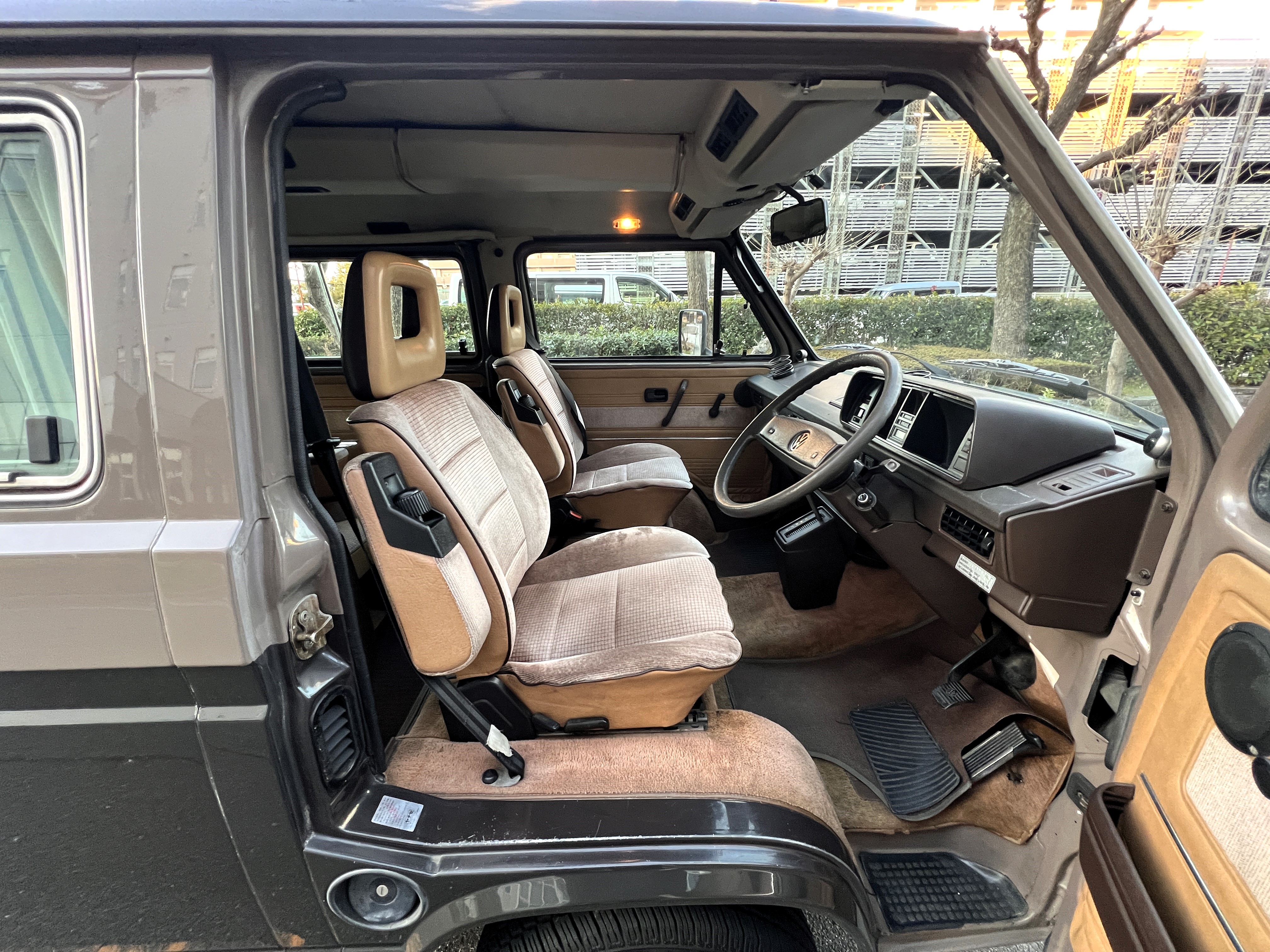 笑顔と家族愛に包まれた、ブラウンツートンT3カラベルの登場です♬ 今まで、これほどまでに家族の笑顔に包まれたT3があったでしょうか。お預かりの日は、家族団らんで記念撮影。お子さんたちは涙を浮かべながらのお見送り。その姿に、こちらまで胸が熱くなりました♫ 普段は5人家族で3列使ってフル乗車。決して広いとは言えない空間が、なぜかいつも以上に家族を近づけ、ただの移動手段ではなく、自然と団らんが生まれる場所になっていたそうです。軽井沢、八ヶ岳、箱根へのドライブ。アウトドアといえばグランピングが中心でしたが、そのどんなシーンにも、そばにはこのブラウンカラベルがあったそうです。現オーナーさまは、自動車好きなら誰もが知る某有名自動車雑誌の重鎮。職業柄、数えきれないほどの車種を知り尽くしている方が、4年前に選んだのがこのカラベル。それは、GAKUYAにてエンジンをフルオーバーホールした個体◎ 信頼できる状態であることも、大きな決め手だったそうです。仕事でも各地のサーキットや取材へと共に走り、まさに“公私ともに相棒”だったそうです👍 そして次なるステージへ。お仕事柄、さらなる経験を積むためにEVのID.BUZZへとお乗り換え。けれど、その選択もやはり“ワーゲンバスのパッケージが好き”という一本の軸の延長線上。形は変わっても、その想いはまったくブレておりません♫ 「このバスは、本当に楽しくて好き。ぜひその楽しさを味わってほしいです。」そんな温かいメッセージを残し、このT3は次のオーナーさまへとバトンを渡されます 👍さて、そのカラベルを見ていきましょう♫ まず触れておきたいのは、このブラウンという希少性👍 ディーラー車ではブルーとブラウンが存在しますが、体感で言えば8:2ほどでブラウンの方が少ない印象です。ブルーがどこかカジュアルで軽快なイメージだとすれば、ブラウンはやはり落ち着きと品のある、クラシックな佇まい、ですかね◎ エクステリアは基本的に純正然としたスタイルを保ち、そのクラシックさをしっかり演出しています。リアバンパーの凹みや細かなキズ、ルーフの色褪せなど、年式相応の“あるある”なヤレは見られますが、それも含めてT3らしい味わい◎ 全体としては艶もあり、むしろ良い雰囲気をまとっている個体と言えるかと思われます。そしてやはり、丸目2灯のキョトンとした愛嬌あるマスク♪ この顔立ちは、このブラウンという色味との相性が抜群で、派手ではないけれど、じわっと好きになる、そんな佇まいかと思います♬