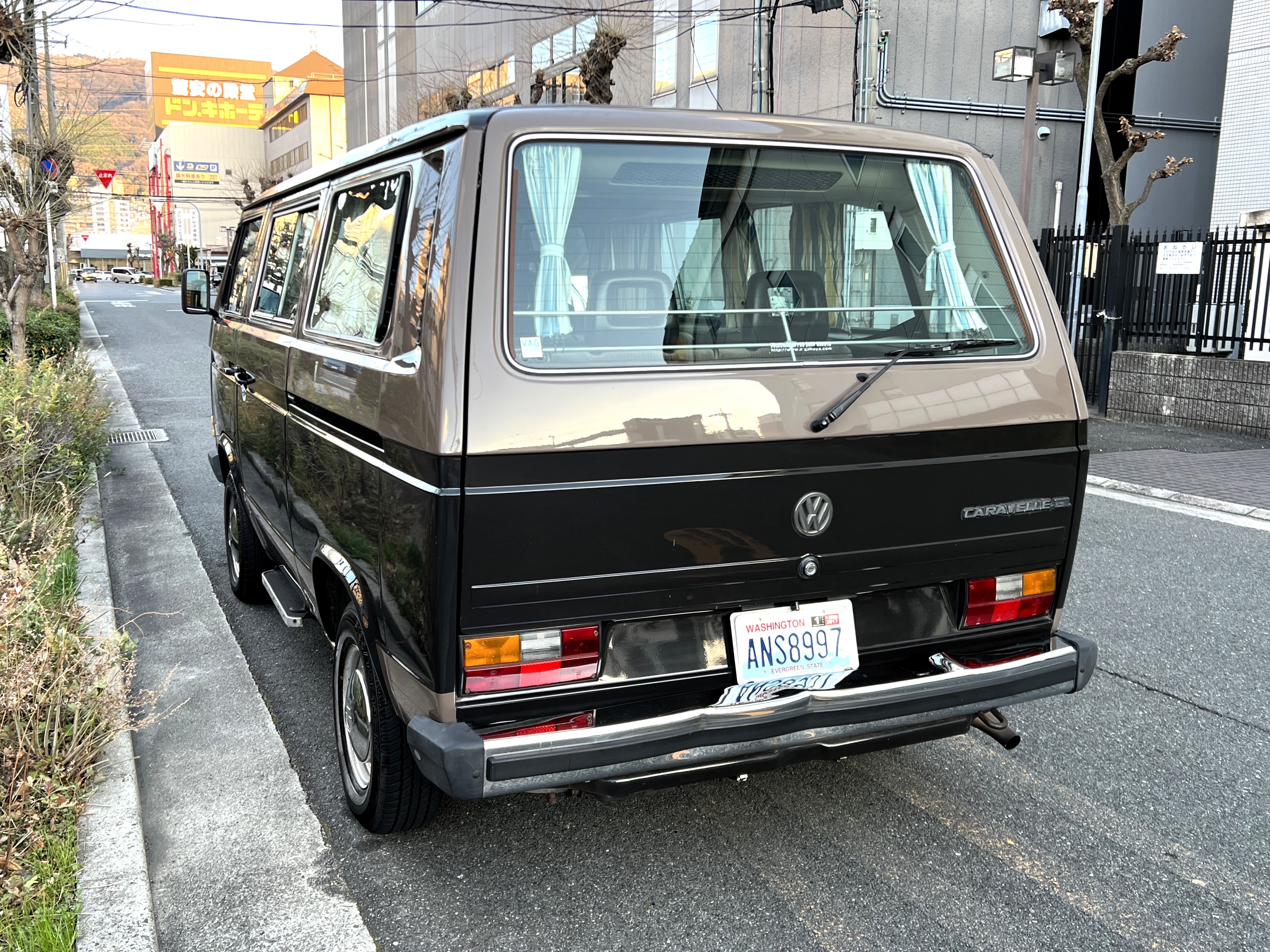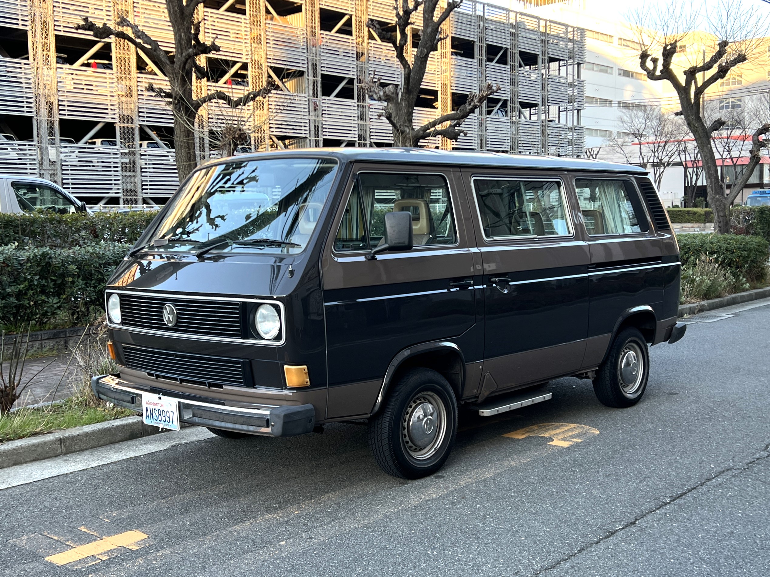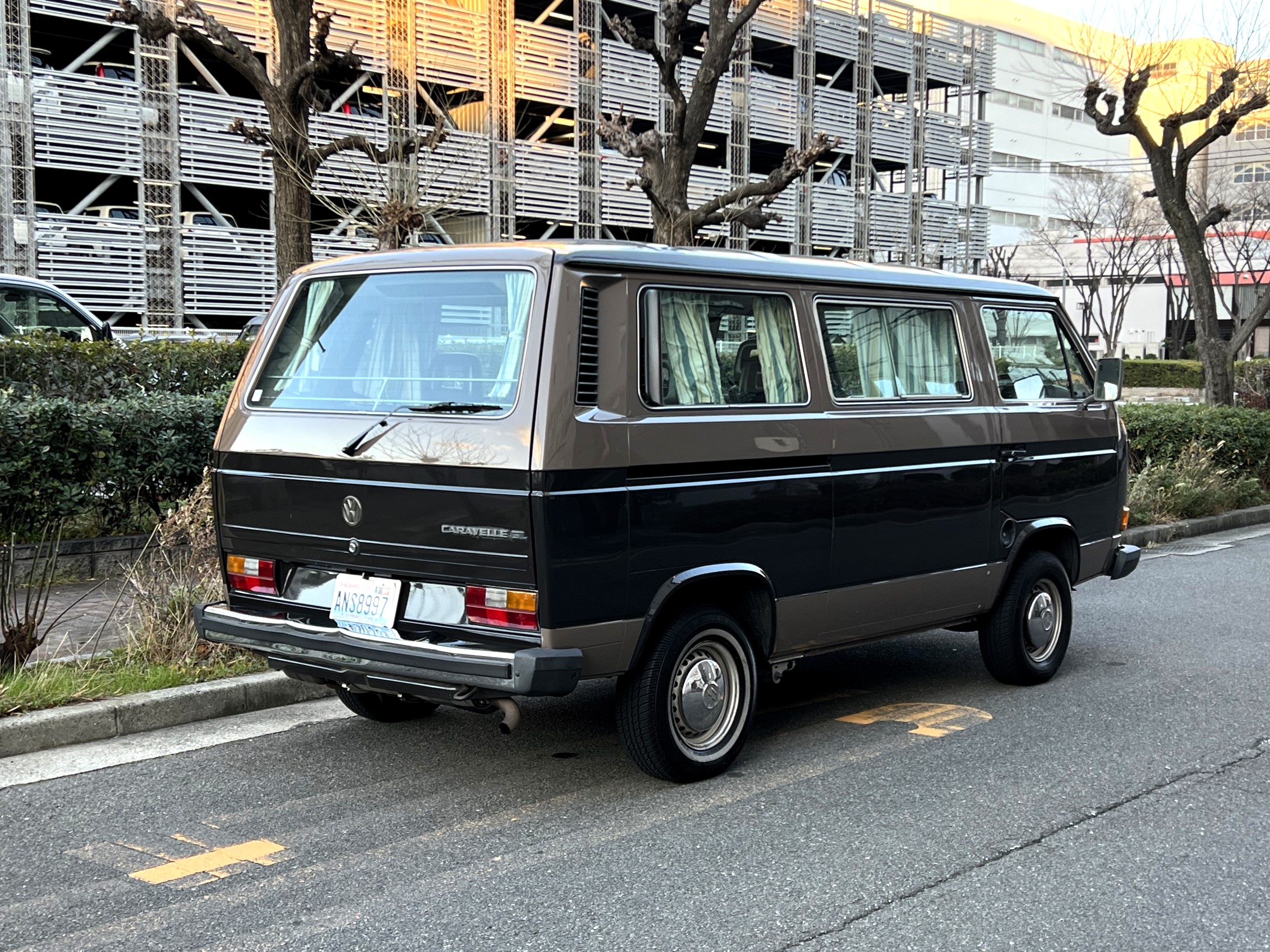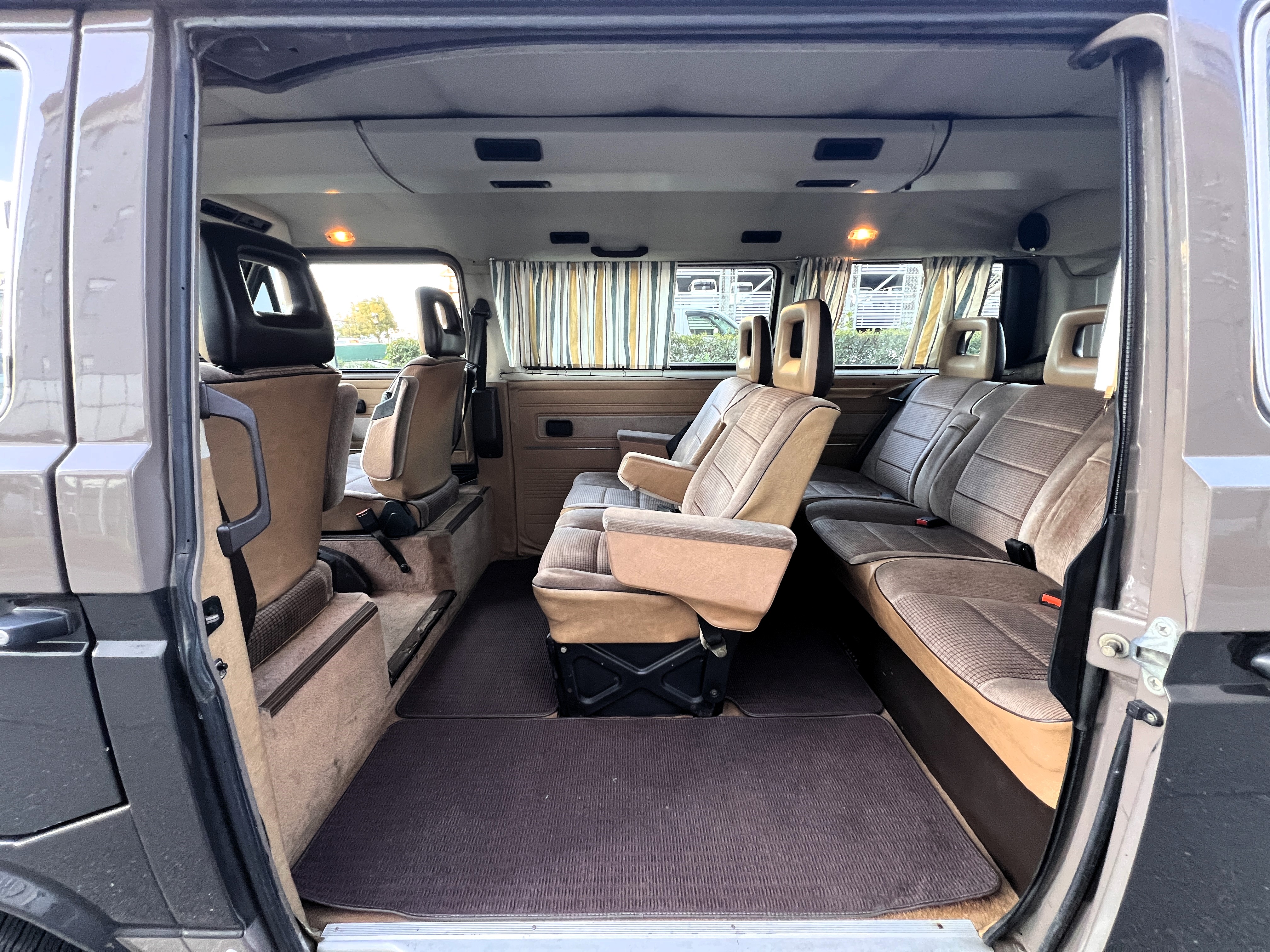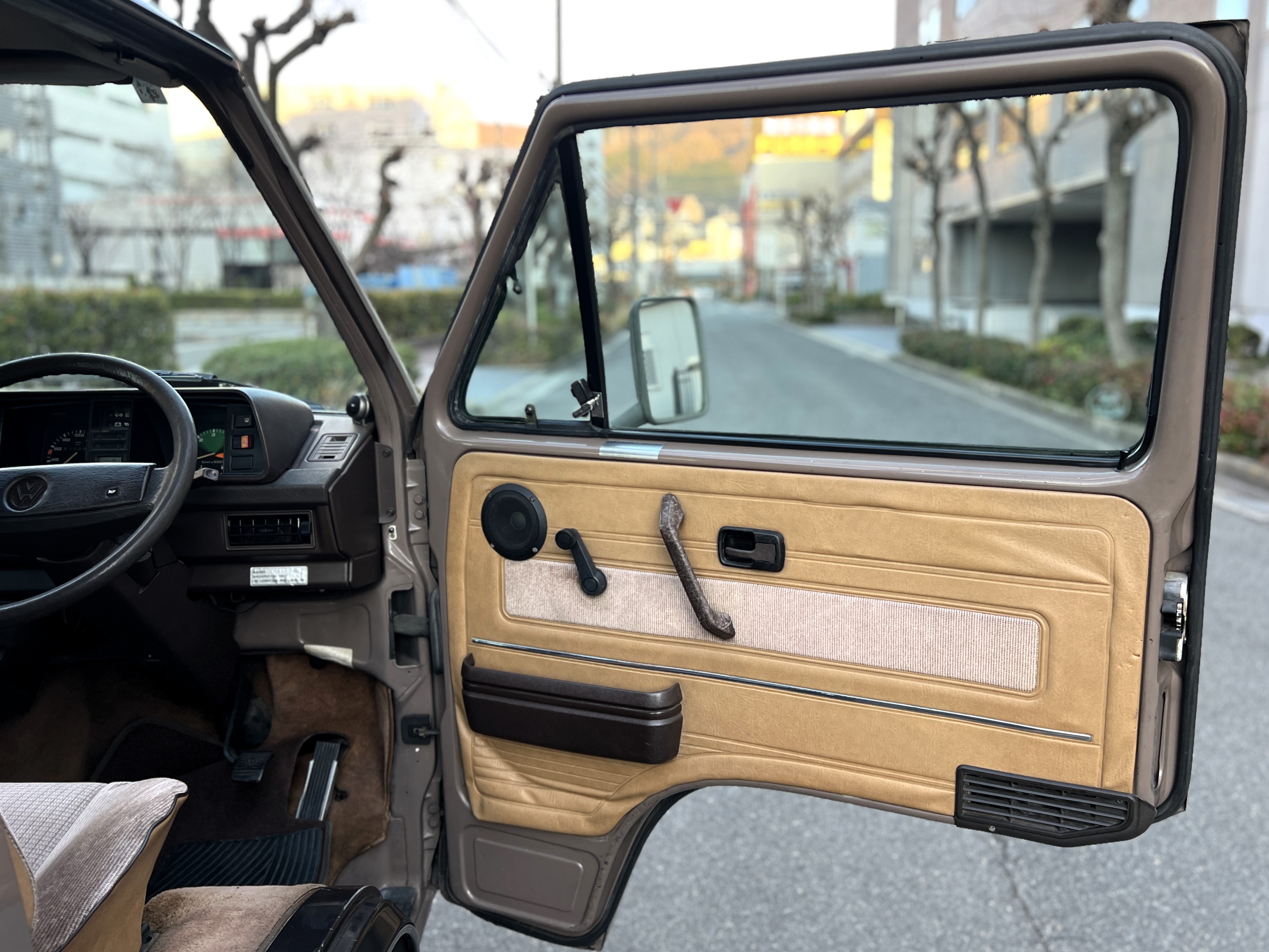 笑顔と家族愛に包まれた、ブラウンツートンT3カラベルの登場です♬ 今まで、これほどまでに家族の笑顔に包まれたT3があったでしょうか。お預かりの日は、家族団らんで記念撮影。お子さんたちは涙を浮かべながらのお見送り。その姿に、こちらまで胸が熱くなりました♫ 普段は5人家族で3列使ってフル乗車。決して広いとは言えない空間が、なぜかいつも以上に家族を近づけ、ただの移動手段ではなく、自然と団らんが生まれる場所になっていたそうです。軽井沢、八ヶ岳、箱根へのドライブ。アウトドアといえばグランピングが中心でしたが、そのどんなシーンにも、そばにはこのブラウンカラベルがあったそうです。現オーナーさまは、自動車好きなら誰もが知る某有名自動車雑誌の重鎮。職業柄、数えきれないほどの車種を知り尽くしている方が、4年前に選んだのがこのカラベル。それは、GAKUYAにてエンジンをフルオーバーホールした個体◎ 信頼できる状態であることも、大きな決め手だったそうです。仕事でも各地のサーキットや取材へと共に走り、まさに“公私ともに相棒”だったそうです👍 そして次なるステージへ。お仕事柄、さらなる経験を積むためにEVのID.BUZZへとお乗り換え。けれど、その選択もやはり“ワーゲンバスのパッケージが好き”という一本の軸の延長線上。形は変わっても、その想いはまったくブレておりません♫ 「このバスは、本当に楽しくて好き。ぜひその楽しさを味わってほしいです。」そんな温かいメッセージを残し、このT3は次のオーナーさまへとバトンを渡されます 👍さて、そのカラベルを見ていきましょう♫ まず触れておきたいのは、このブラウンという希少性👍 ディーラー車ではブルーとブラウンが存在しますが、体感で言えば8:2ほどでブラウンの方が少ない印象です。ブルーがどこかカジュアルで軽快なイメージだとすれば、ブラウンはやはり落ち着きと品のある、クラシックな佇まい、ですかね◎ エクステリアは基本的に純正然としたスタイルを保ち、そのクラシックさをしっかり演出しています。リアバンパーの凹みや細かなキズ、ルーフの色褪せなど、年式相応の“あるある”なヤレは見られますが、それも含めてT3らしい味わい◎ 全体としては艶もあり、むしろ良い雰囲気をまとっている個体と言えるかと思われます。そしてやはり、丸目2灯のキョトンとした愛嬌あるマスク♪ この顔立ちは、このブラウンという色味との相性が抜群で、派手ではないけれど、じわっと好きになる、そんな佇まいかと思います♬