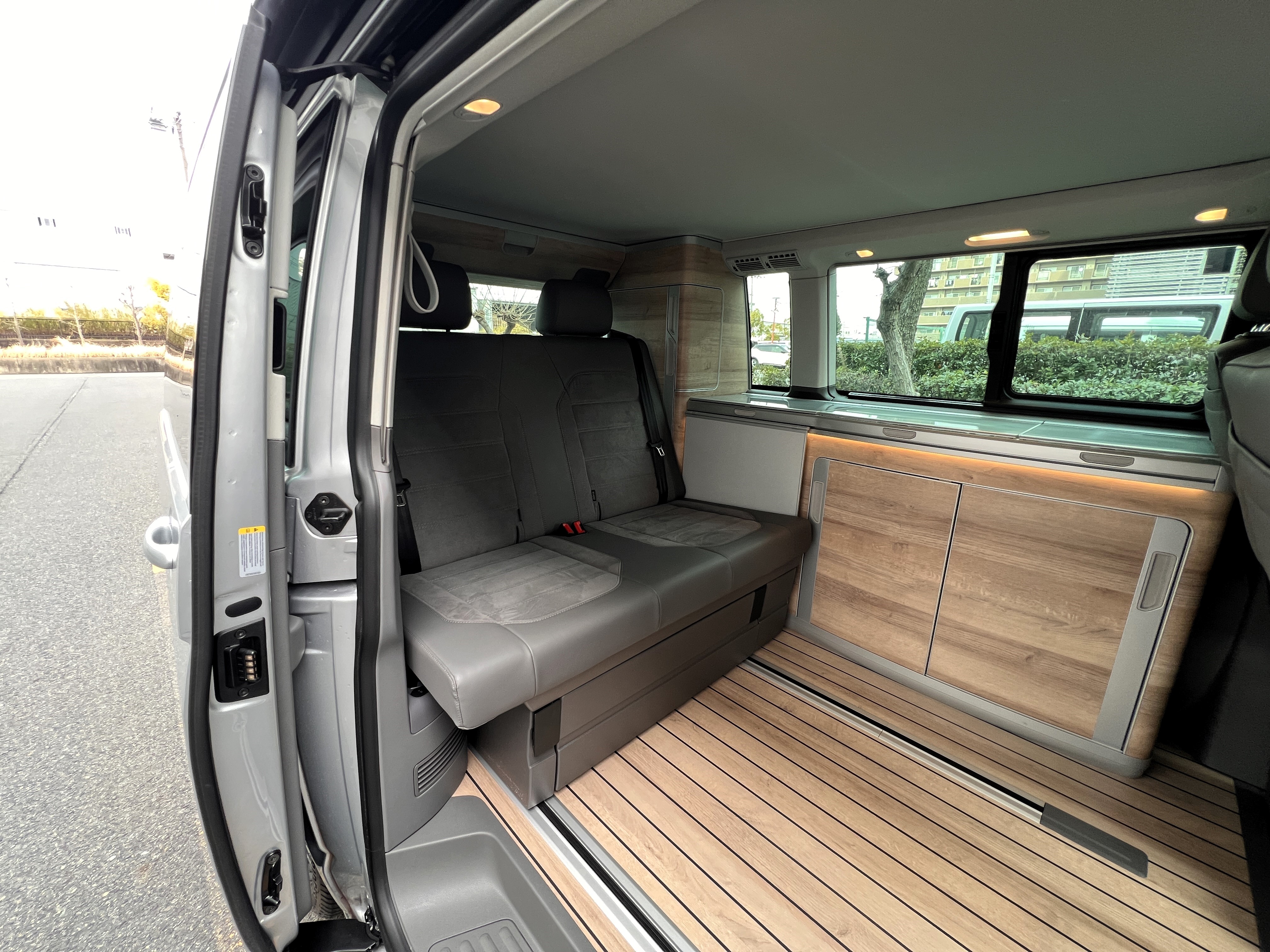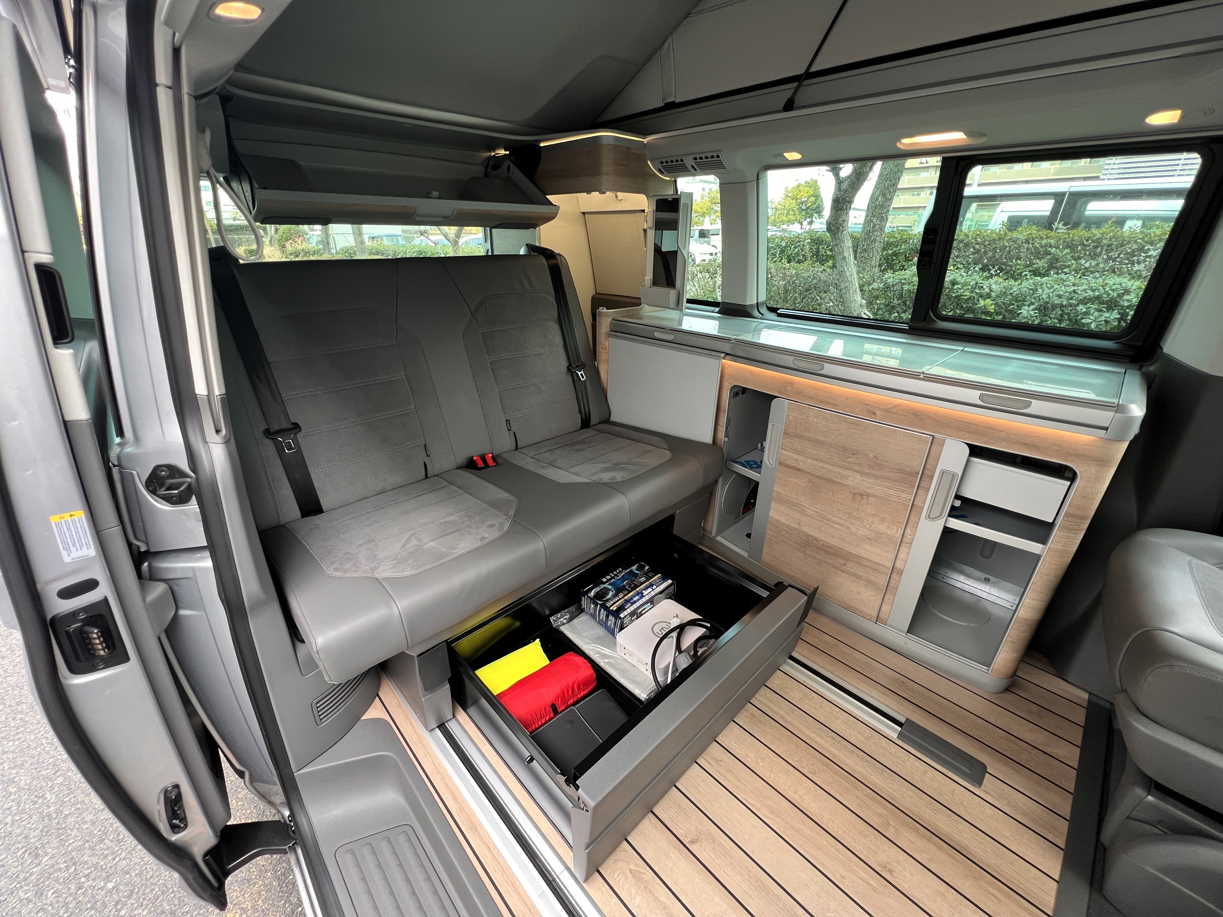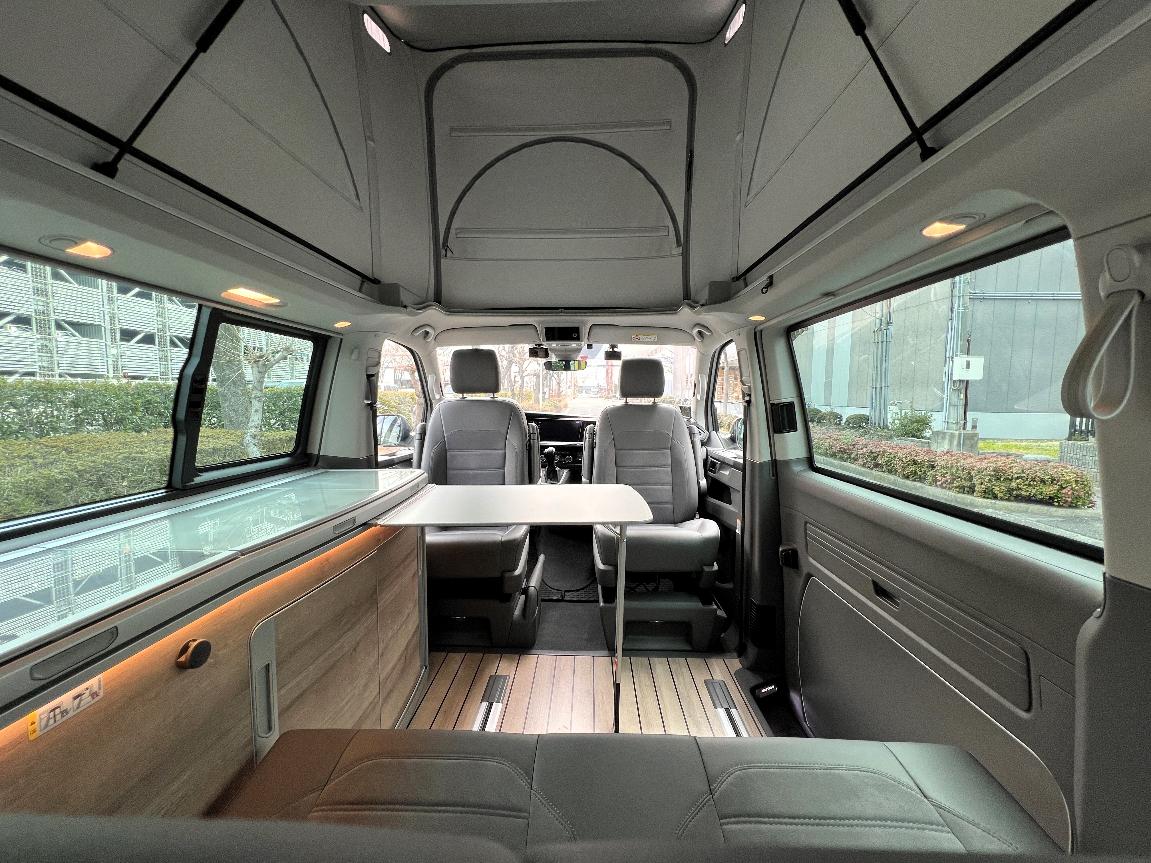 お次はインテリア♬ こちらも清潔感ばっちりのグッドコンディション◎ なんとリビング(後部座席部分)は完全土禁ルールで使用されていたとのこと。そりゃ綺麗なわけですねー。シンプルで上品な雰囲気の中に、9.2インチのタッチディスプレイモニターがドンと鎮座し、存在感も抜群です。シートはアルカンターラのハーフレザー仕様。ラグジュアリーなドライブ空間と、人生を楽しむキャンパーとしての実用性が見事に融合したインテリアになっております👍 もちろんカリフォルニアですので、フロントシートをくるっと回せばリビング空間に早変わり。キッチンで軽食を作り、冷蔵庫からはキンキンに冷えたビール。そして夜になれば、2段ベッドで最大4名の就寝も可能。まさに“超マルチ”なスーパービークルなのです♬ さらにウッド調フロアが全体の雰囲気をぐっと引き上げ、まるで走るログハウスのような空間を演出しております◎ 週末を好きな場所で過ごせば、日頃のストレスも吹き飛ぶこと間違いなしですね。