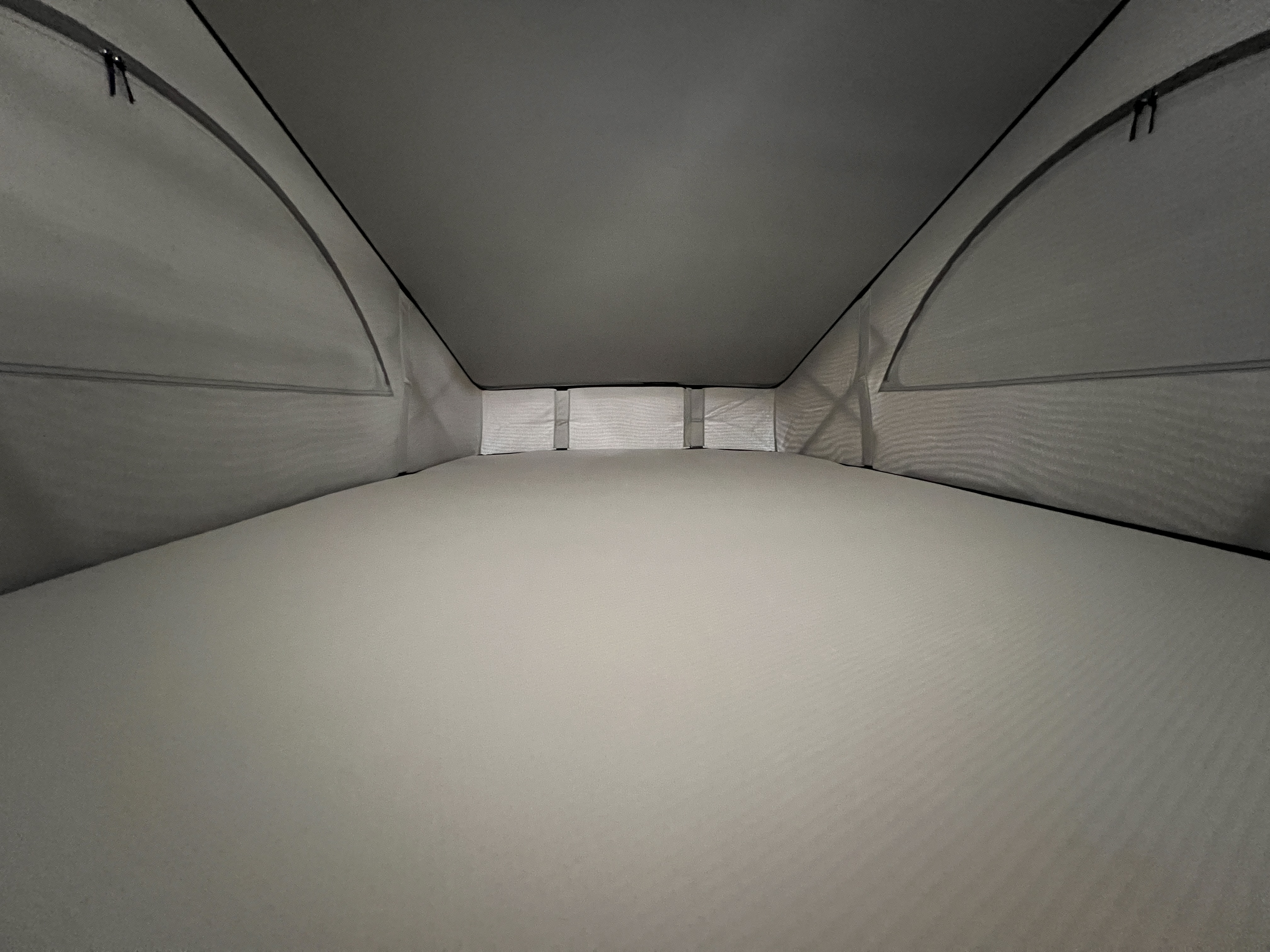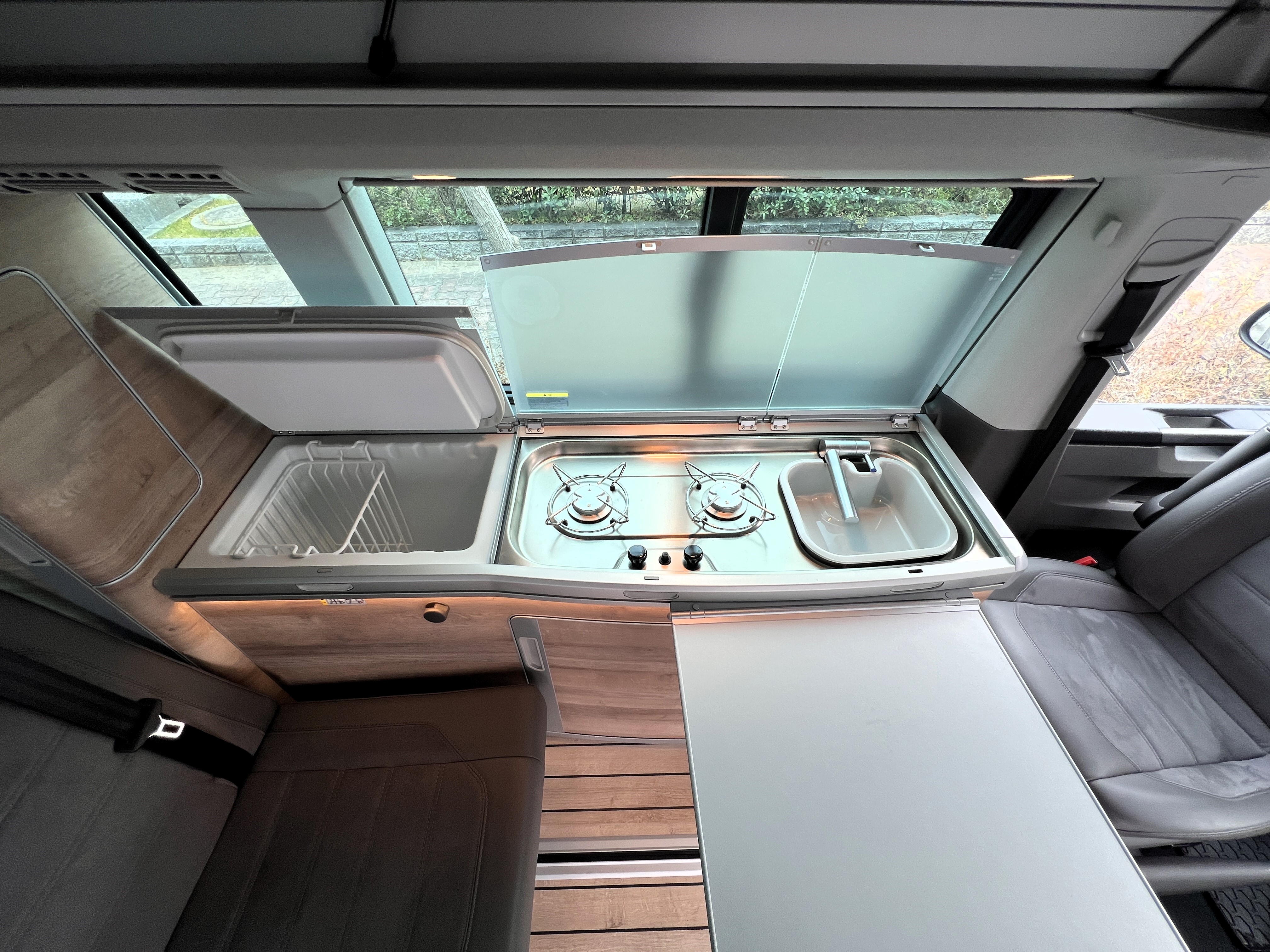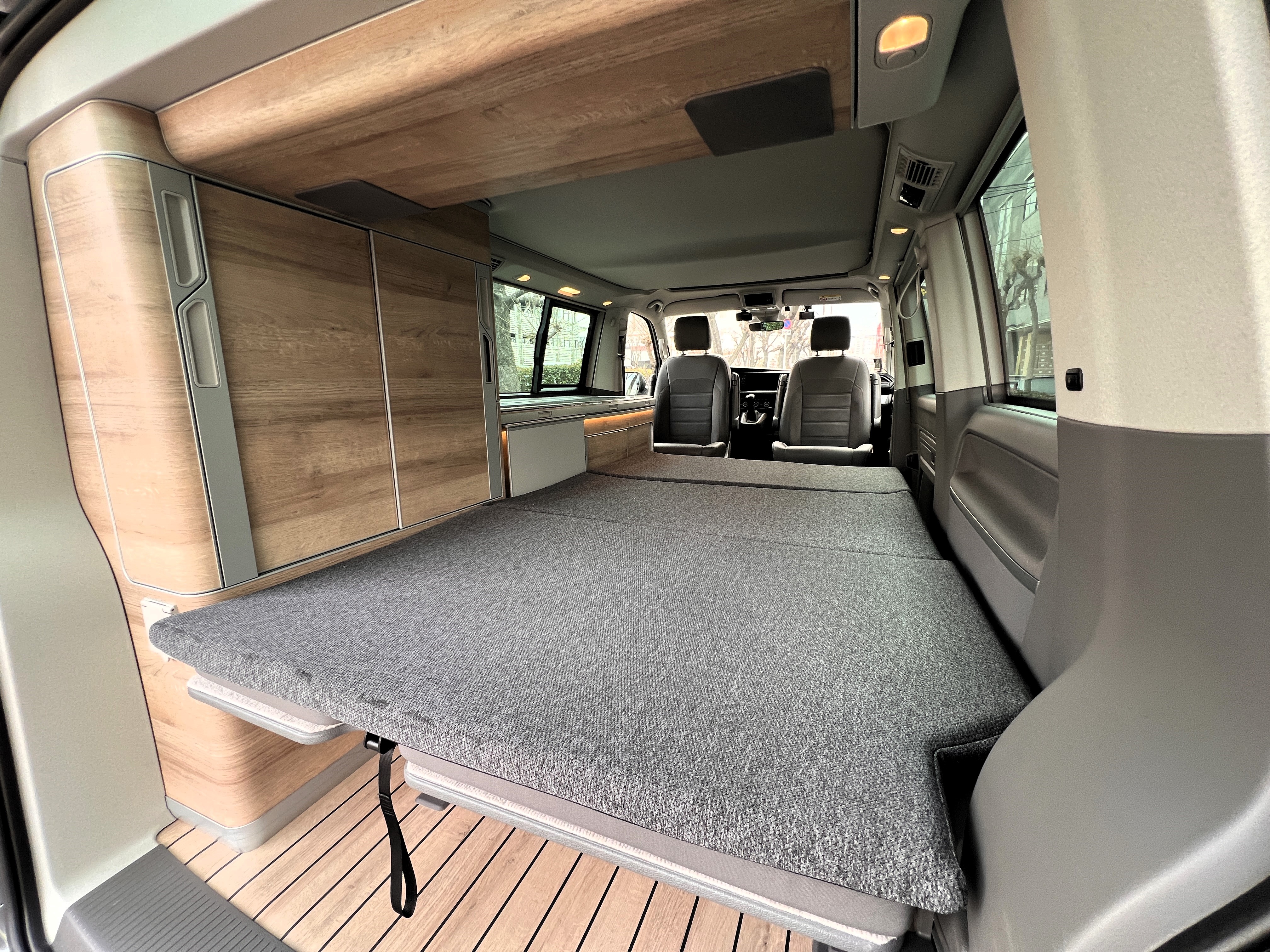 お次はインテリア♬ こちらも清潔感ばっちりのグッドコンディション◎ なんとリビング(後部座席部分)は完全土禁ルールで使用されていたとのこと。そりゃ綺麗なわけですねー。シンプルで上品な雰囲気の中に、9.2インチのタッチディスプレイモニターがドンと鎮座し、存在感も抜群です。シートはアルカンターラのハーフレザー仕様。ラグジュアリーなドライブ空間と、人生を楽しむキャンパーとしての実用性が見事に融合したインテリアになっております👍 もちろんカリフォルニアですので、フロントシートをくるっと回せばリビング空間に早変わり。キッチンで軽食を作り、冷蔵庫からはキンキンに冷えたビール。そして夜になれば、2段ベッドで最大4名の就寝も可能。まさに“超マルチ”なスーパービークルなのです♬ さらにウッド調フロアが全体の雰囲気をぐっと引き上げ、まるで走るログハウスのような空間を演出しております◎ 週末を好きな場所で過ごせば、日頃のストレスも吹き飛ぶこと間違いなしですね。