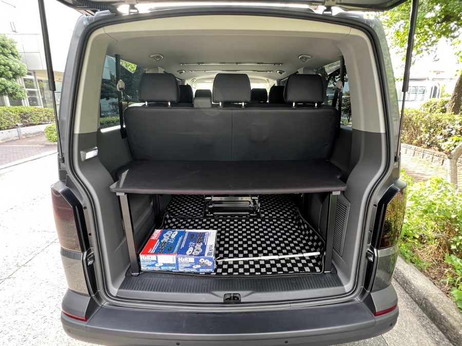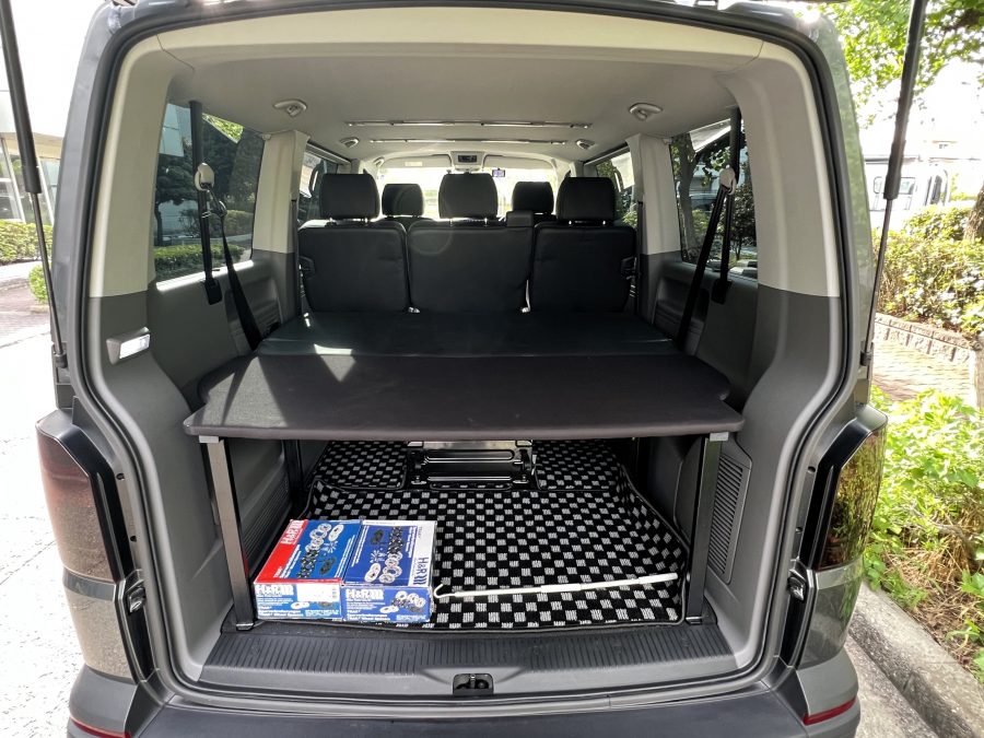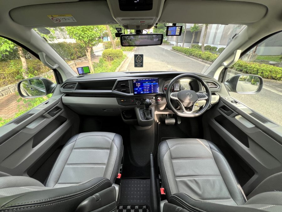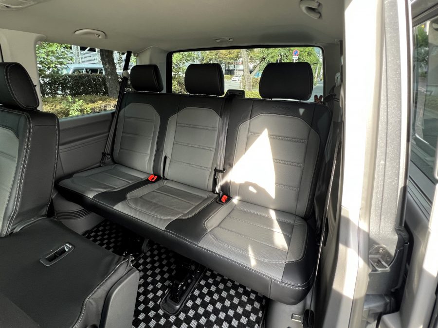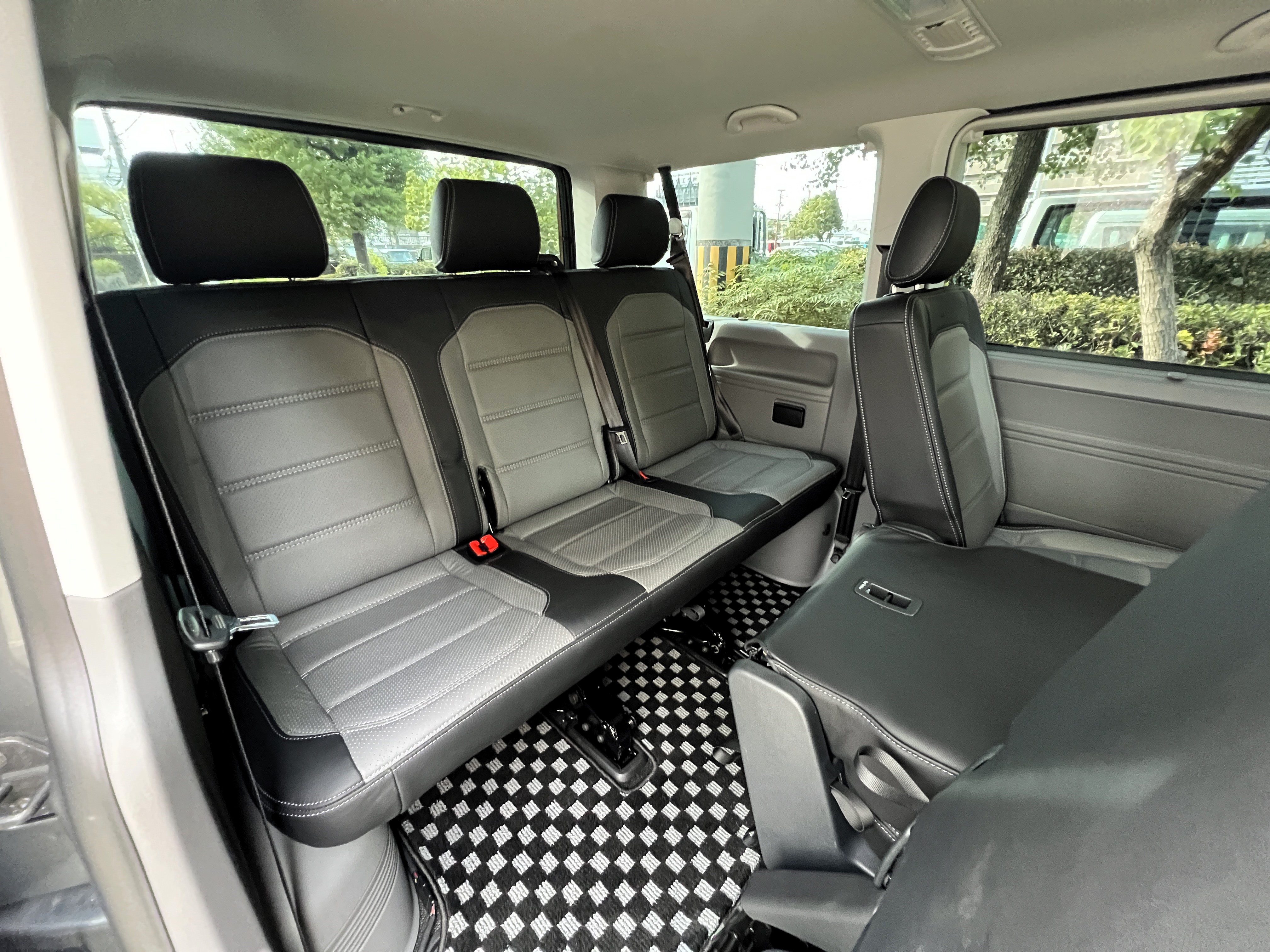 さてそのシャトルを見てまいりましょう♪ まず目に飛び込んでくるのは、そのカスタムセンスの高さ👍 このトランスポーターは、イギリス・マンチェスターから東へ約100キロの街、スカンソープに拠点を置くMA-SV社が手掛けた一台。MA-SVといえば、センスが光る大人気カスタム車両を数多く生み出す名門ブランド。そんな彼らが仕立てたトランスポーターを丸ごと輸入したのだから、カッコよくないわけがありません笑。その存在感と完成されたスタイル、そしてユーロカスタムのセンスはまさにピカイチ♫ 一目見ただけで“英国仕様”の香りが漂いますね笑。エクステリアは、細かな飛び石こそあるものの、全体的には非常に綺麗なコンディション。左右サイドリアパネルには、かつて装着されていたサッシュガードを取り外した跡が少し残っていますが、気になるレベルではありません。前述通りにカスタム内容は盛りだくさん👍 人気の樹脂バンパーやフェンダーアーチに加え、サイドアンダーのプロテクトバーやグリルに装着されたLAZER社製LEDフォグランプなど、まるで英国のトランスポーターミーティングに迷い込んだような雰囲気です♫ このオトナのユーロ感、国産ワンボックスにはなかなか真似できません。存在感も、スタイルも、センスも抜群。実車をぜひご一見頂ければ嬉しいです。そしてインテリア。走行距離がまだ浅いこともあり、室内は清潔感あふれるグッドコンディション♫ そのなかでまず目を引くのは、センス抜群のレザーシート。オリジナルから張り替えられたシートは、ブラック×グレーのコントラストが美しい仕上がりで、2-3-3の8人乗りレイアウトがしっかり活きています👍 セカンドシートはベンチスタイルながら、3つのセパレートタイプ。よく乗り降りする側やセンターのシートをあらかじめ外しておけば、車内に余裕の空間が生まれ、使い勝手がぐっと広がります。リアラゲッジにはオリジナル作成のボードを設置。サードシートと組み合わせれば、簡易ベッドにも早変わりしちゃいます👍 このあたりの工夫、“拘りのカスタムを楽しみつつ、休日には芝生に乗り入れてBBQやキャンプも楽しむ”――さすが本場イギリスのカスタムといったところです♫ そんな、いい意味で欲張りなイギリス人スタイルを感じさせる、魅力的な一台ですよー。そして最後は機関系。当然ながら、エンジンも絶好調で、DSGの変速もとてもスムーズ。実は、走行1,000kmにも満たない頃にアドブルーポンプの初期不良が発生したため、すでに交換済み。もちろんアップデート版のアドブルーポンプに換装されているので、その点も安心ですね👍