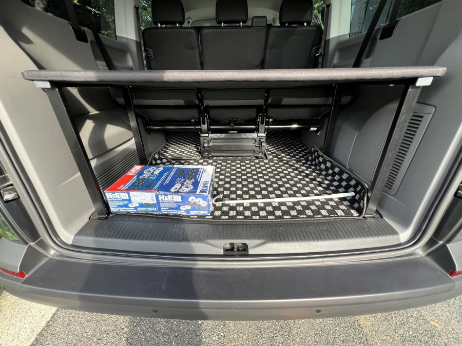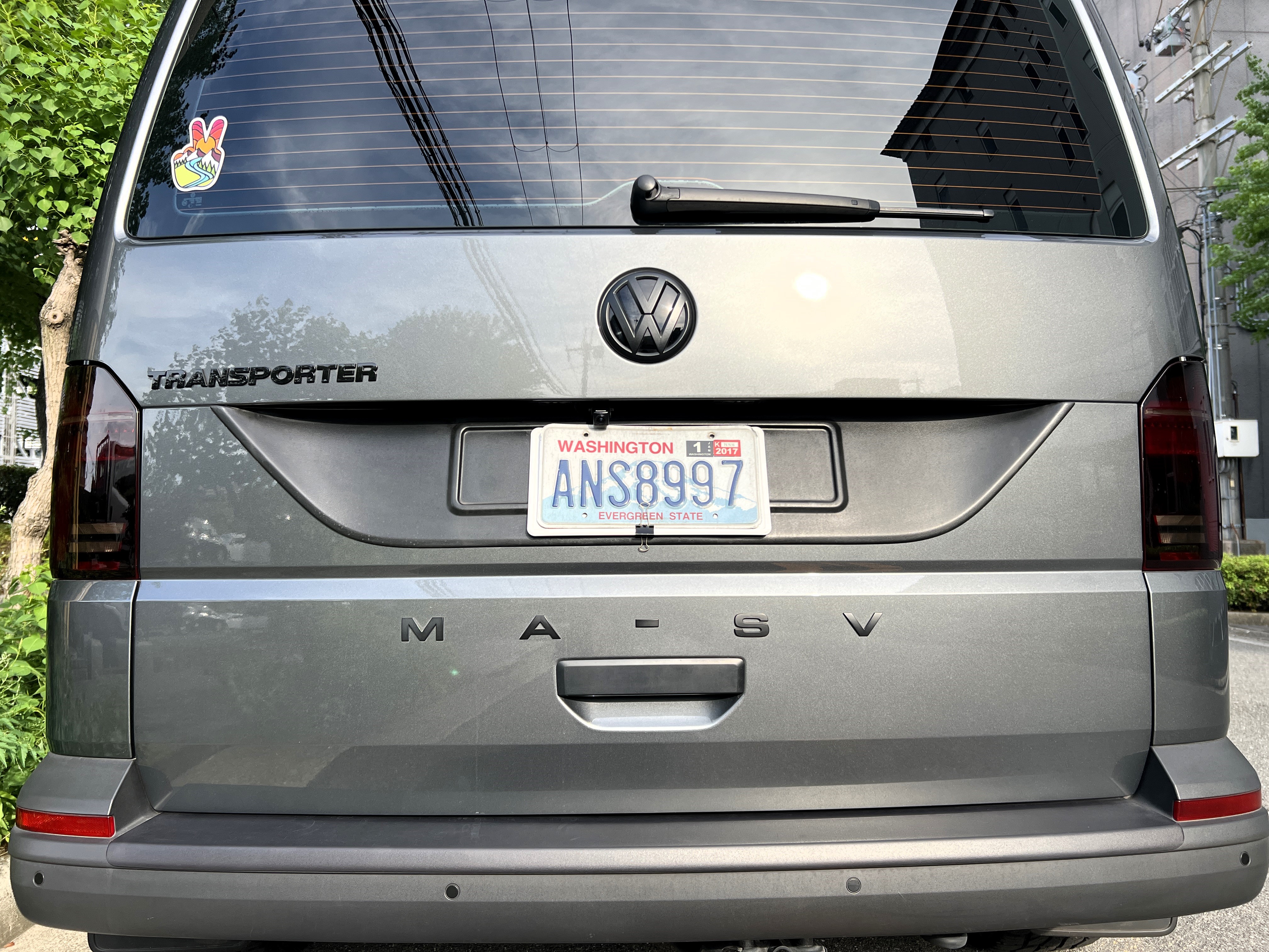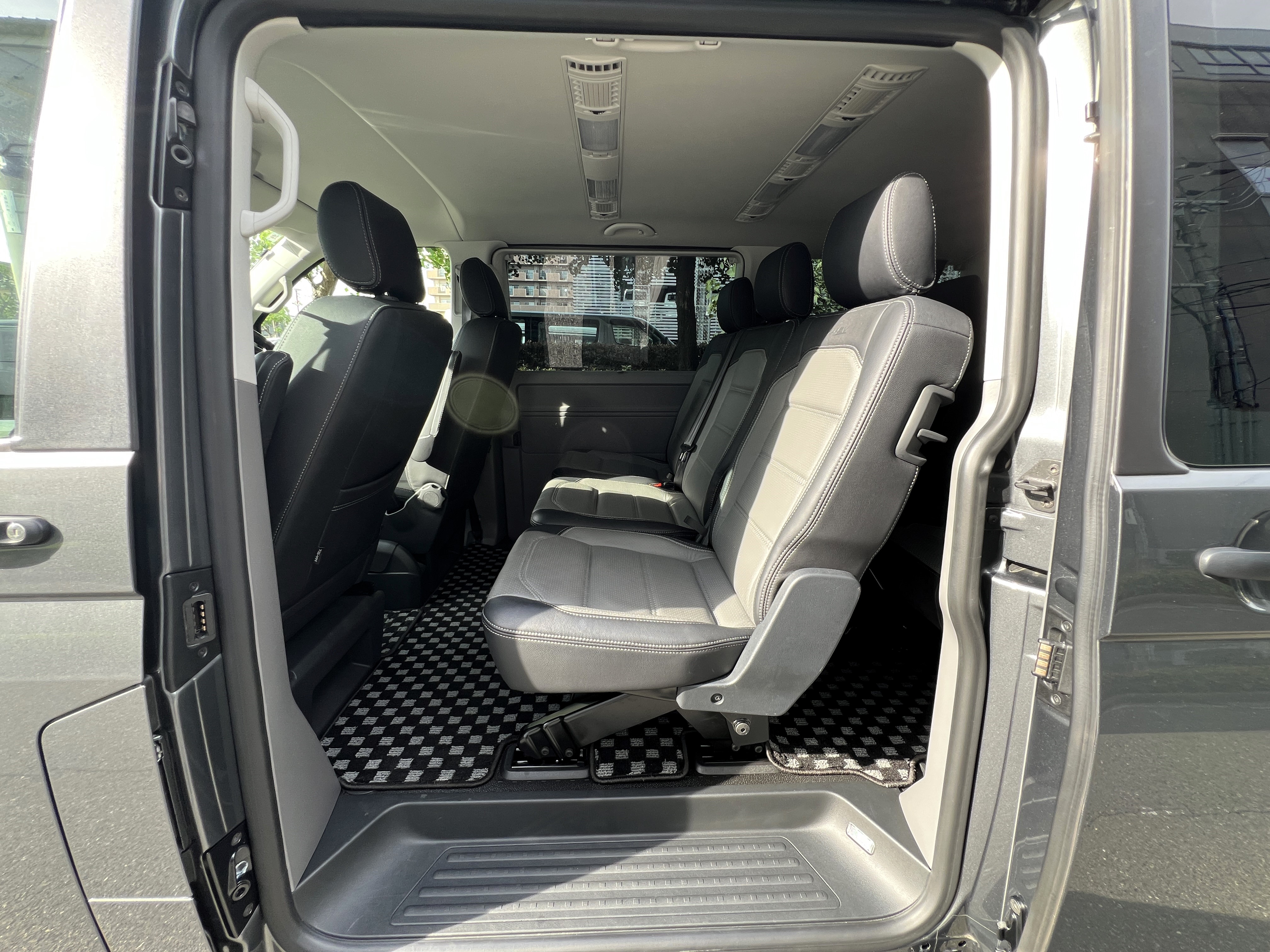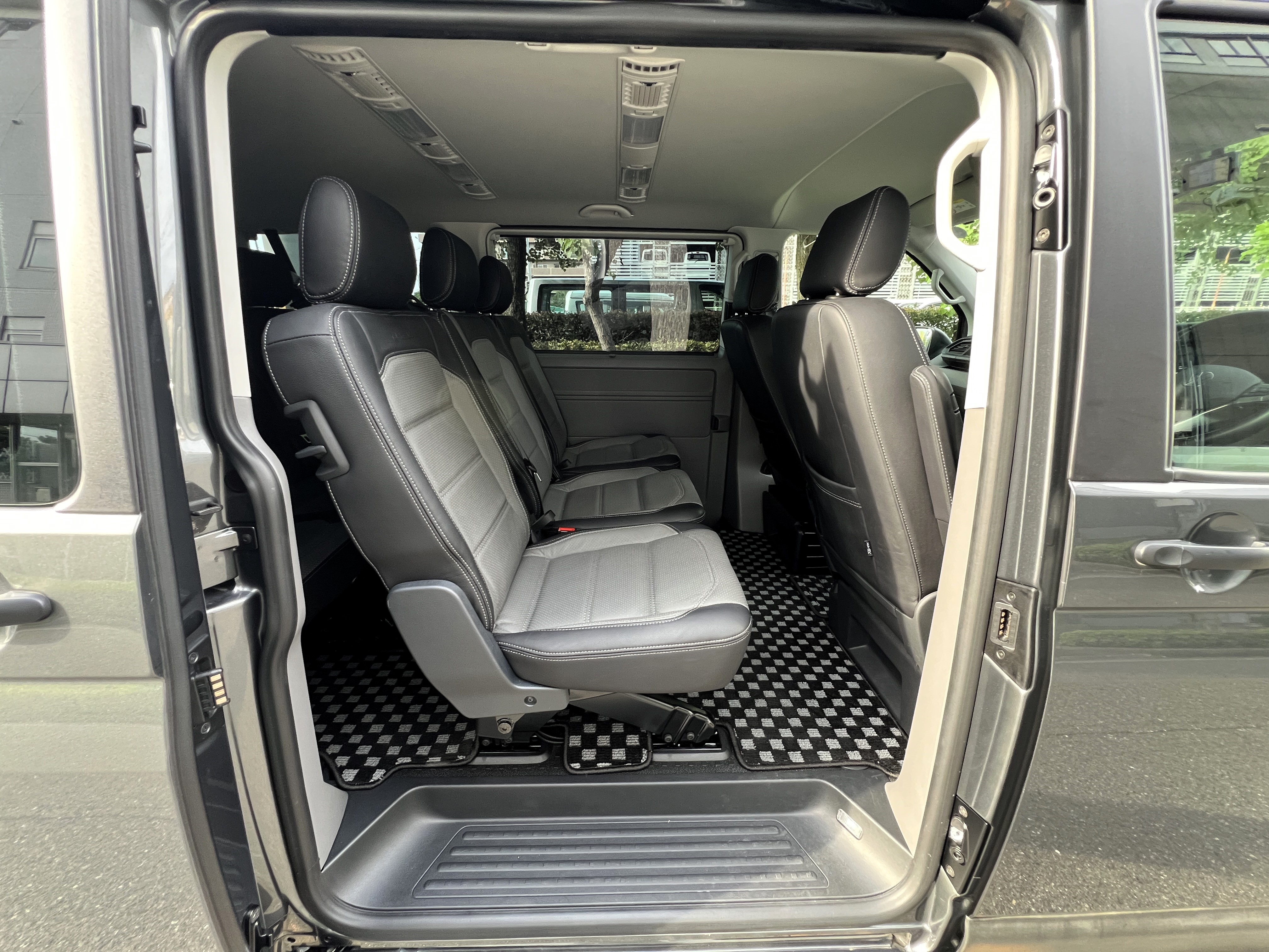 さてそのシャトルを見てまいりましょう♪ まず目に飛び込んでくるのは、そのカスタムセンスの高さ👍 このトランスポーターは、イギリス・マンチェスターから東へ約100キロの街、スカンソープに拠点を置くMA-SV社が手掛けた一台。MA-SVといえば、センスが光る大人気カスタム車両を数多く生み出す名門ブランド。そんな彼らが仕立てたトランスポーターを丸ごと輸入したのだから、カッコよくないわけがありません笑。その存在感と完成されたスタイル、そしてユーロカスタムのセンスはまさにピカイチ♫ 一目見ただけで“英国仕様”の香りが漂いますね笑。エクステリアは、細かな飛び石こそあるものの、全体的には非常に綺麗なコンディション。左右サイドリアパネルには、かつて装着されていたサッシュガードを取り外した跡が少し残っていますが、気になるレベルではありません。前述通りにカスタム内容は盛りだくさん👍 人気の樹脂バンパーやフェンダーアーチに加え、サイドアンダーのプロテクトバーやグリルに装着されたLAZER社製LEDフォグランプなど、まるで英国のトランスポーターミーティングに迷い込んだような雰囲気です♫ このオトナのユーロ感、国産ワンボックスにはなかなか真似できません。存在感も、スタイルも、センスも抜群。実車をぜひご一見頂ければ嬉しいです。そしてインテリア。走行距離がまだ浅いこともあり、室内は清潔感あふれるグッドコンディション♫ そのなかでまず目を引くのは、センス抜群のレザーシート。オリジナルから張り替えられたシートは、ブラック×グレーのコントラストが美しい仕上がりで、2-3-3の8人乗りレイアウトがしっかり活きています👍 セカンドシートはベンチスタイルながら、3つのセパレートタイプ。よく乗り降りする側やセンターのシートをあらかじめ外しておけば、車内に余裕の空間が生まれ、使い勝手がぐっと広がります。リアラゲッジにはオリジナル作成のボードを設置。サードシートと組み合わせれば、簡易ベッドにも早変わりしちゃいます👍 このあたりの工夫、“拘りのカスタムを楽しみつつ、休日には芝生に乗り入れてBBQやキャンプも楽しむ”――さすが本場イギリスのカスタムといったところです♫ そんな、いい意味で欲張りなイギリス人スタイルを感じさせる、魅力的な一台ですよー。そして最後は機関系。当然ながら、エンジンも絶好調で、DSGの変速もとてもスムーズ。実は、走行1,000kmにも満たない頃にアドブルーポンプの初期不良が発生したため、すでに交換済み。もちろんアップデート版のアドブルーポンプに換装されているので、その点も安心ですね👍