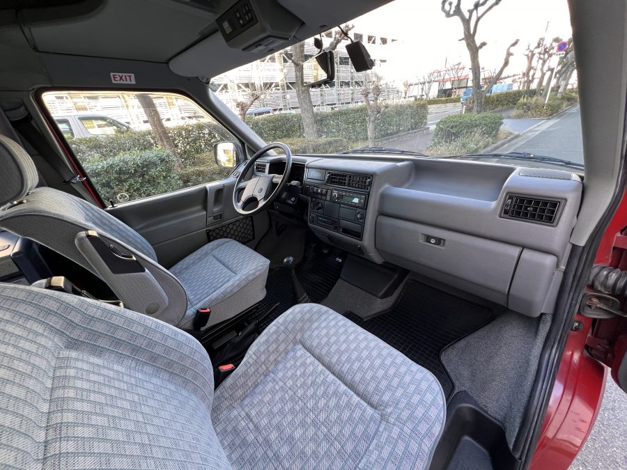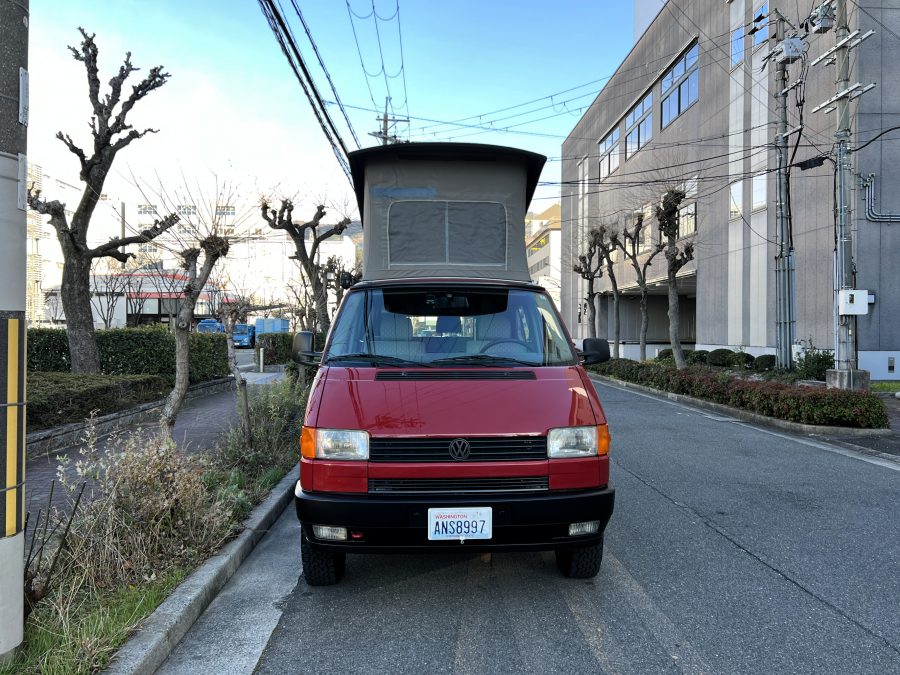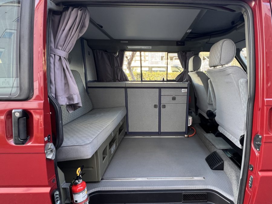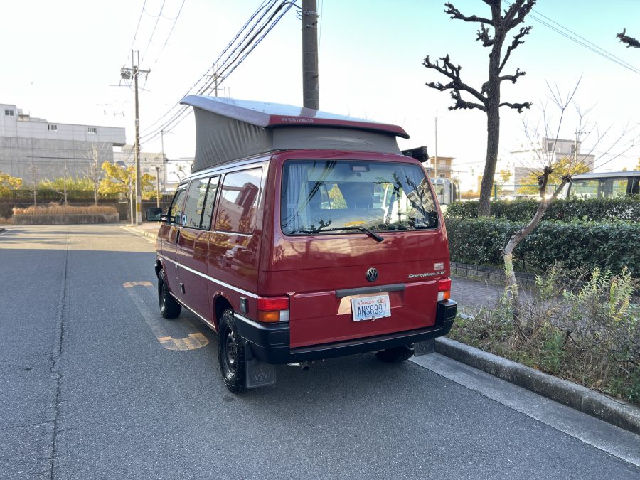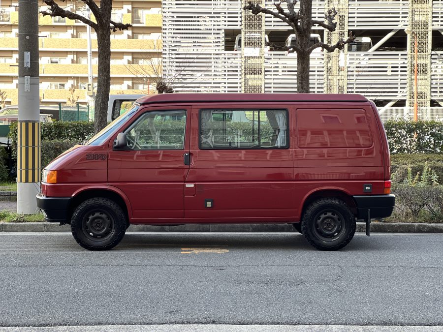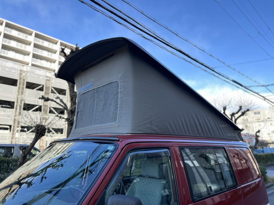 さて、そのWESTYを見ていきましょう♬ まず何といっても、このWESTYの魅力は5速マニュアル車👍 T4は比較的ATのトラブルに悩まされることがありますので、マニュアルという選択は、それだけで大きなメリット◎ そもそもT4はエンジンオーバーホールなんてほとんどありませんので、ある意味、マニュアルとの組み合わせが実は無敵で最強なのかも?!と思ってしまう一台です笑。ボディカラーは、深みと艶のあるボルドーレッド系。そこに合わせた前後の樹脂バンパー、さりげないリフトアップ、スチールホイール&テレーンタイヤの組み合わせで、フィールドが似合う、抜群の“旅バン”スタイルが完成しています👍 リアのマッドフラップがまたいい味出してるんですよね。このあたりのこだわりは、やっぱり好きな人が乗ってた感が出てますね◎ ちなみにこのWESTY、本来は北米仕様のため、フロントバンパーが少し長いロングバージョンなのですが、このT4は欧州仕様のショートタイプに換装済み。つまり、ルックス的には“T4カリフォルニアコーチ仕様”になっているんです◎ ポップアップルーフの前面には一部補修跡があります、使用には問題なしですが気になる方は張り替えなどの対応もご相談OKです◎ そしてサイドオーニングには、ライノラック製のオーニングをチョイス。控えめなのに、センスが光ってますね👍