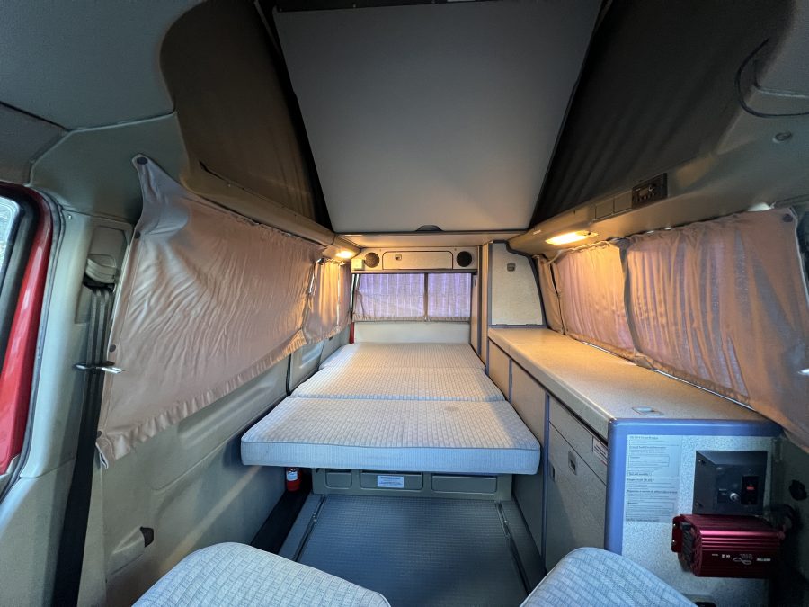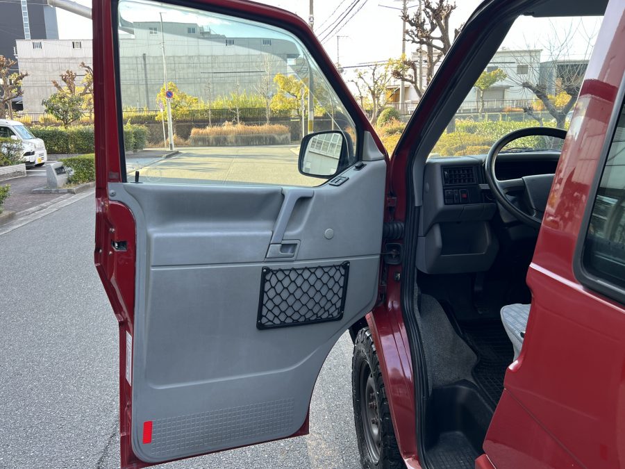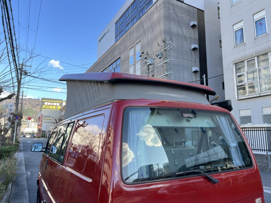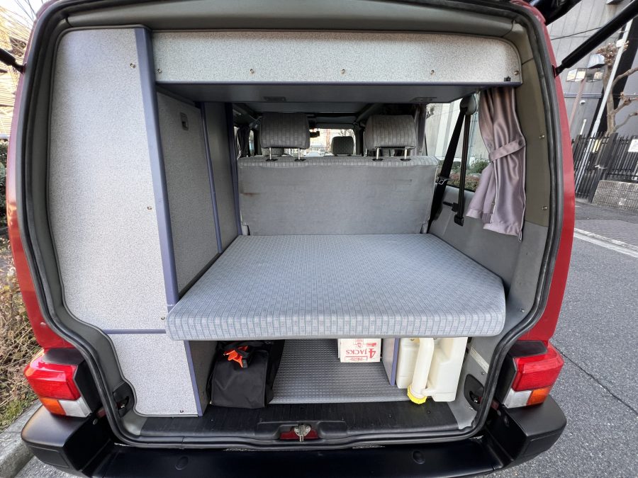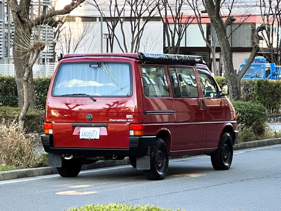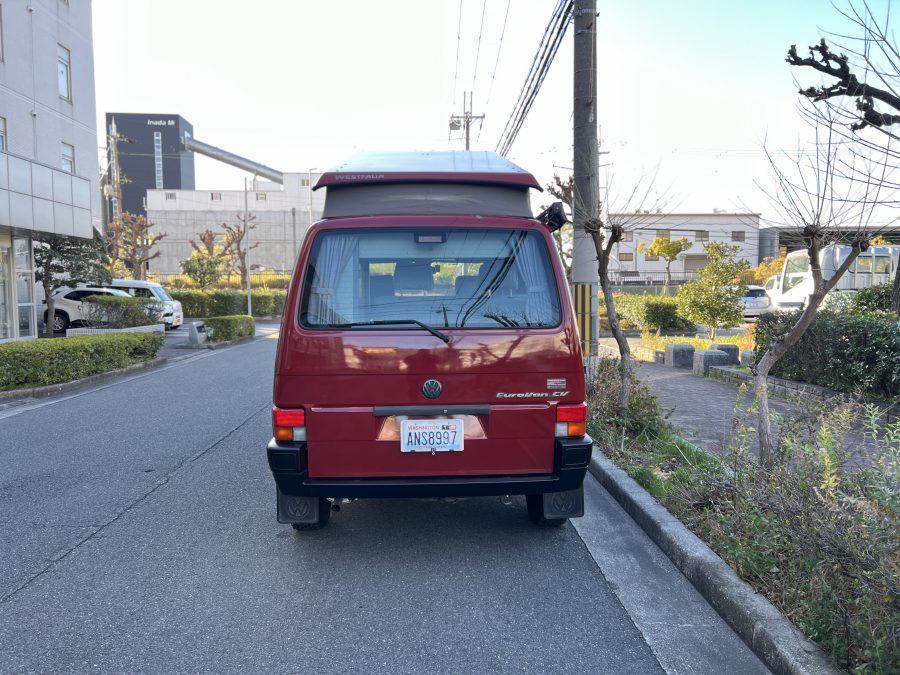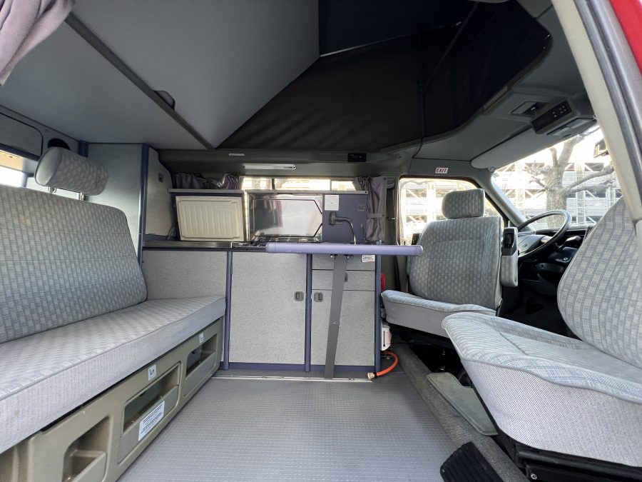 さて、そのWESTYを見ていきましょう♬ まず何といっても、このWESTYの魅力は5速マニュアル車👍 T4は比較的ATのトラブルに悩まされることがありますので、マニュアルという選択は、それだけで大きなメリット◎ そもそもT4はエンジンオーバーホールなんてほとんどありませんので、ある意味、マニュアルとの組み合わせが実は無敵で最強なのかも?!と思ってしまう一台です笑。ボディカラーは、深みと艶のあるボルドーレッド系。そこに合わせた前後の樹脂バンパー、さりげないリフトアップ、スチールホイール&テレーンタイヤの組み合わせで、フィールドが似合う、抜群の“旅バン”スタイルが完成しています👍 リアのマッドフラップがまたいい味出してるんですよね。このあたりのこだわりは、やっぱり好きな人が乗ってた感が出てますね◎ ちなみにこのWESTY、本来は北米仕様のため、フロントバンパーが少し長いロングバージョンなのですが、このT4は欧州仕様のショートタイプに換装済み。つまり、ルックス的には“T4カリフォルニアコーチ仕様”になっているんです◎ ポップアップルーフの前面には一部補修跡があります、使用には問題なしですが気になる方は張り替えなどの対応もご相談OKです◎ そしてサイドオーニングには、ライノラック製のオーニングをチョイス。控えめなのに、センスが光ってますね👍