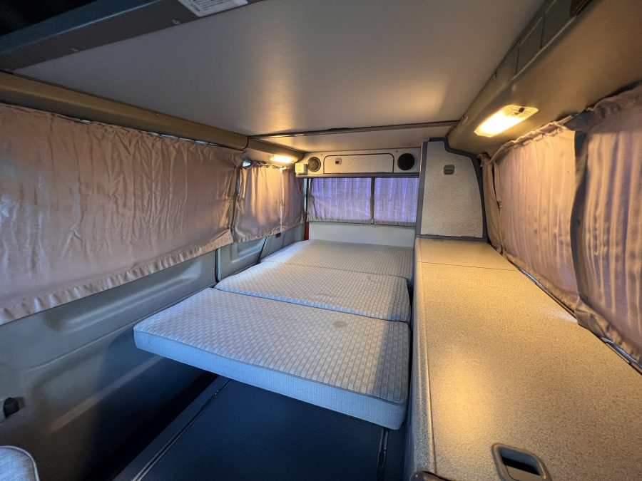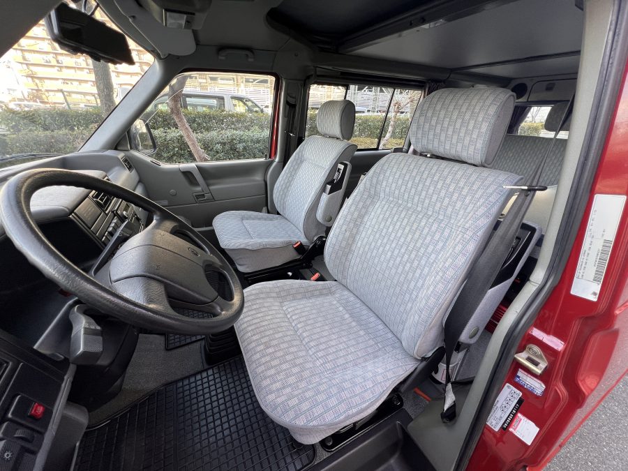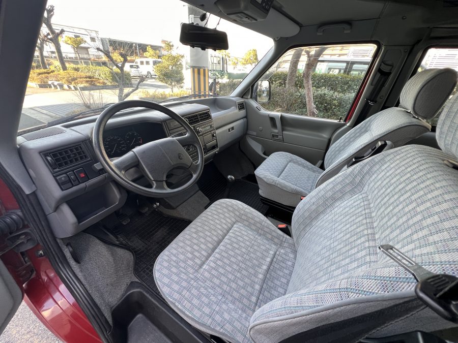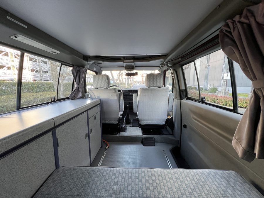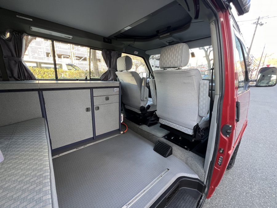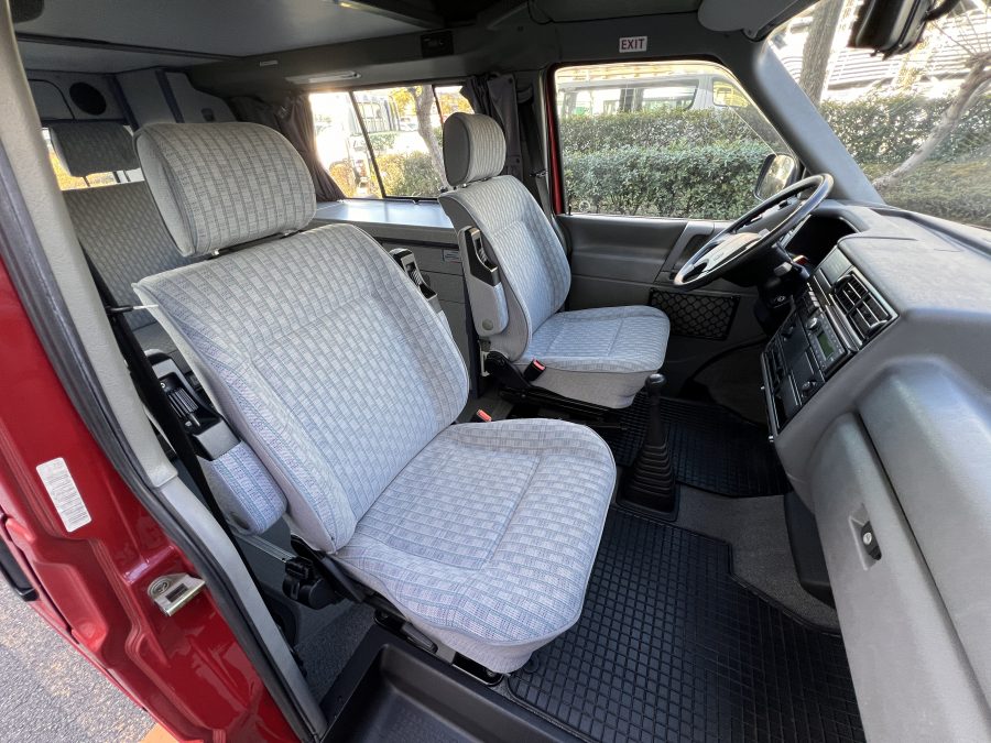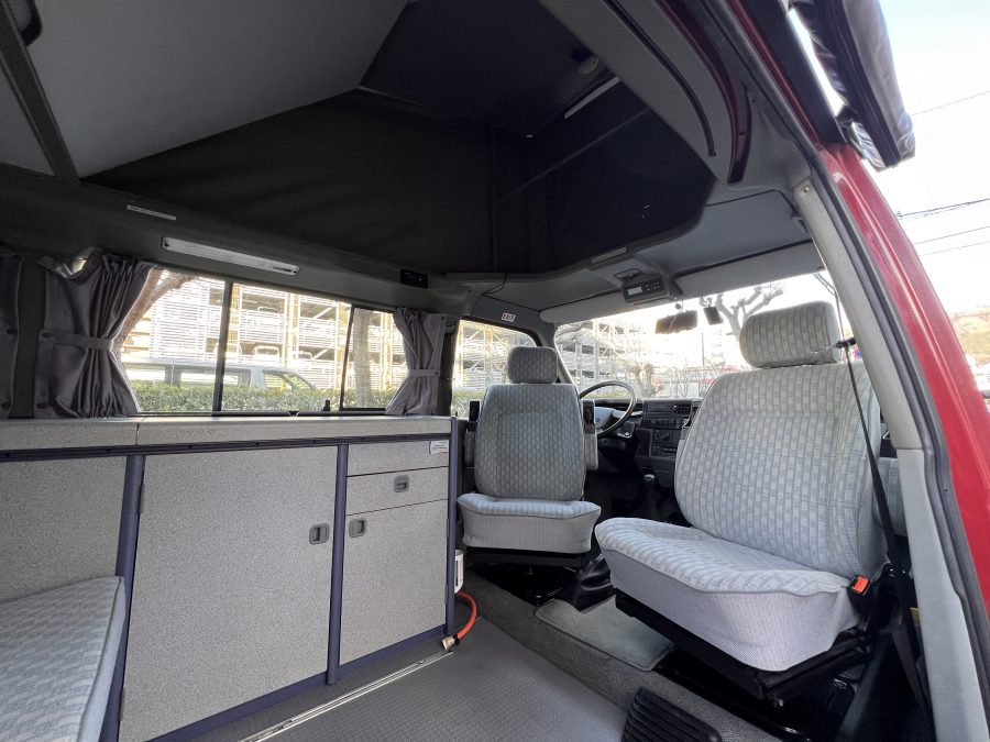 お次はインテリア♬ 年式を考えると、かなり清潔感のある車内です。リアシートにうっすらとしたシミこそありますが、全体的にはとてもきれいで気持ちの良い空間です◎ 装備面も魅力たっぷり。シンク・コンロ・冷蔵庫が完備されており、さらに、冬場にも心強いベバスト製のFFヒーターも装備済みで、これはもうテンションMAX状態です👍 二口コンロの左側のノブがガスを保持できないようで、必要であれば部品交換のご相談も可能ですが、最近はコンパクトなカセットコンロなど調理グッズも充実していますので、あえて“アウトドアキッチン”を楽しむスタイルも◎ ちなみに、このコンロはカセットガス仕様に変更済みなので、手軽に・安全に使用できるのも嬉しいポイント。また、小型インバーターも装備されており、スマホやPCの充電などにも便利。ノマドワークにもぴったりです♫ フロントシートは回転式。リアシート座面下に収納されている純正テーブルを設置すれば、そこはもう完全に“動くリビング”👍 お気に入りの川辺や森の中、旅先の静かな駐車場、どこに停めても、その瞬間に“自分だけの場所”が。仕事にも、ひとり時間にも、これ以上ないシチュエーションが完成しちゃいます◎