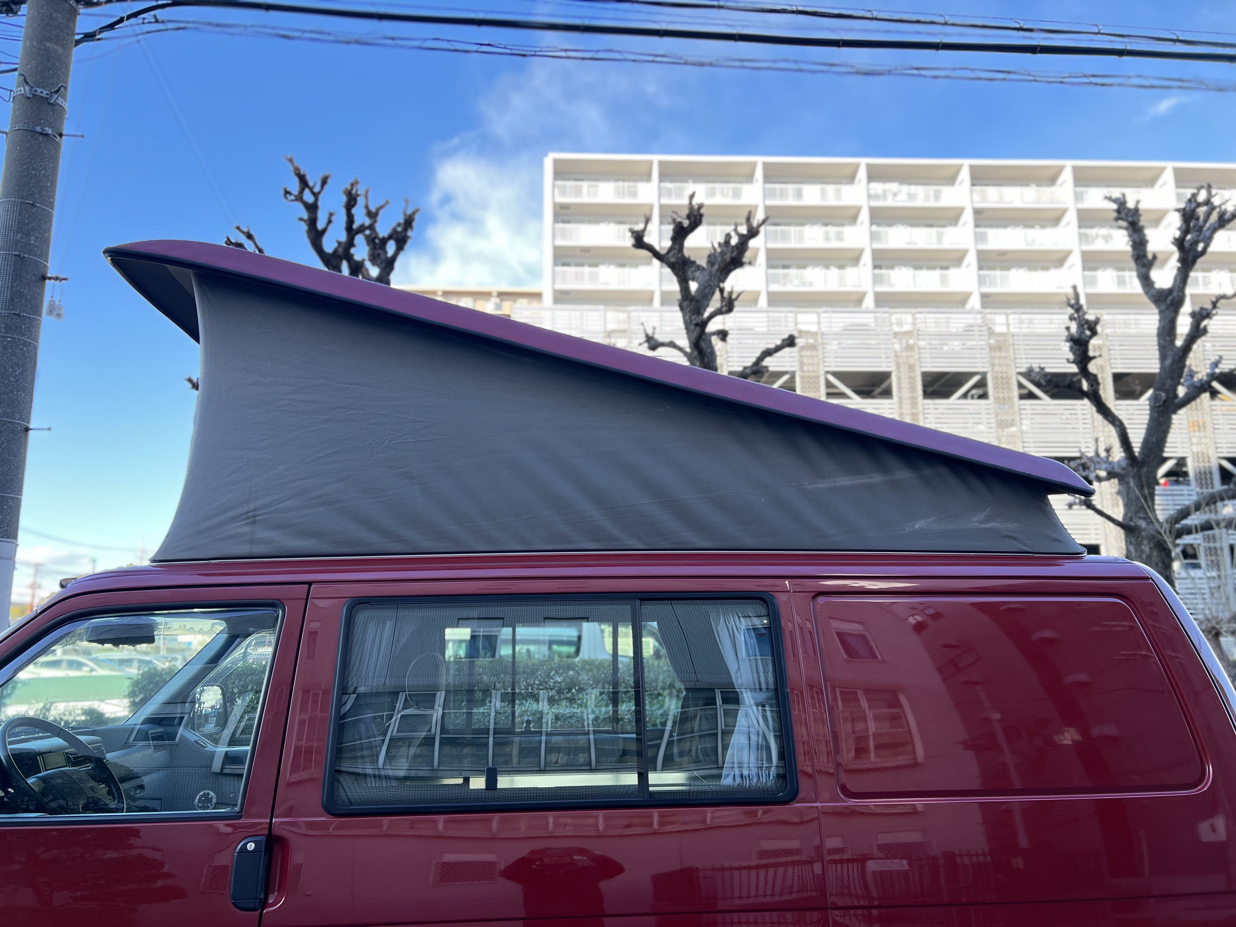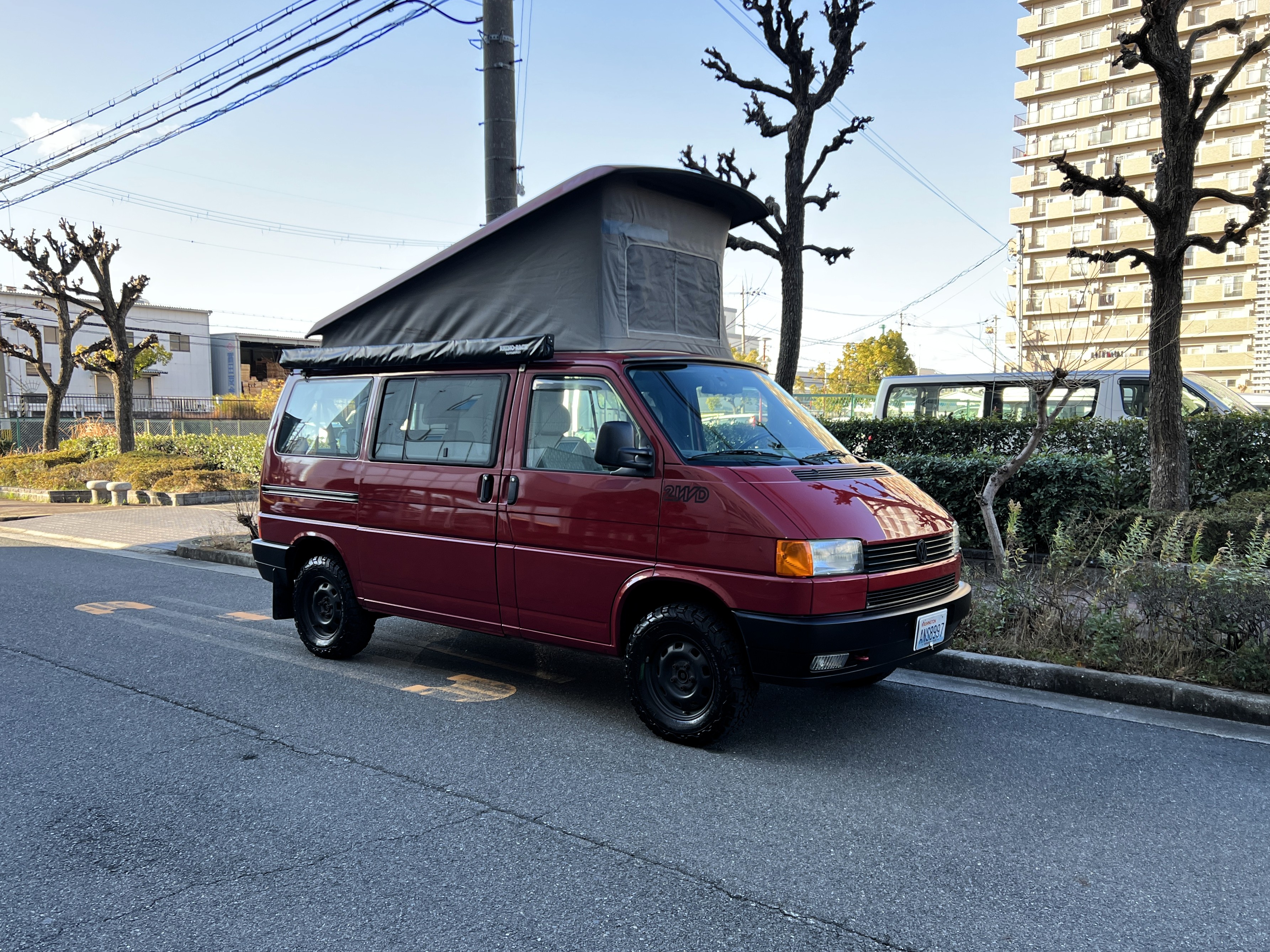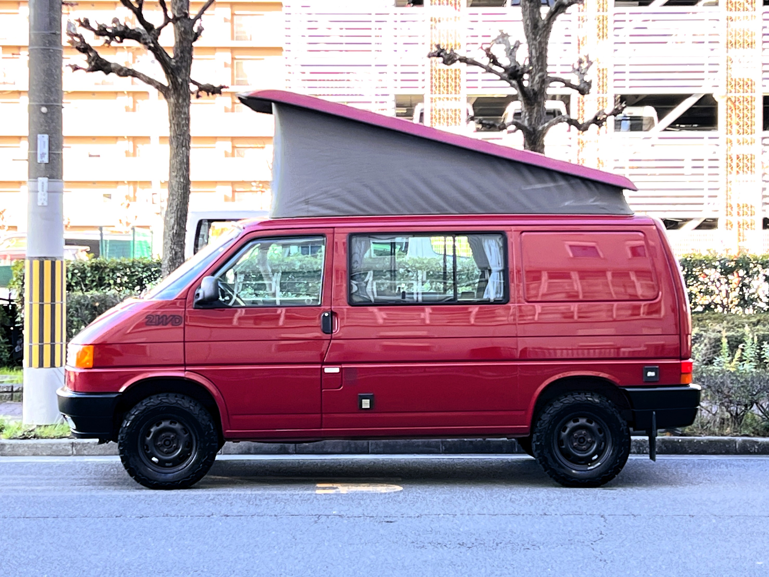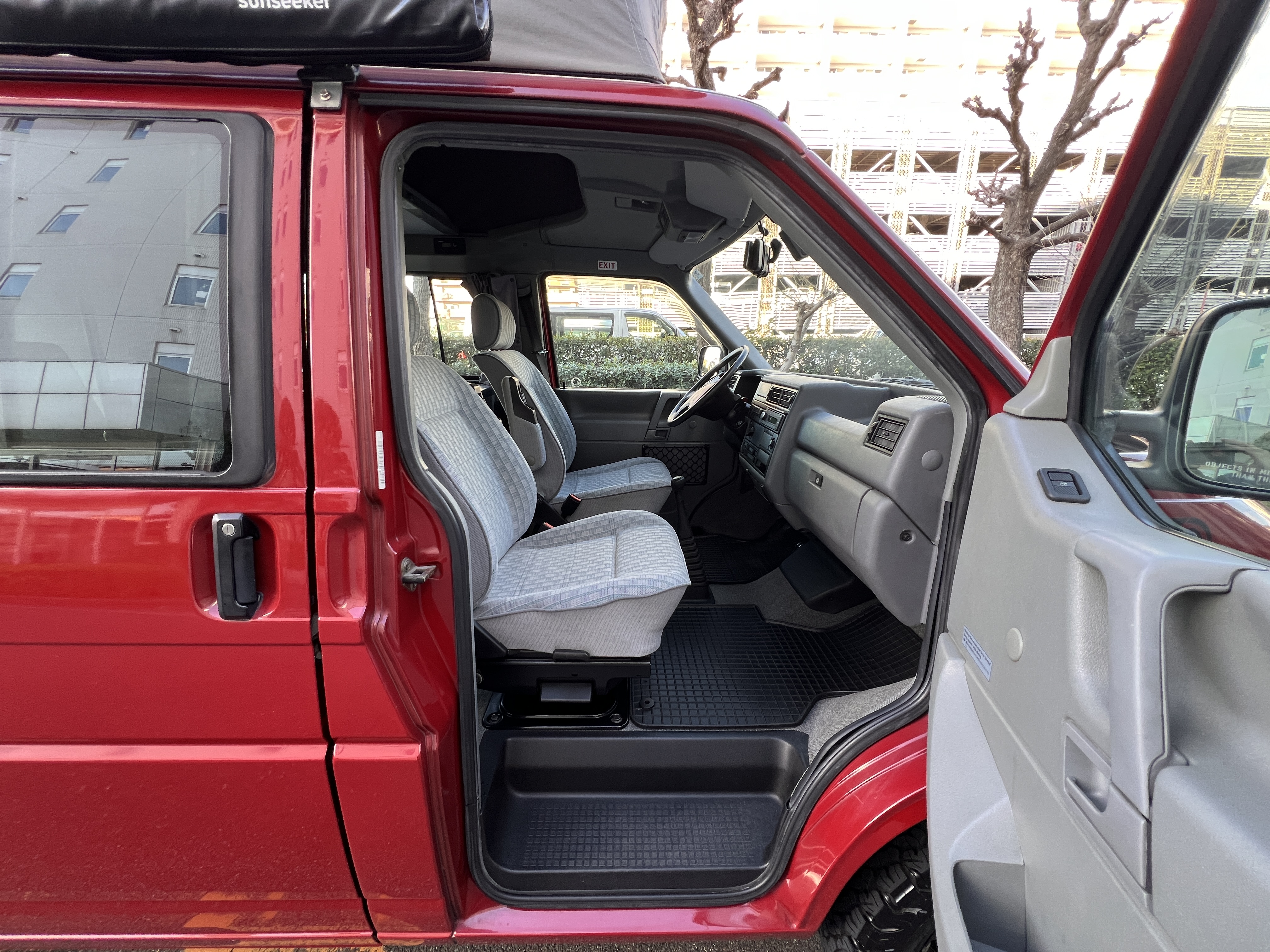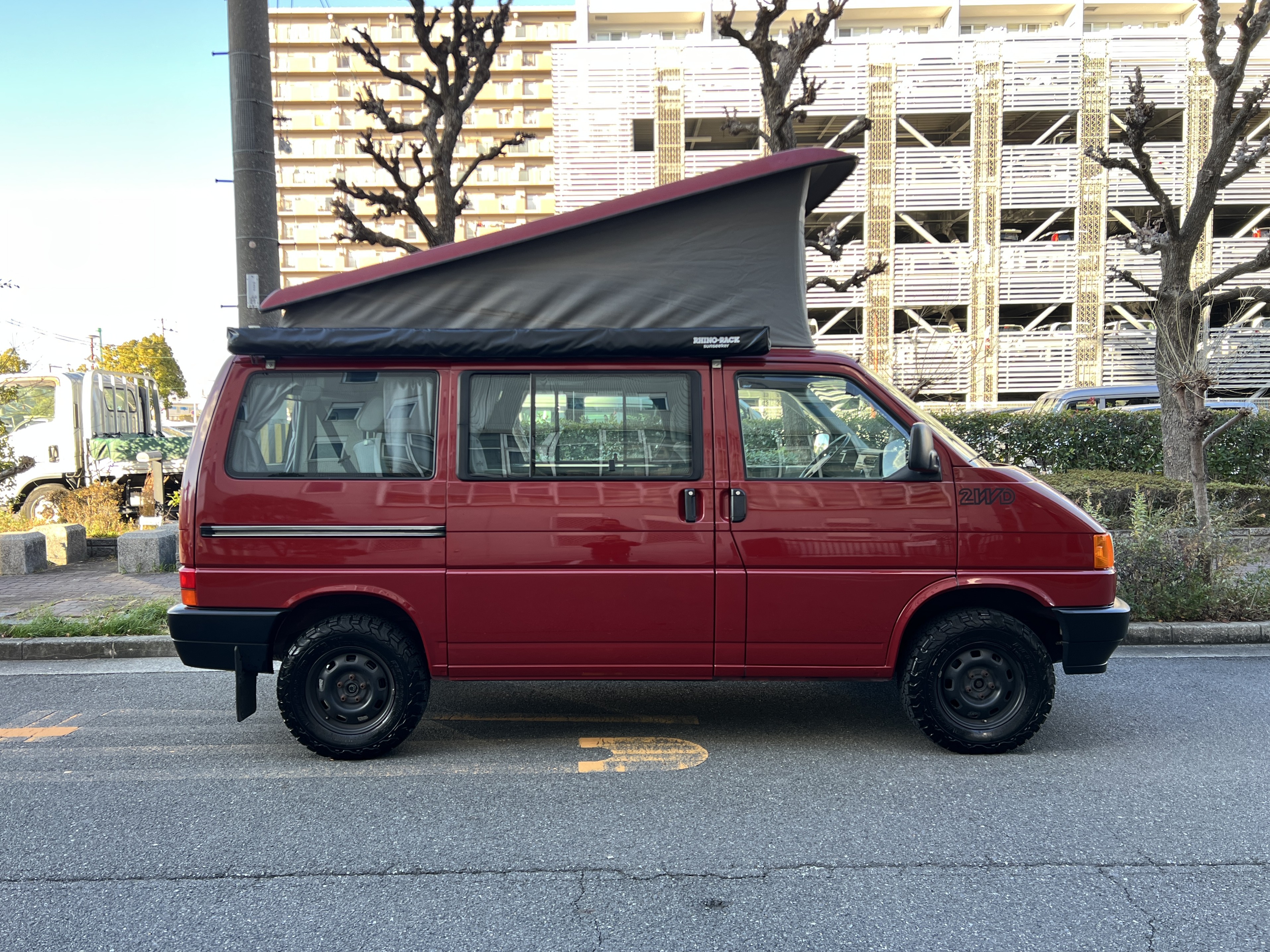 さて、そのWESTYを見ていきましょう♬ まず何といっても、このWESTYの魅力は5速マニュアル車👍 T4は比較的ATのトラブルに悩まされることがありますので、マニュアルという選択は、それだけで大きなメリット◎ そもそもT4はエンジンオーバーホールなんてほとんどありませんので、ある意味、マニュアルとの組み合わせが実は無敵で最強なのかも?!と思ってしまう一台です笑。ボディカラーは、深みと艶のあるボルドーレッド系。そこに合わせた前後の樹脂バンパー、さりげないリフトアップ、スチールホイール&テレーンタイヤの組み合わせで、フィールドが似合う、抜群の“旅バン”スタイルが完成しています👍 リアのマッドフラップがまたいい味出してるんですよね。このあたりのこだわりは、やっぱり好きな人が乗ってた感が出てますね◎ ちなみにこのWESTY、本来は北米仕様のため、フロントバンパーが少し長いロングバージョンなのですが、このT4は欧州仕様のショートタイプに換装済み。つまり、ルックス的には“T4カリフォルニアコーチ仕様”になっているんです◎ ポップアップルーフの前面には一部補修跡があります、使用には問題なしですが気になる方は張り替えなどの対応もご相談OKです◎ そしてサイドオーニングには、ライノラック製のオーニングをチョイス。控えめなのに、センスが光ってますね👍