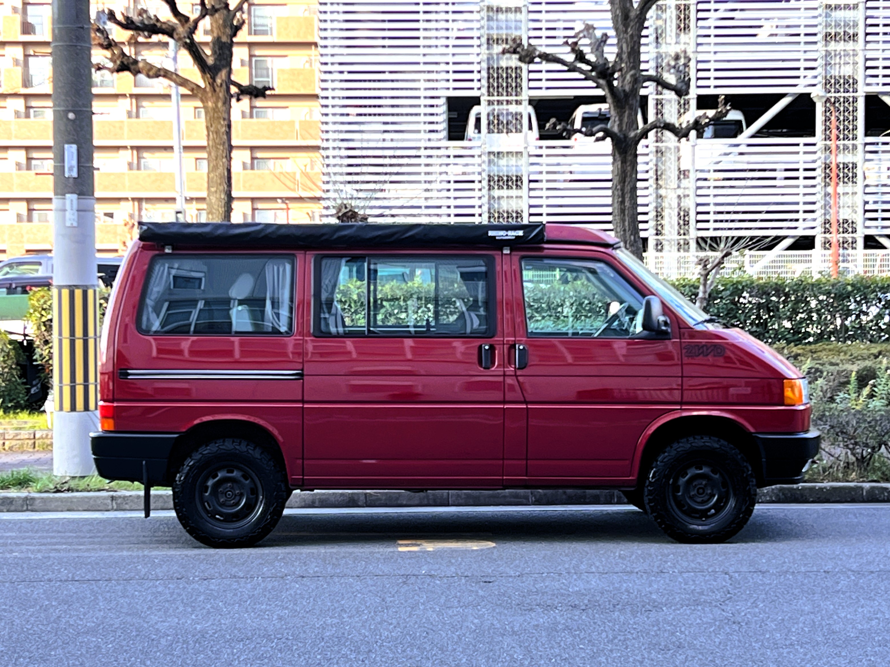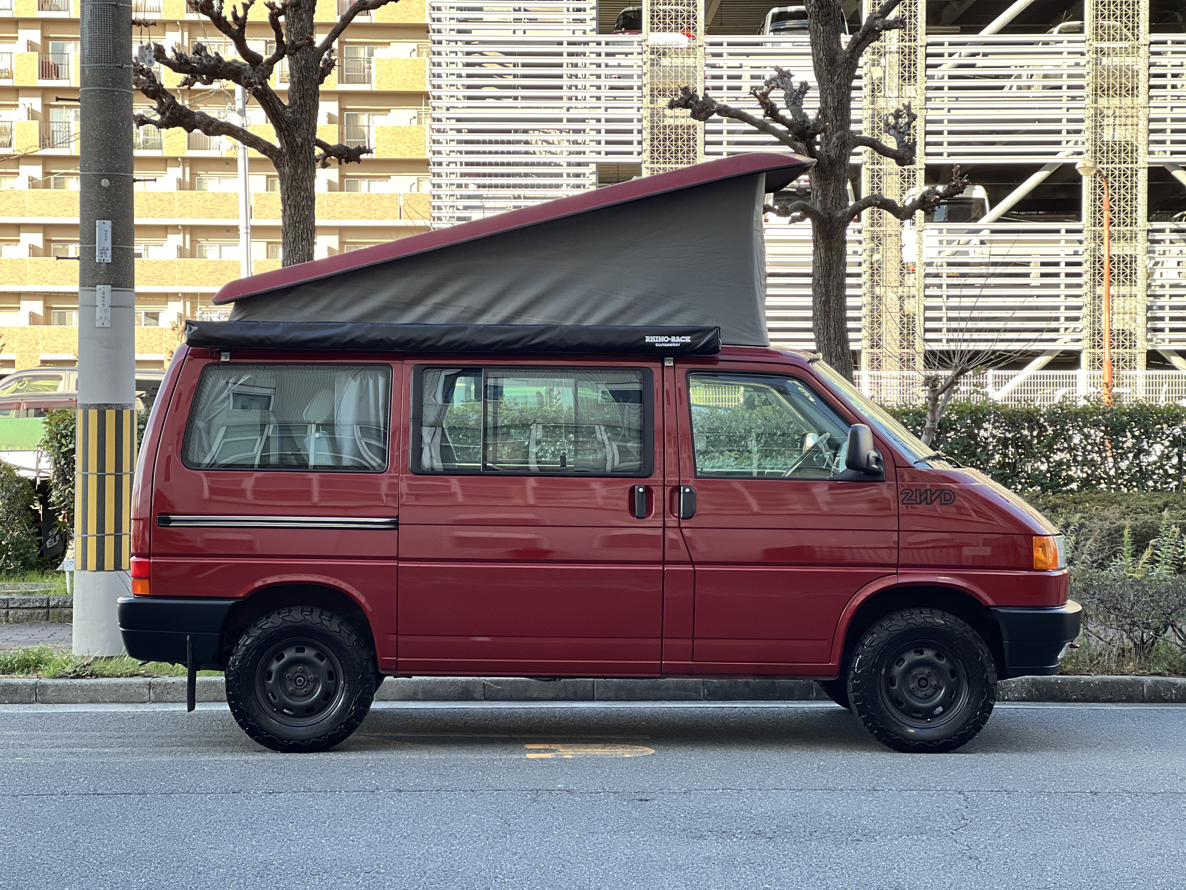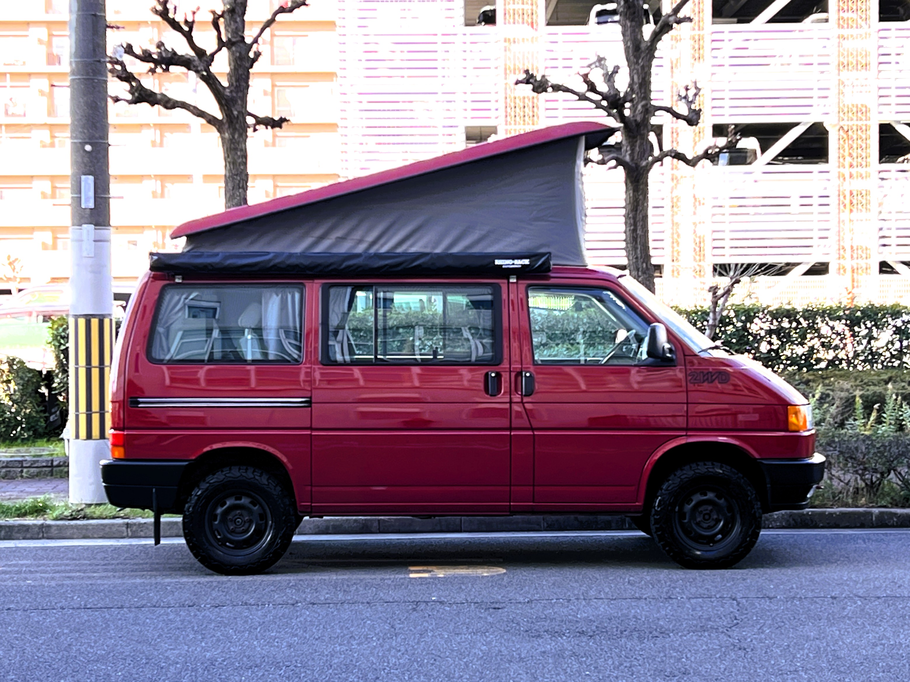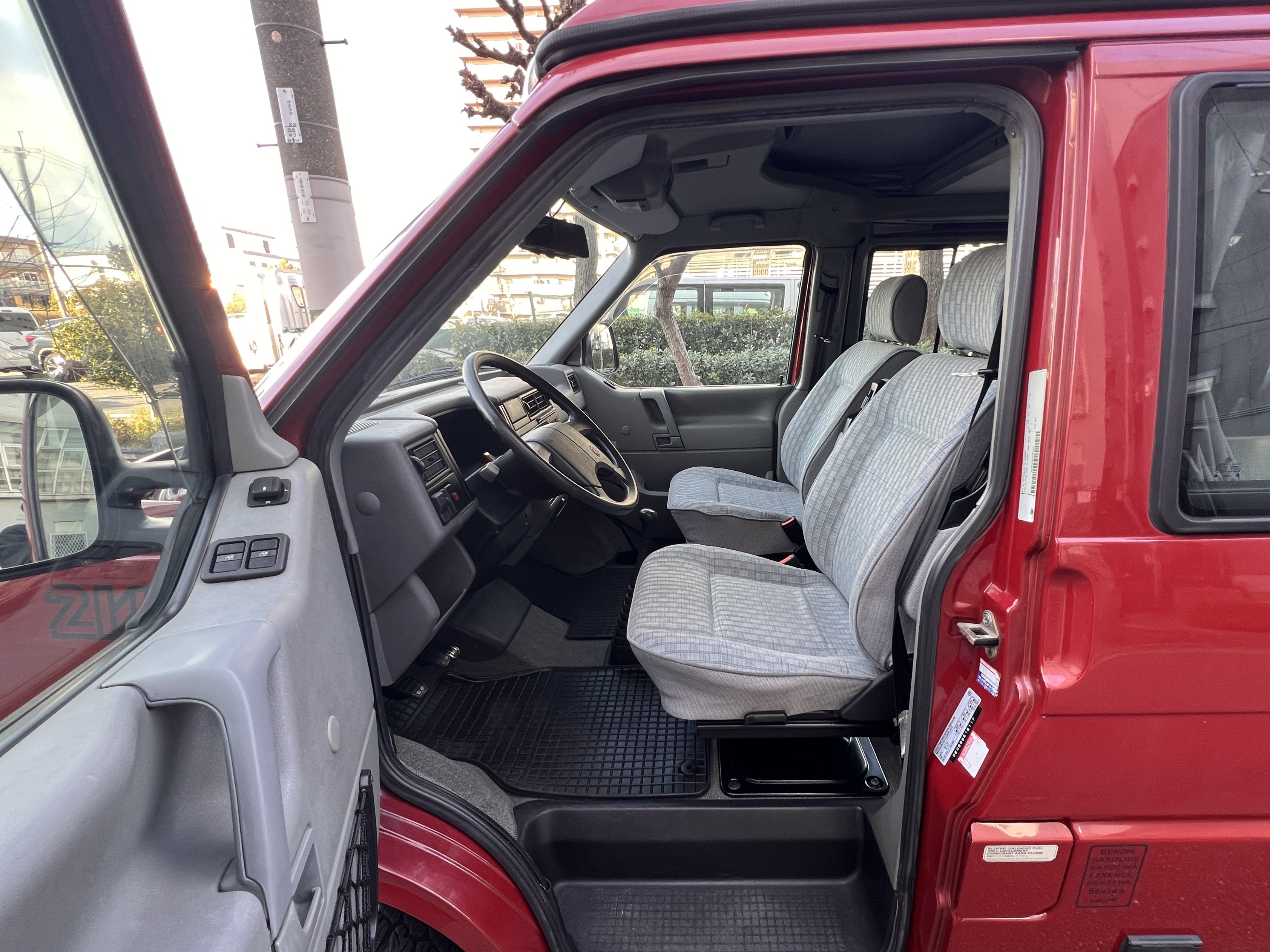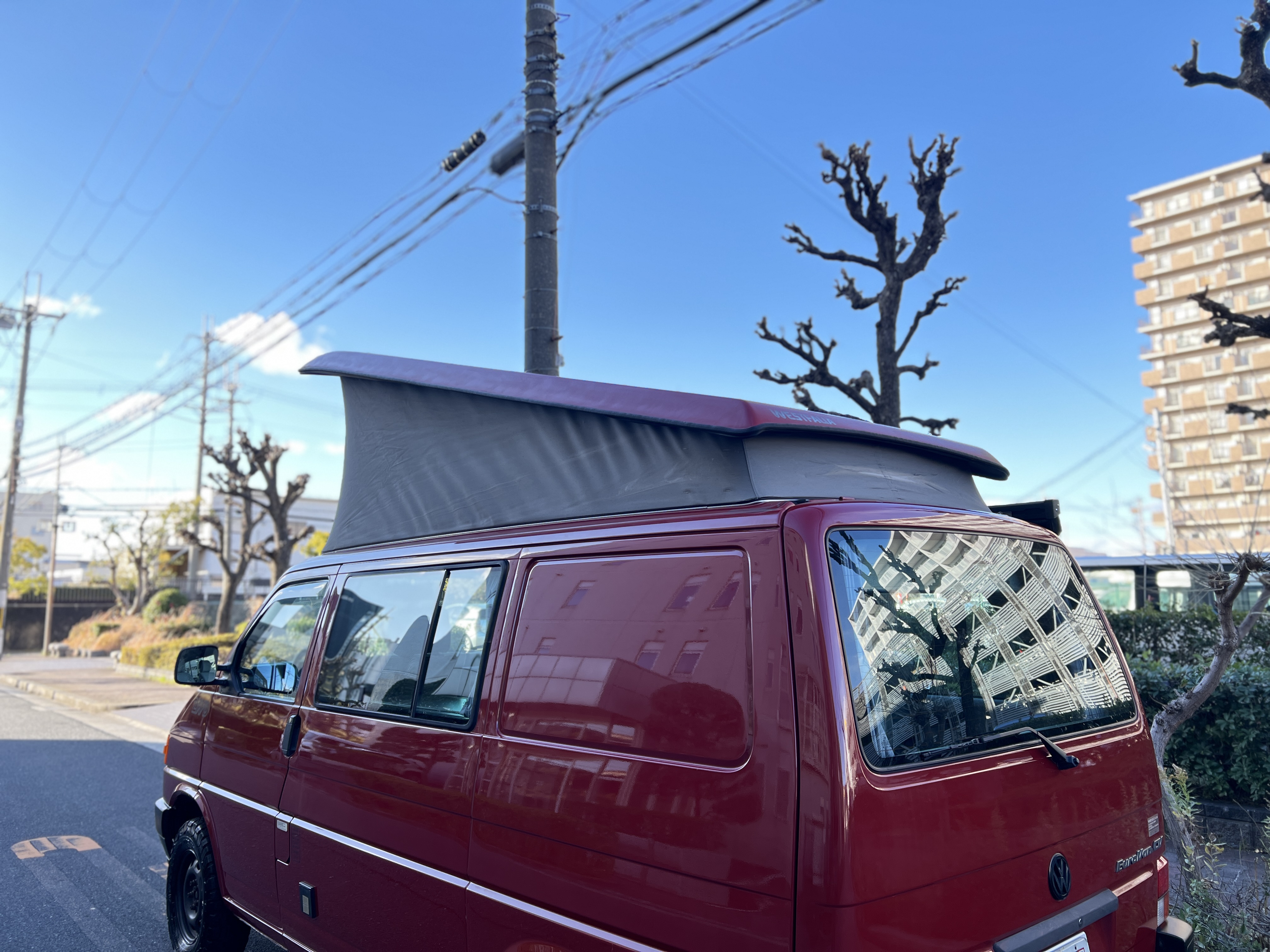 さて、そのWESTYを見ていきましょう♬ まず何といっても、このWESTYの魅力は5速マニュアル車👍 T4は比較的ATのトラブルに悩まされることがありますので、マニュアルという選択は、それだけで大きなメリット◎ そもそもT4はエンジンオーバーホールなんてほとんどありませんので、ある意味、マニュアルとの組み合わせが実は無敵で最強なのかも?!と思ってしまう一台です笑。ボディカラーは、深みと艶のあるボルドーレッド系。そこに合わせた前後の樹脂バンパー、さりげないリフトアップ、スチールホイール&テレーンタイヤの組み合わせで、フィールドが似合う、抜群の“旅バン”スタイルが完成しています👍 リアのマッドフラップがまたいい味出してるんですよね。このあたりのこだわりは、やっぱり好きな人が乗ってた感が出てますね◎ ちなみにこのWESTY、本来は北米仕様のため、フロントバンパーが少し長いロングバージョンなのですが、このT4は欧州仕様のショートタイプに換装済み。つまり、ルックス的には“T4カリフォルニアコーチ仕様”になっているんです◎ ポップアップルーフの前面には一部補修跡があります、使用には問題なしですが気になる方は張り替えなどの対応もご相談OKです◎ そしてサイドオーニングには、ライノラック製のオーニングをチョイス。控えめなのに、センスが光ってますね👍
