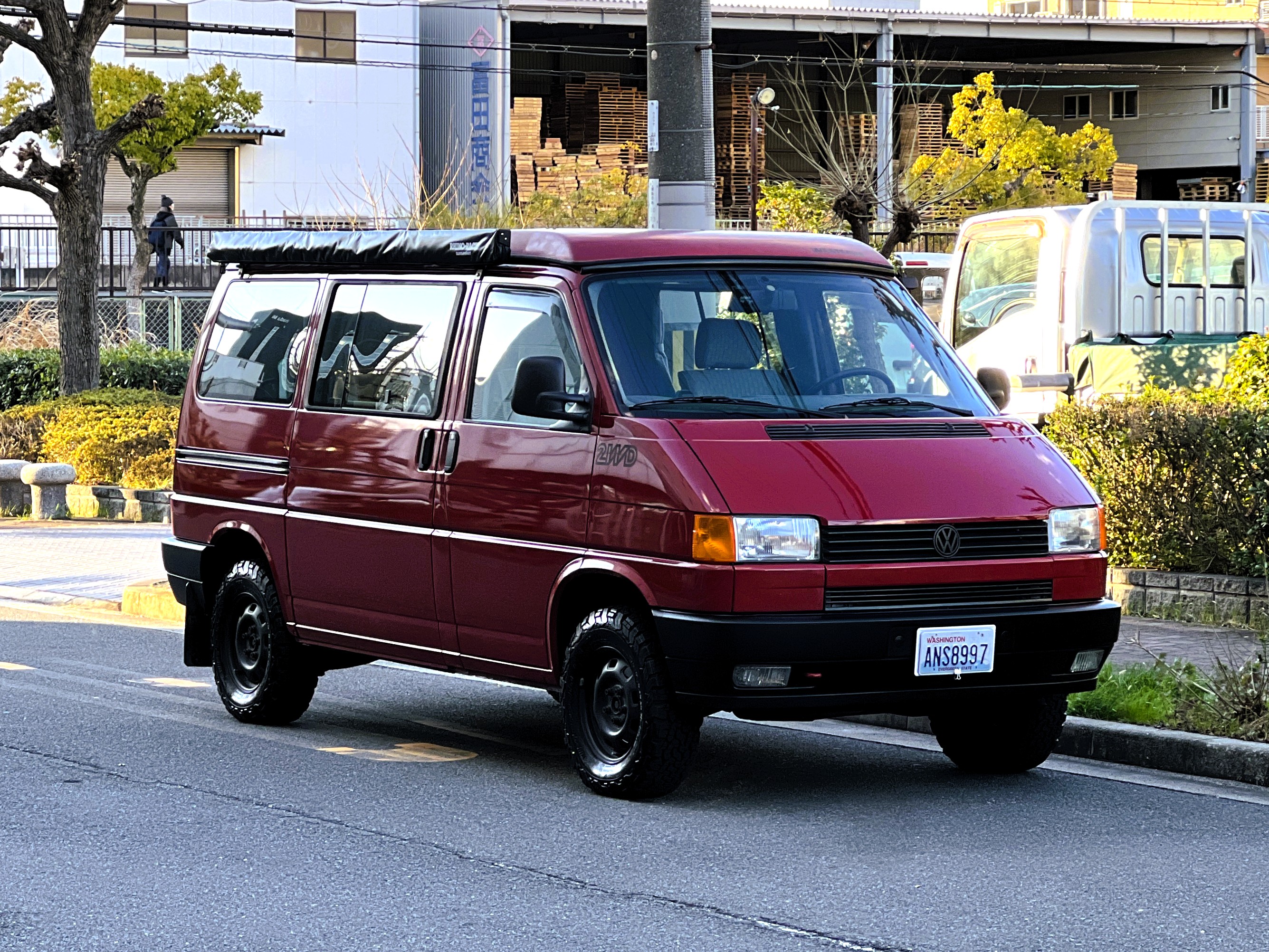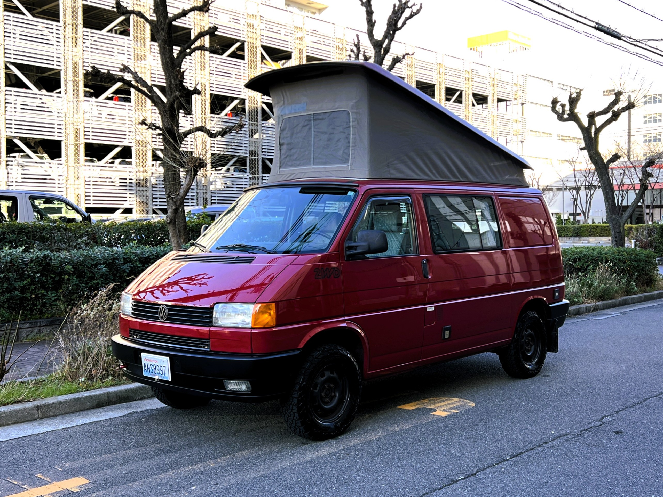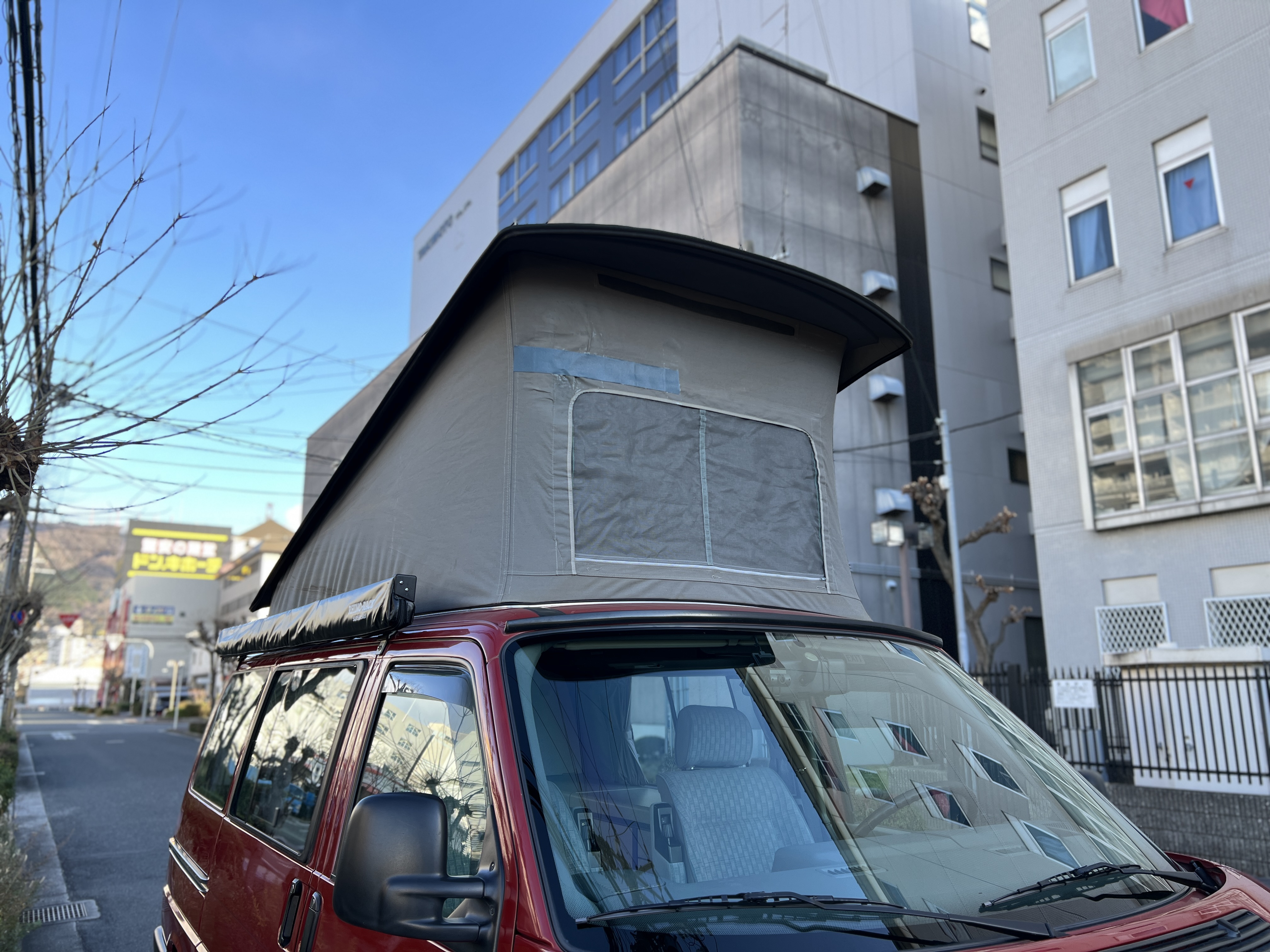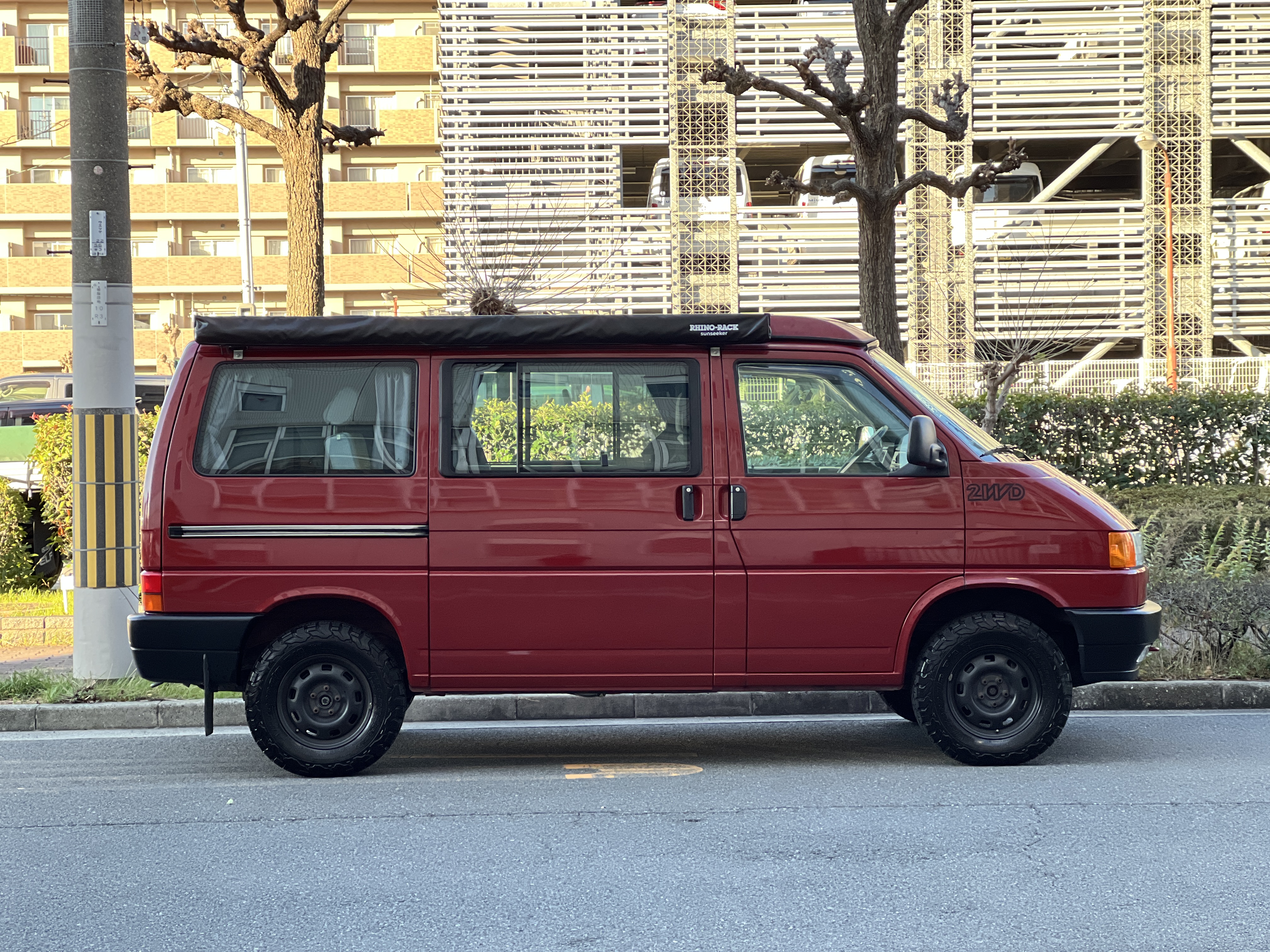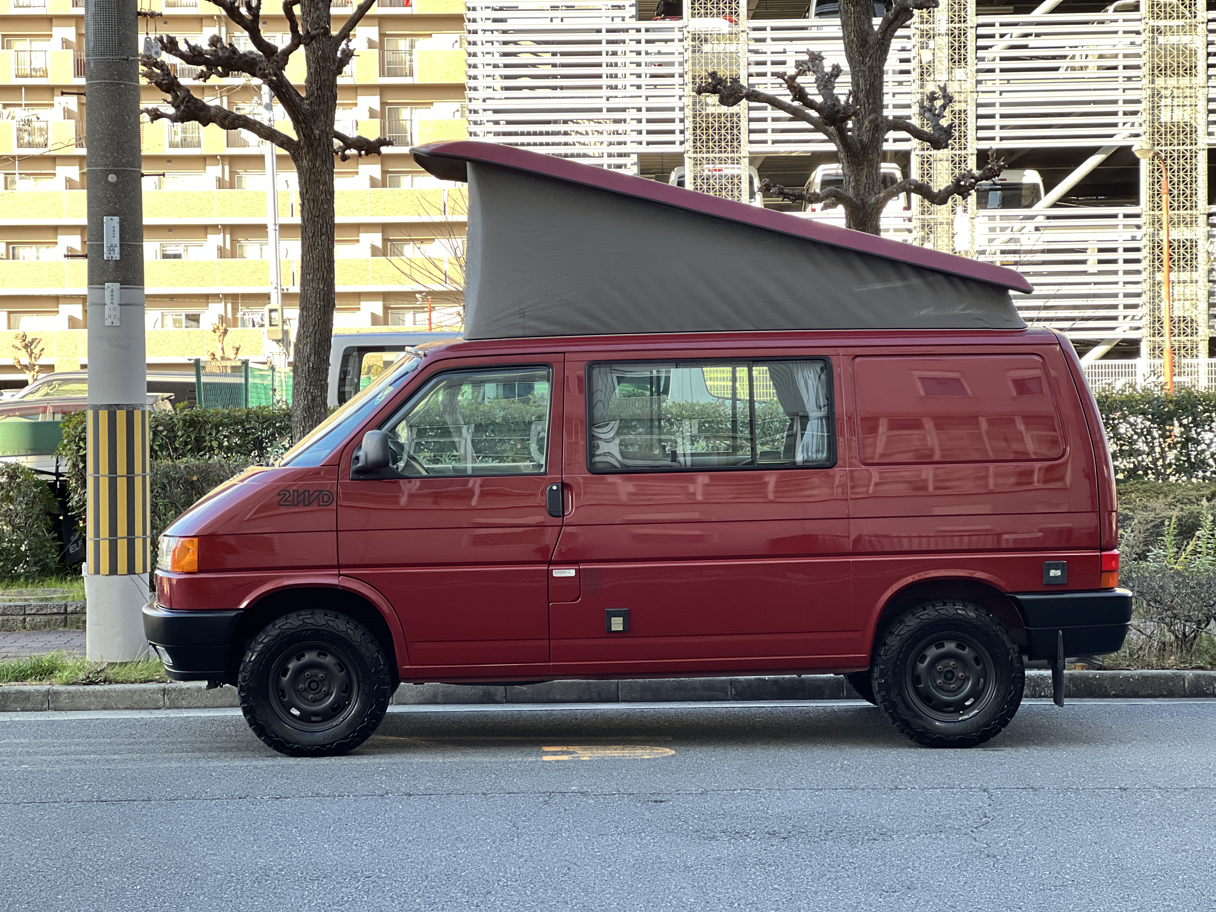 さて、そのWESTYを見ていきましょう♬ まず何といっても、このWESTYの魅力は5速マニュアル車👍 T4は比較的ATのトラブルに悩まされることがありますので、マニュアルという選択は、それだけで大きなメリット◎ そもそもT4はエンジンオーバーホールなんてほとんどありませんので、ある意味、マニュアルとの組み合わせが実は無敵で最強なのかも?!と思ってしまう一台です笑。ボディカラーは、深みと艶のあるボルドーレッド系。そこに合わせた前後の樹脂バンパー、さりげないリフトアップ、スチールホイール&テレーンタイヤの組み合わせで、フィールドが似合う、抜群の“旅バン”スタイルが完成しています👍 リアのマッドフラップがまたいい味出してるんですよね。このあたりのこだわりは、やっぱり好きな人が乗ってた感が出てますね◎ ちなみにこのWESTY、本来は北米仕様のため、フロントバンパーが少し長いロングバージョンなのですが、このT4は欧州仕様のショートタイプに換装済み。つまり、ルックス的には“T4カリフォルニアコーチ仕様”になっているんです◎ ポップアップルーフの前面には一部補修跡があります、使用には問題なしですが気になる方は張り替えなどの対応もご相談OKです◎ そしてサイドオーニングには、ライノラック製のオーニングをチョイス。控えめなのに、センスが光ってますね👍
