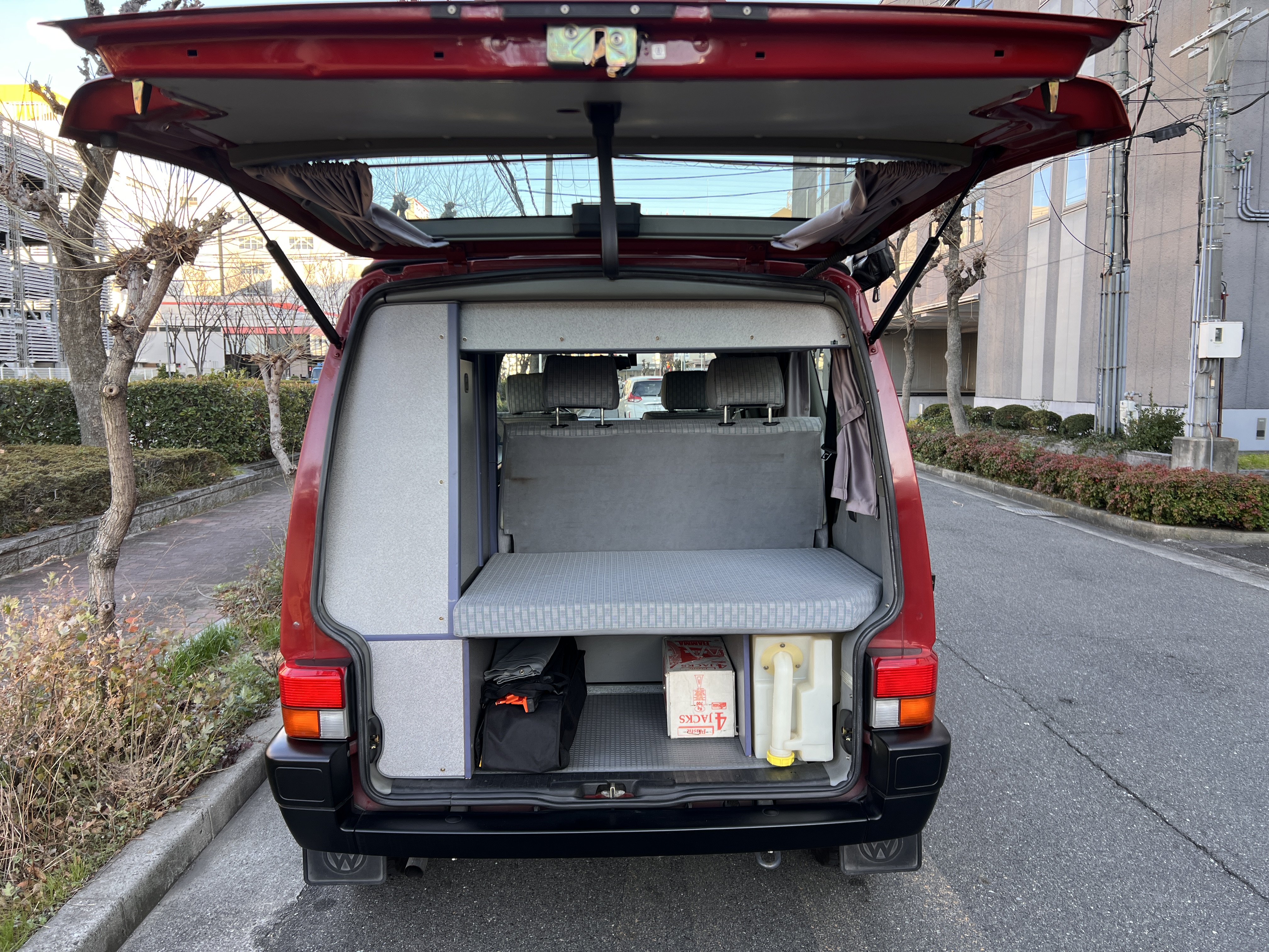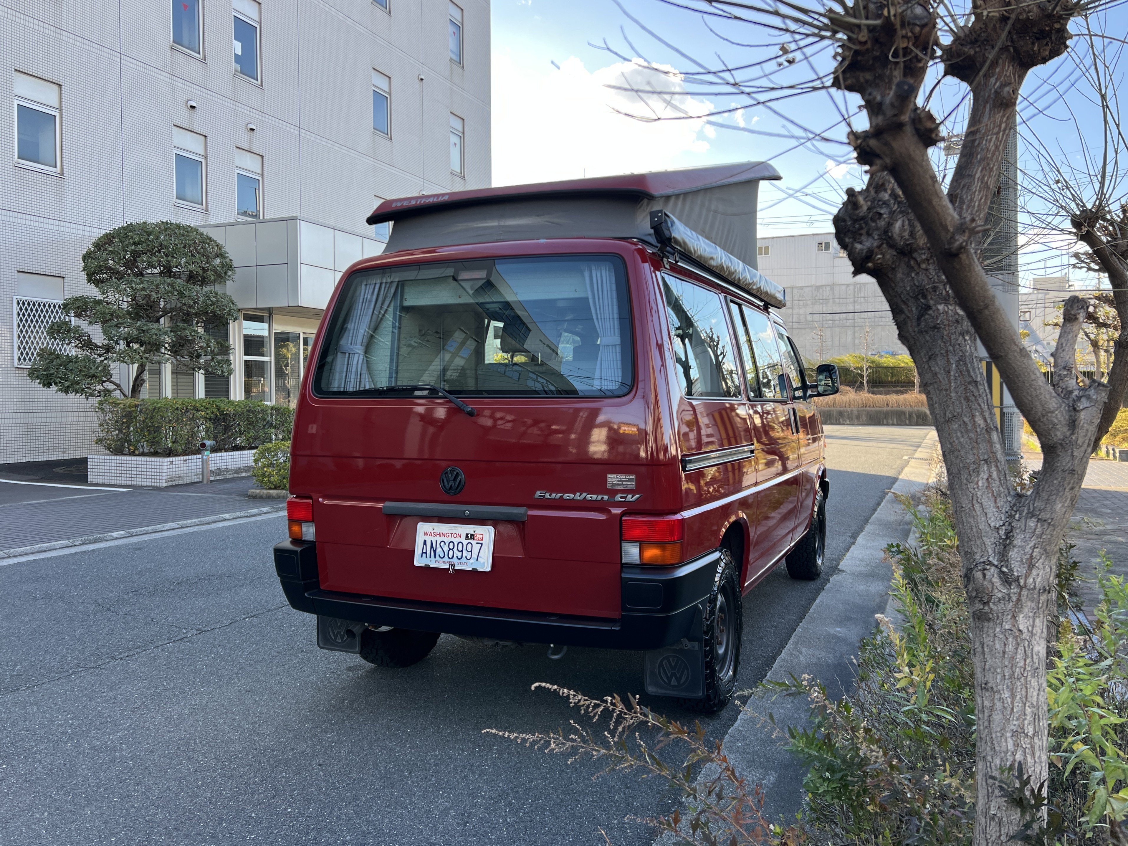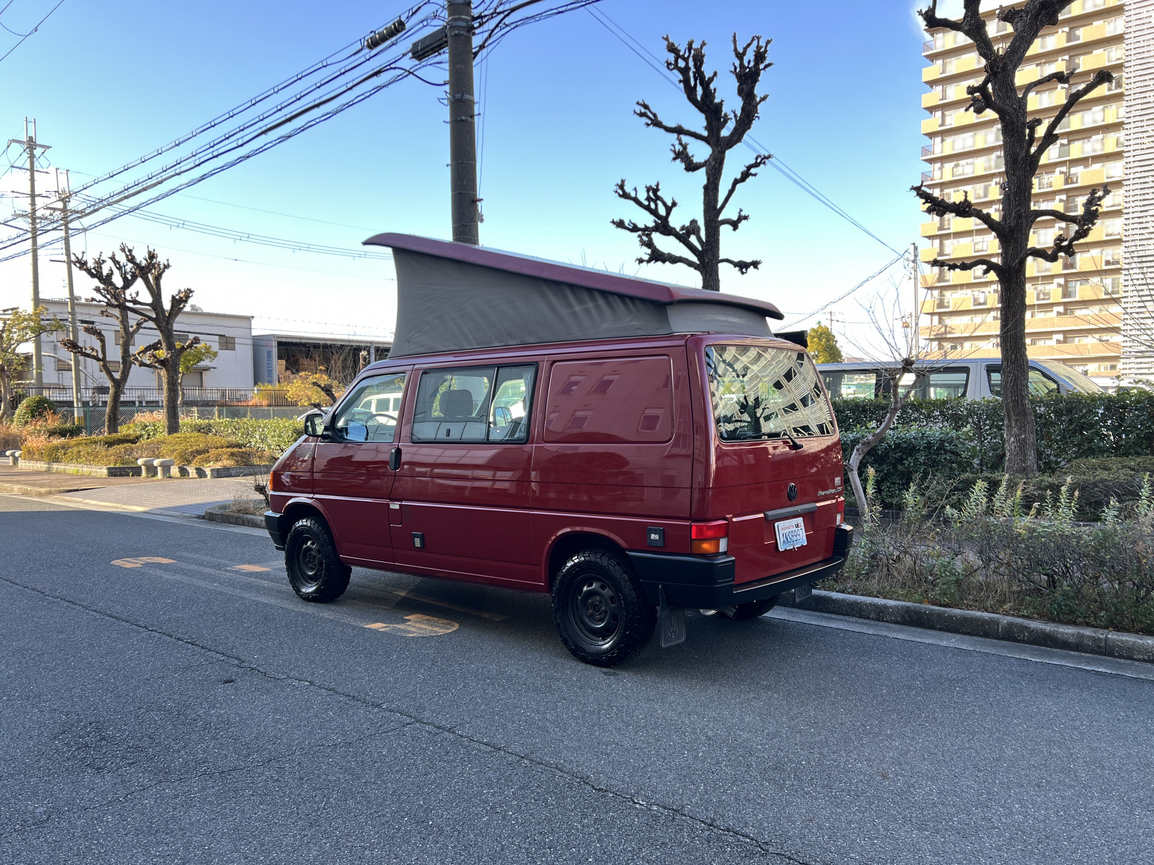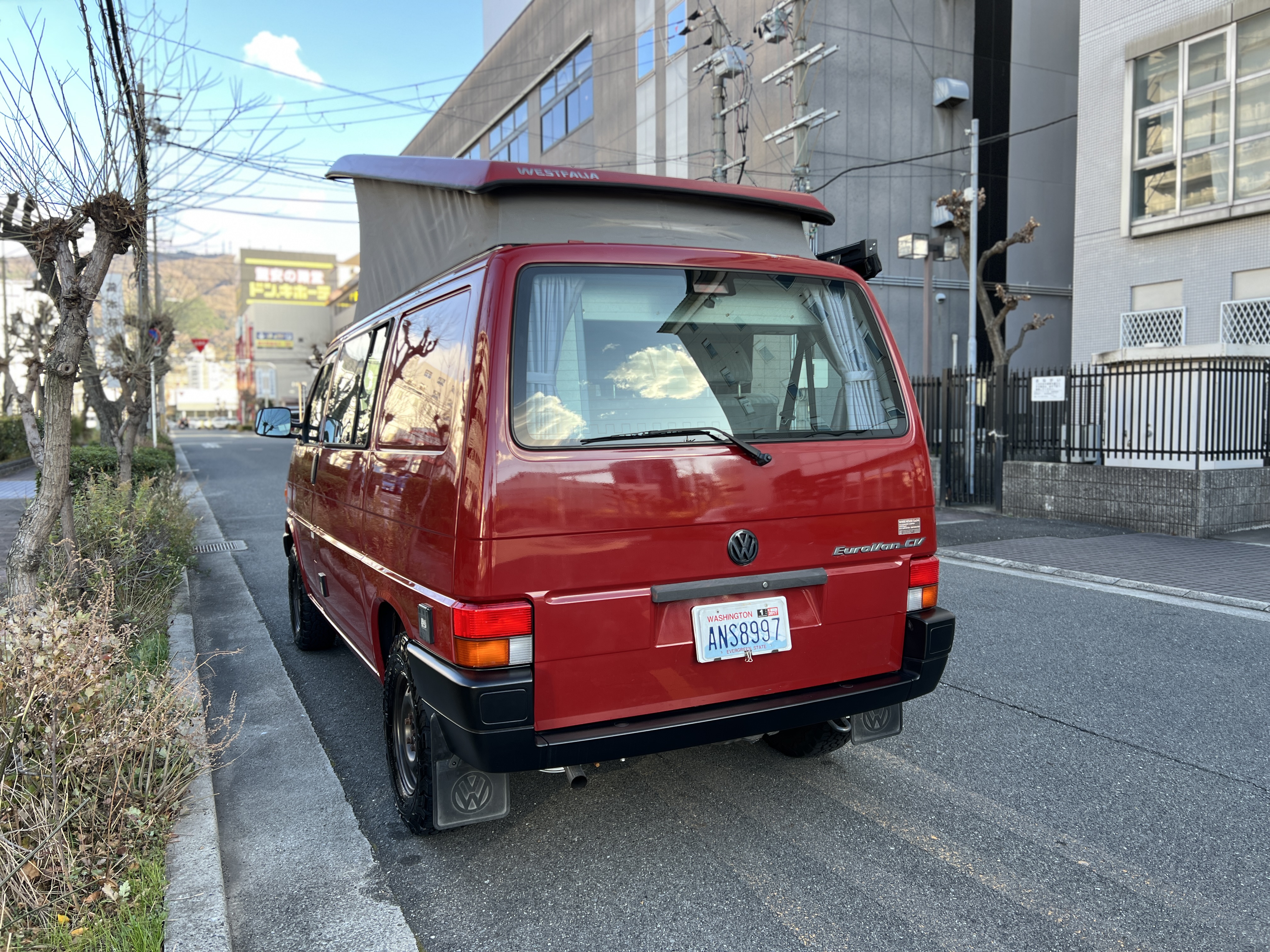 さて、そのWESTYを見ていきましょう♬ まず何といっても、このWESTYの魅力は5速マニュアル車👍 T4は比較的ATのトラブルに悩まされることがありますので、マニュアルという選択は、それだけで大きなメリット◎ そもそもT4はエンジンオーバーホールなんてほとんどありませんので、ある意味、マニュアルとの組み合わせが実は無敵で最強なのかも?!と思ってしまう一台です笑。ボディカラーは、深みと艶のあるボルドーレッド系。そこに合わせた前後の樹脂バンパー、さりげないリフトアップ、スチールホイール&テレーンタイヤの組み合わせで、フィールドが似合う、抜群の“旅バン”スタイルが完成しています👍 リアのマッドフラップがまたいい味出してるんですよね。このあたりのこだわりは、やっぱり好きな人が乗ってた感が出てますね◎ ちなみにこのWESTY、本来は北米仕様のため、フロントバンパーが少し長いロングバージョンなのですが、このT4は欧州仕様のショートタイプに換装済み。つまり、ルックス的には“T4カリフォルニアコーチ仕様”になっているんです◎ ポップアップルーフの前面には一部補修跡があります、使用には問題なしですが気になる方は張り替えなどの対応もご相談OKです◎ そしてサイドオーニングには、ライノラック製のオーニングをチョイス。控えめなのに、センスが光ってますね👍