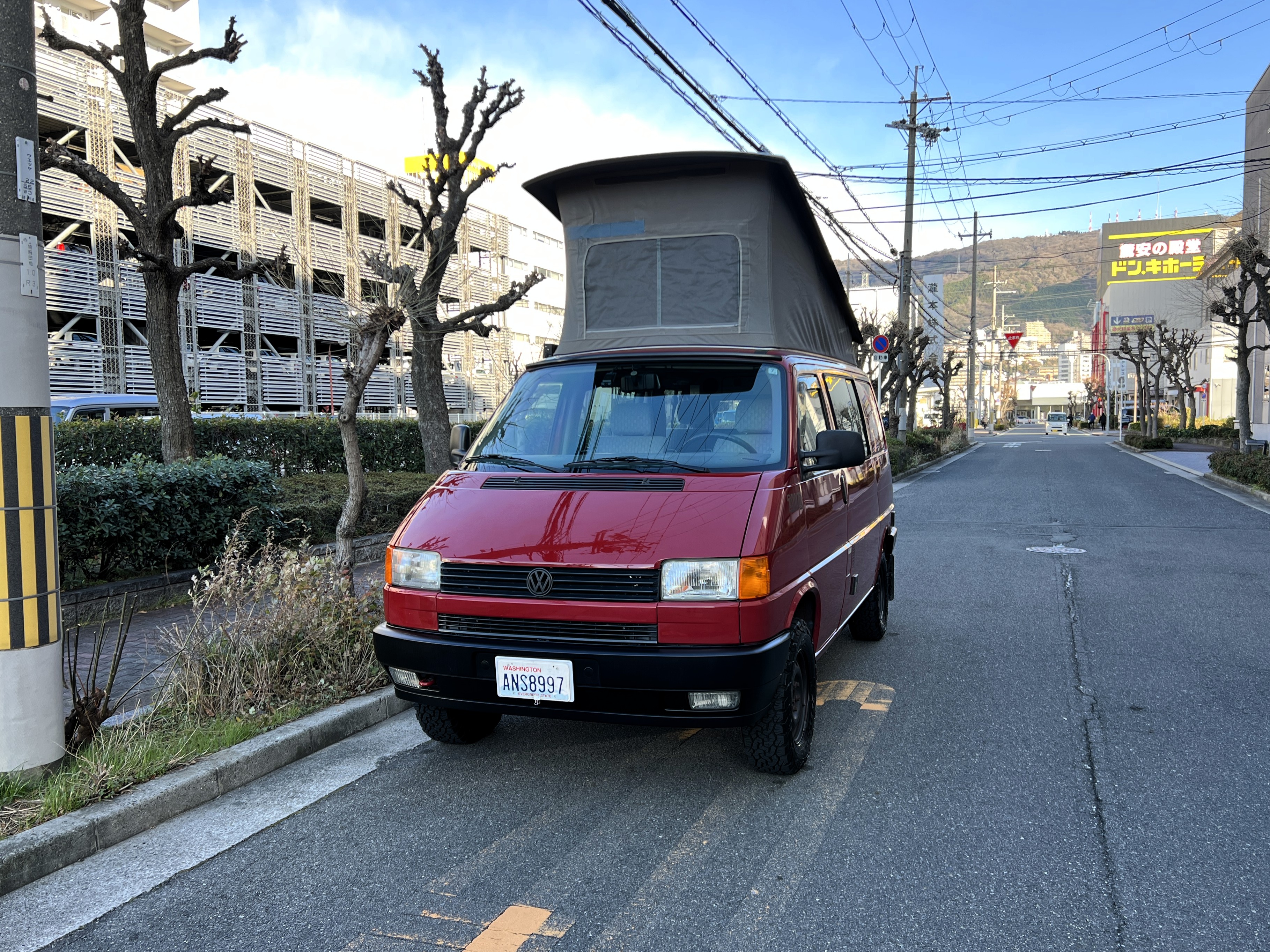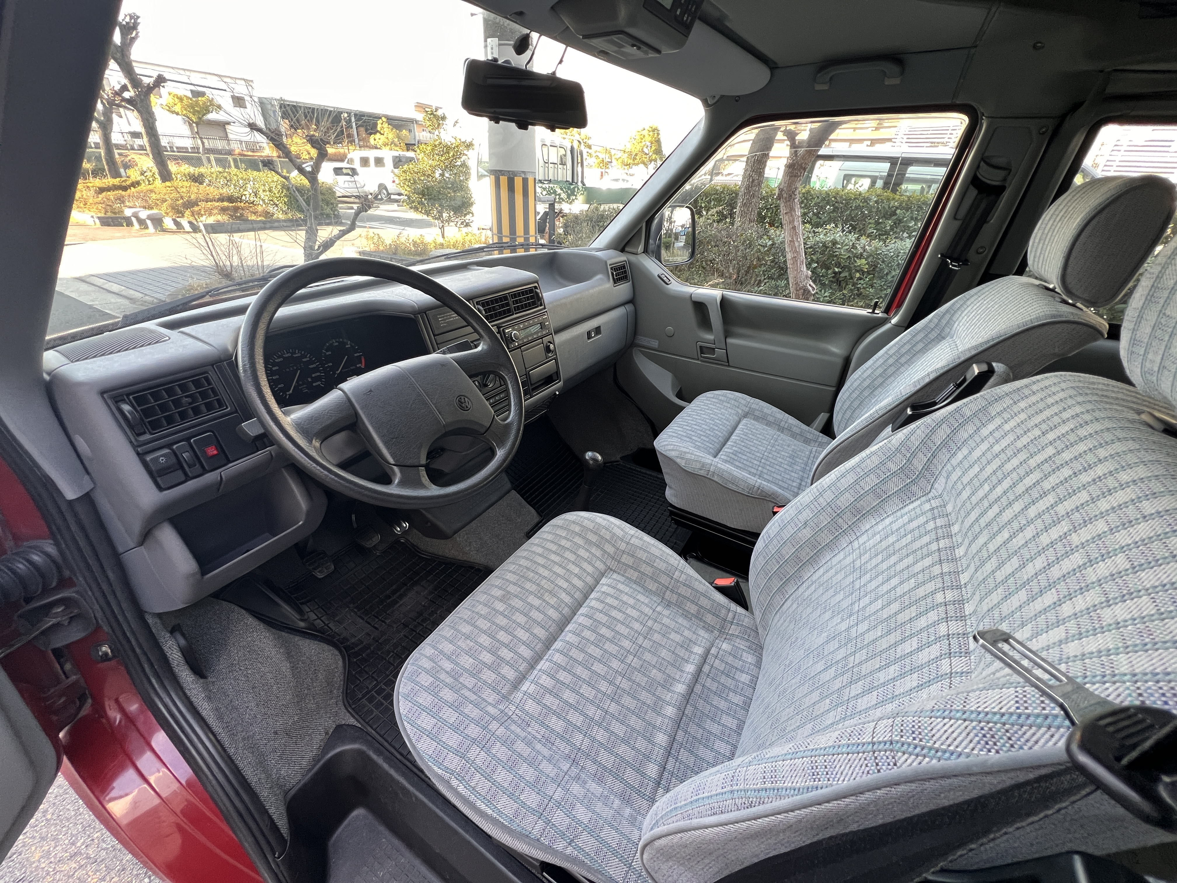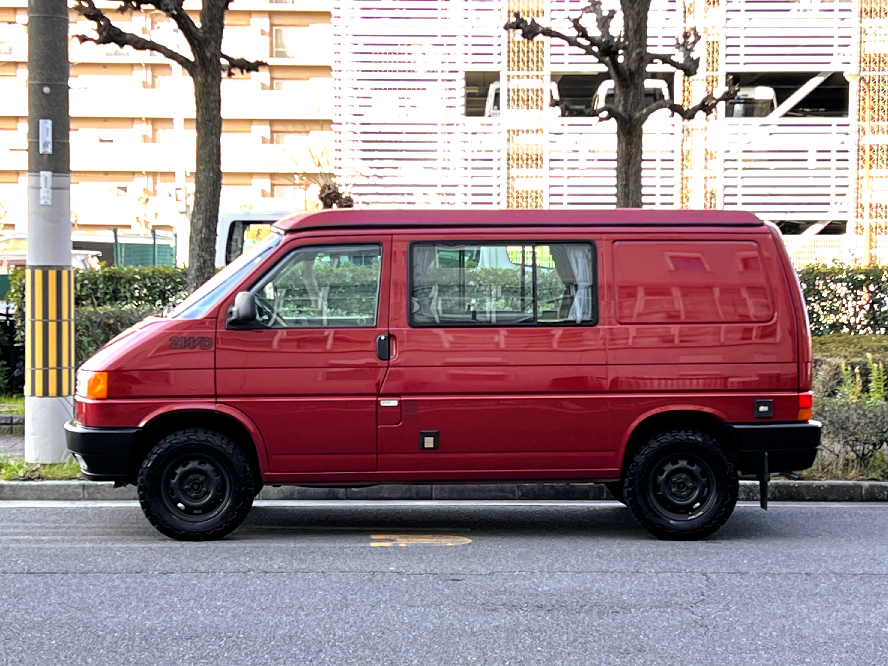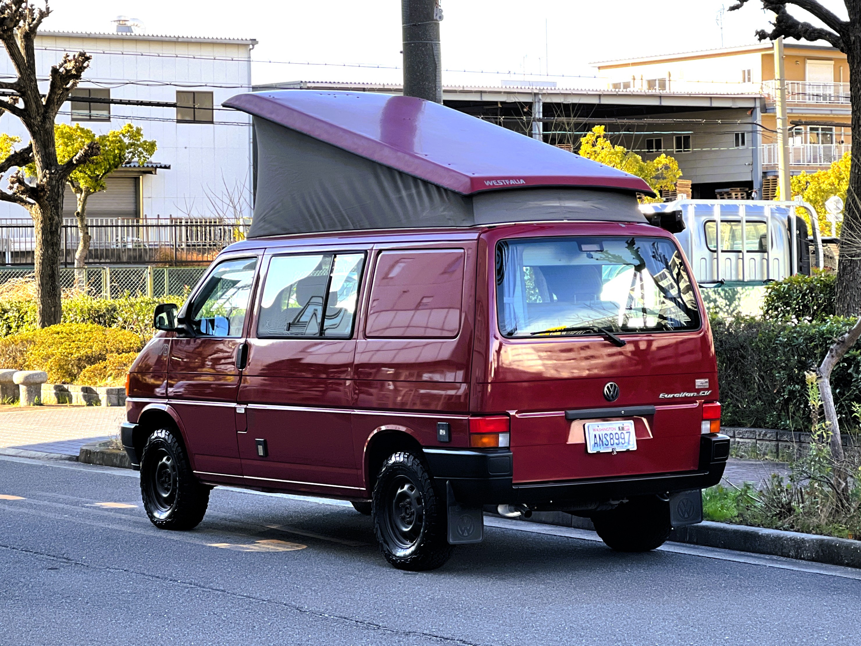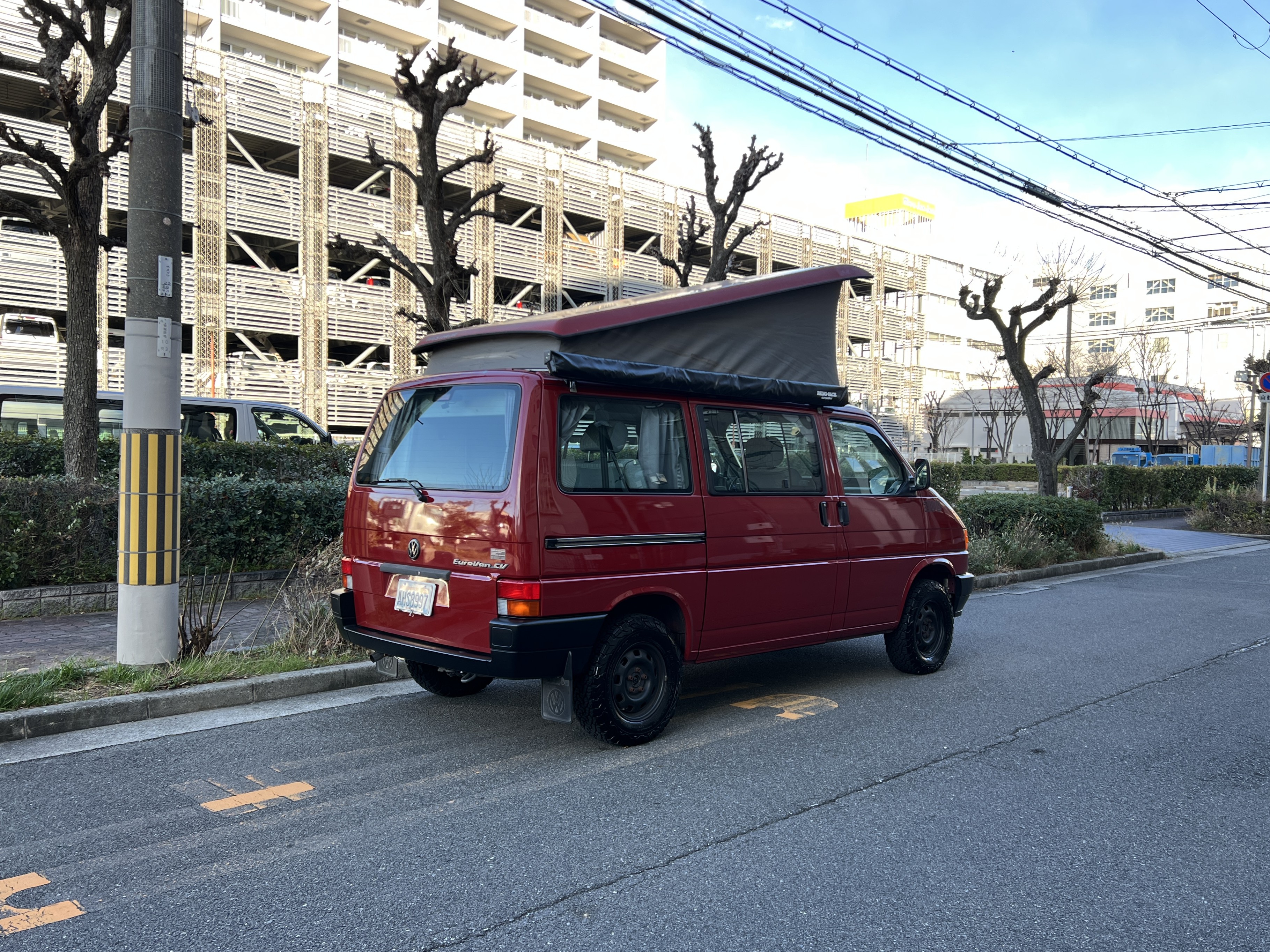 さて、そのWESTYを見ていきましょう♬ まず何といっても、このWESTYの魅力は5速マニュアル車👍 T4は比較的ATのトラブルに悩まされることがありますので、マニュアルという選択は、それだけで大きなメリット◎ そもそもT4はエンジンオーバーホールなんてほとんどありませんので、ある意味、マニュアルとの組み合わせが実は無敵で最強なのかも?!と思ってしまう一台です笑。ボディカラーは、深みと艶のあるボルドーレッド系。そこに合わせた前後の樹脂バンパー、さりげないリフトアップ、スチールホイール&テレーンタイヤの組み合わせで、フィールドが似合う、抜群の“旅バン”スタイルが完成しています👍 リアのマッドフラップがまたいい味出してるんですよね。このあたりのこだわりは、やっぱり好きな人が乗ってた感が出てますね◎ ちなみにこのWESTY、本来は北米仕様のため、フロントバンパーが少し長いロングバージョンなのですが、このT4は欧州仕様のショートタイプに換装済み。つまり、ルックス的には“T4カリフォルニアコーチ仕様”になっているんです◎ ポップアップルーフの前面には一部補修跡があります、使用には問題なしですが気になる方は張り替えなどの対応もご相談OKです◎ そしてサイドオーニングには、ライノラック製のオーニングをチョイス。控えめなのに、センスが光ってますね👍