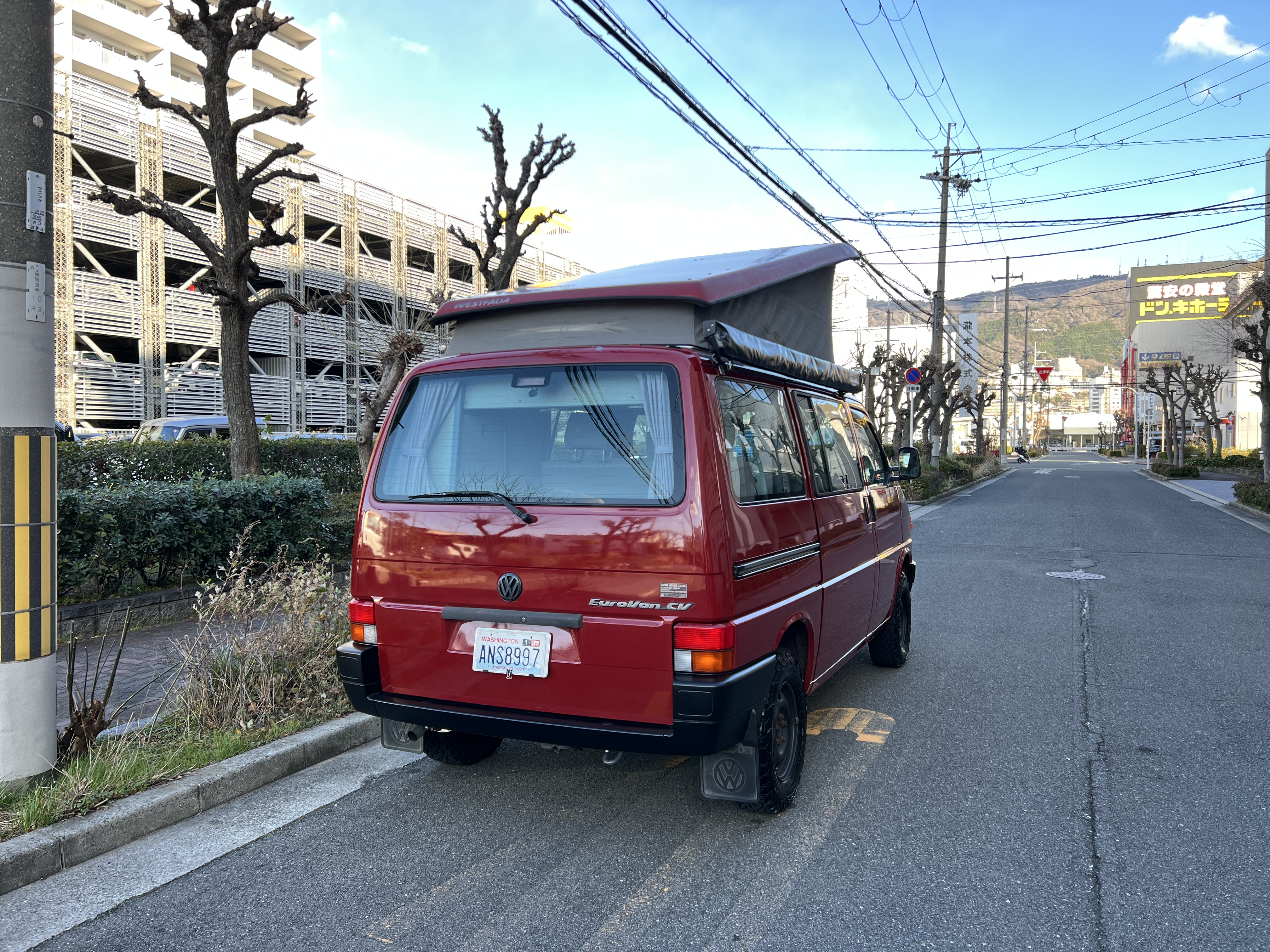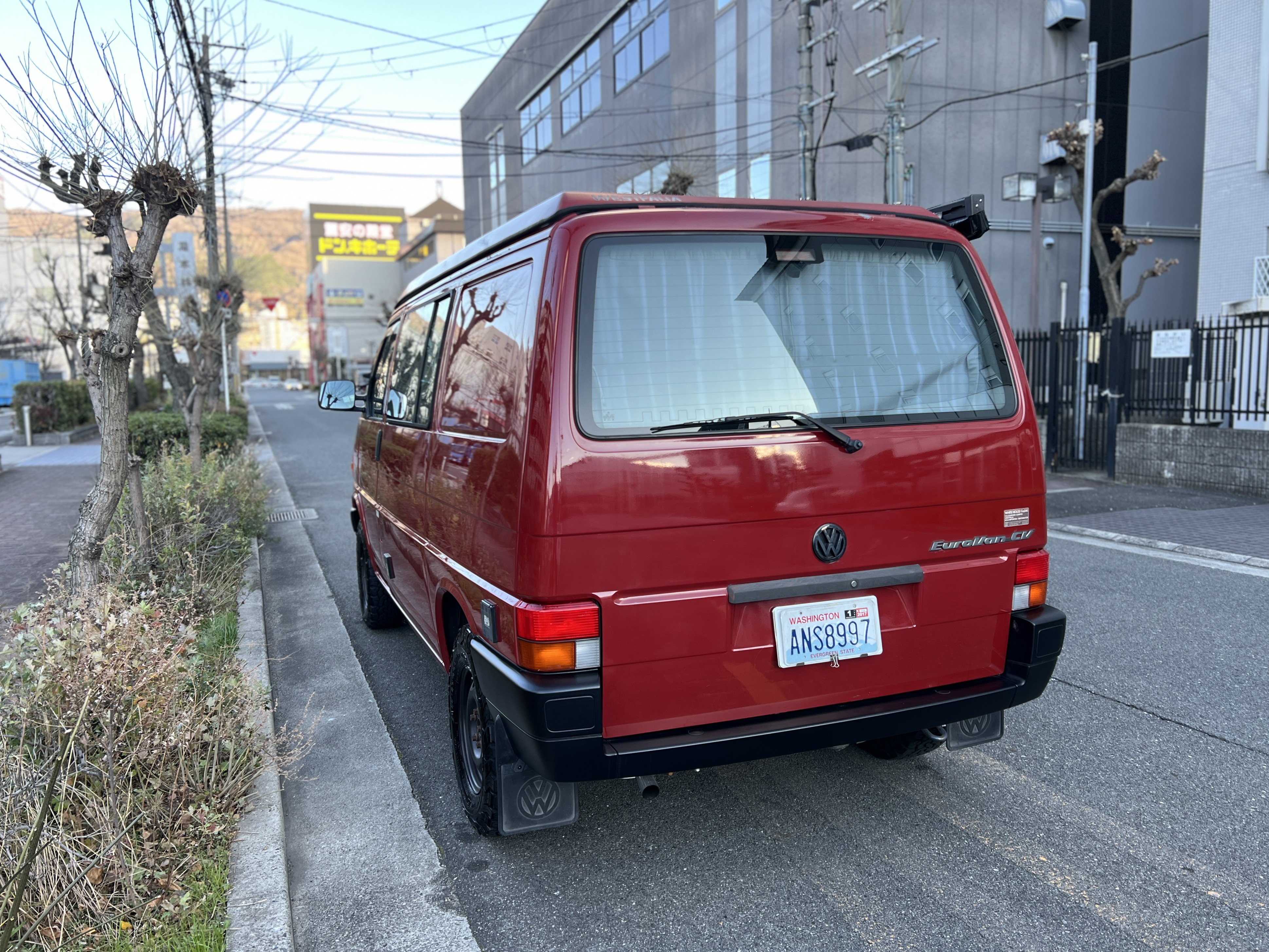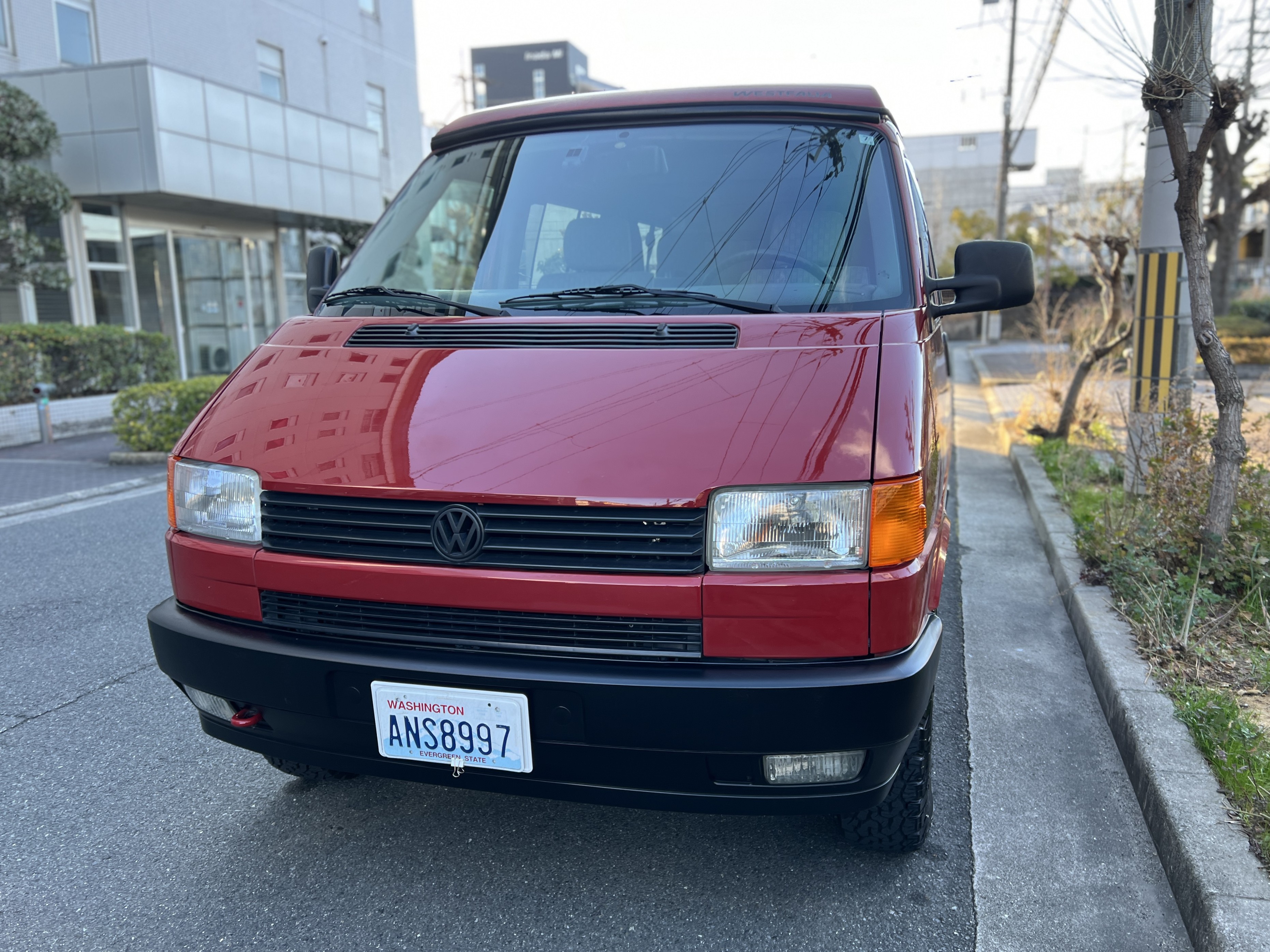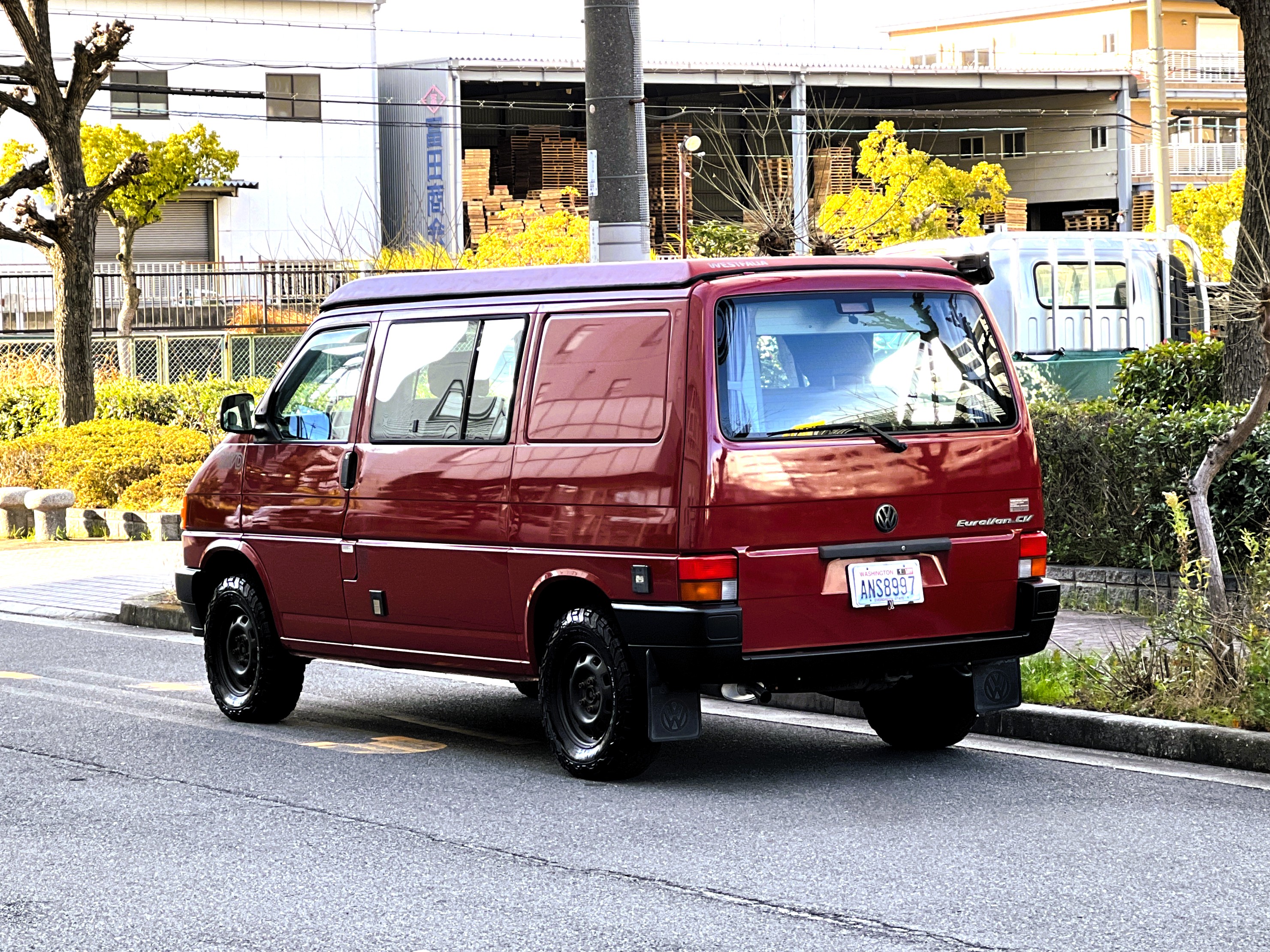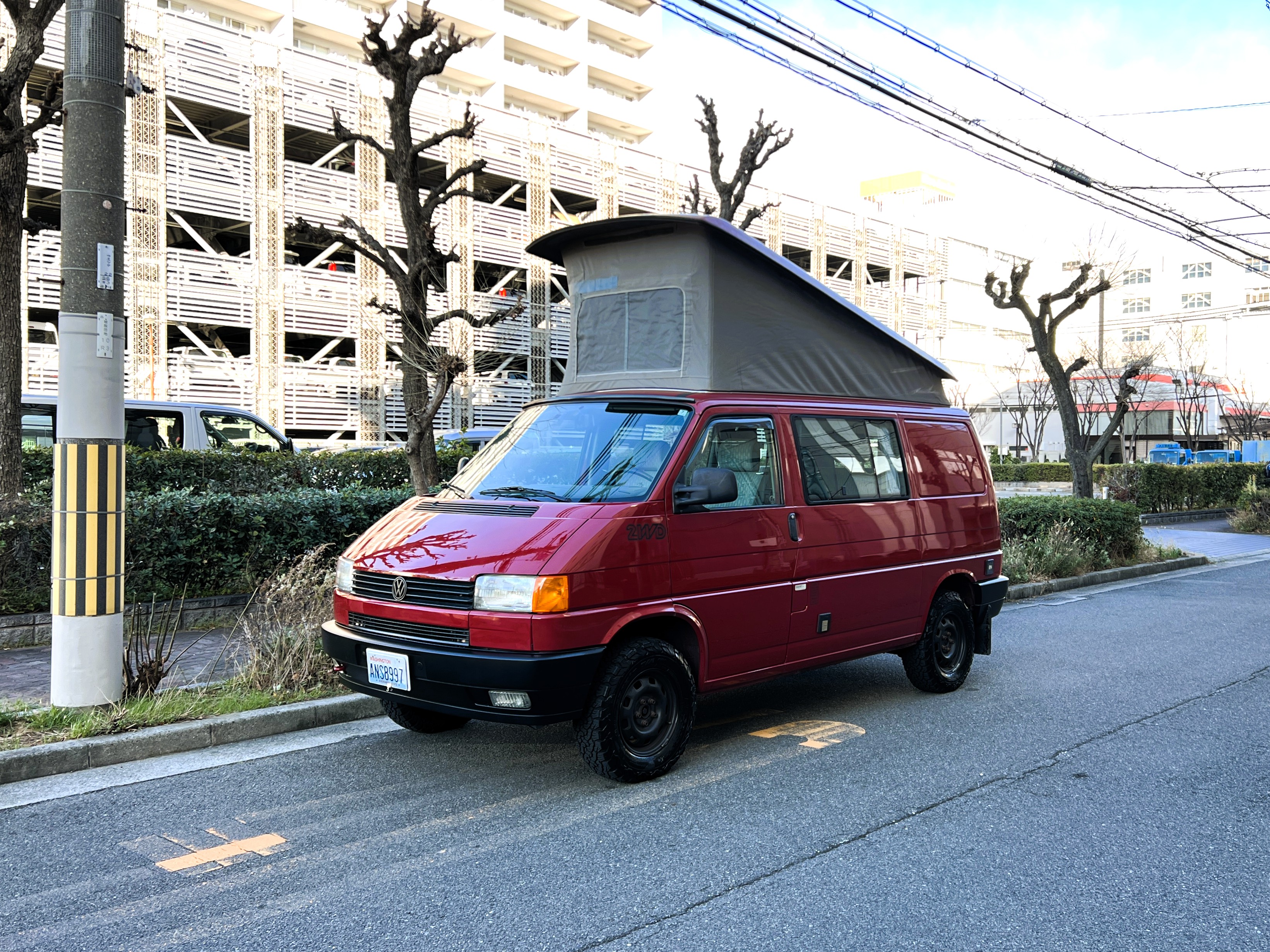 さて、そのWESTYを見ていきましょう♬ まず何といっても、このWESTYの魅力は5速マニュアル車👍 T4は比較的ATのトラブルに悩まされることがありますので、マニュアルという選択は、それだけで大きなメリット◎ そもそもT4はエンジンオーバーホールなんてほとんどありませんので、ある意味、マニュアルとの組み合わせが実は無敵で最強なのかも?!と思ってしまう一台です笑。ボディカラーは、深みと艶のあるボルドーレッド系。そこに合わせた前後の樹脂バンパー、さりげないリフトアップ、スチールホイール&テレーンタイヤの組み合わせで、フィールドが似合う、抜群の“旅バン”スタイルが完成しています👍 リアのマッドフラップがまたいい味出してるんですよね。このあたりのこだわりは、やっぱり好きな人が乗ってた感が出てますね◎ ちなみにこのWESTY、本来は北米仕様のため、フロントバンパーが少し長いロングバージョンなのですが、このT4は欧州仕様のショートタイプに換装済み。つまり、ルックス的には“T4カリフォルニアコーチ仕様”になっているんです◎ ポップアップルーフの前面には一部補修跡があります、使用には問題なしですが気になる方は張り替えなどの対応もご相談OKです◎ そしてサイドオーニングには、ライノラック製のオーニングをチョイス。控えめなのに、センスが光ってますね👍