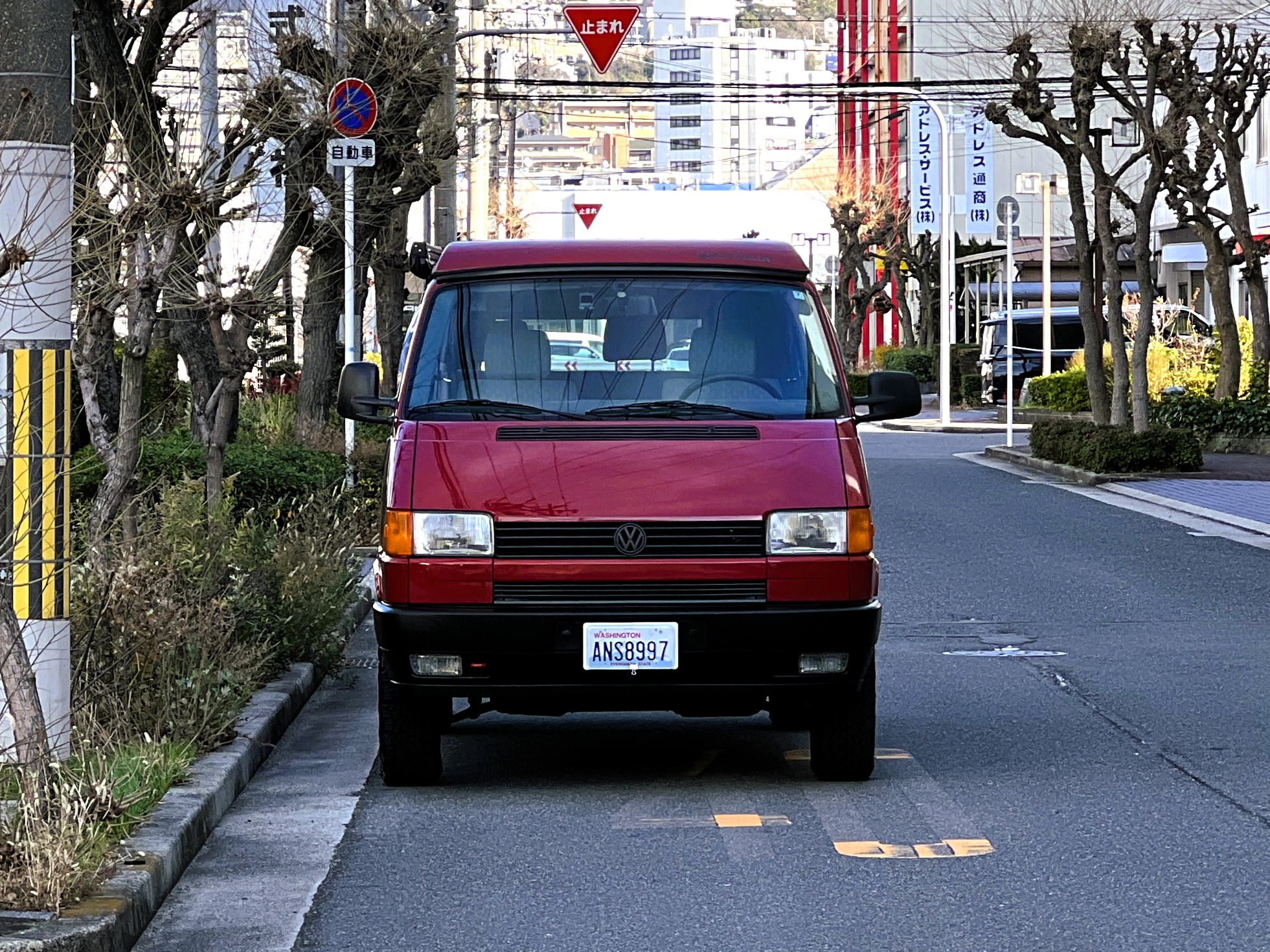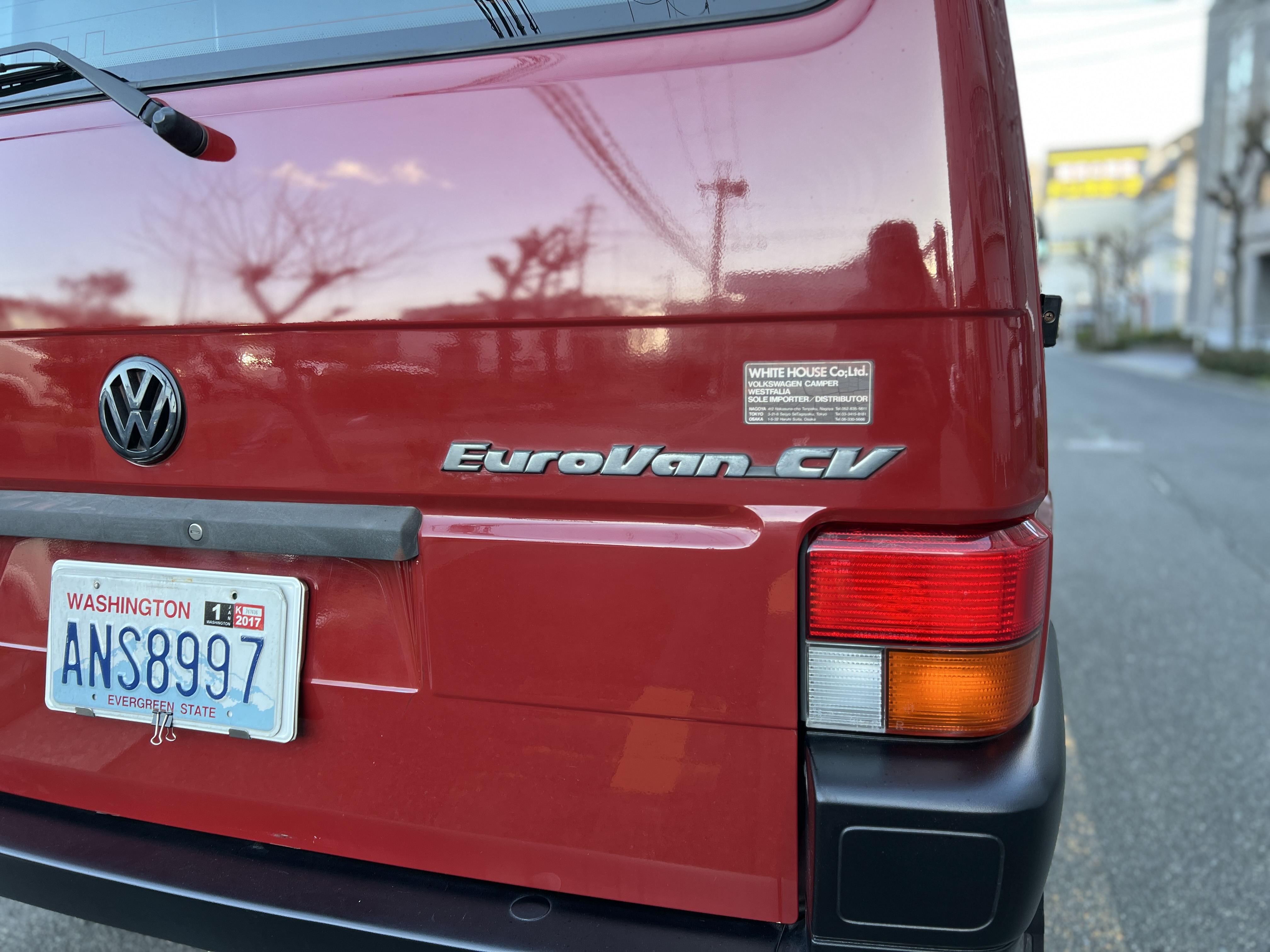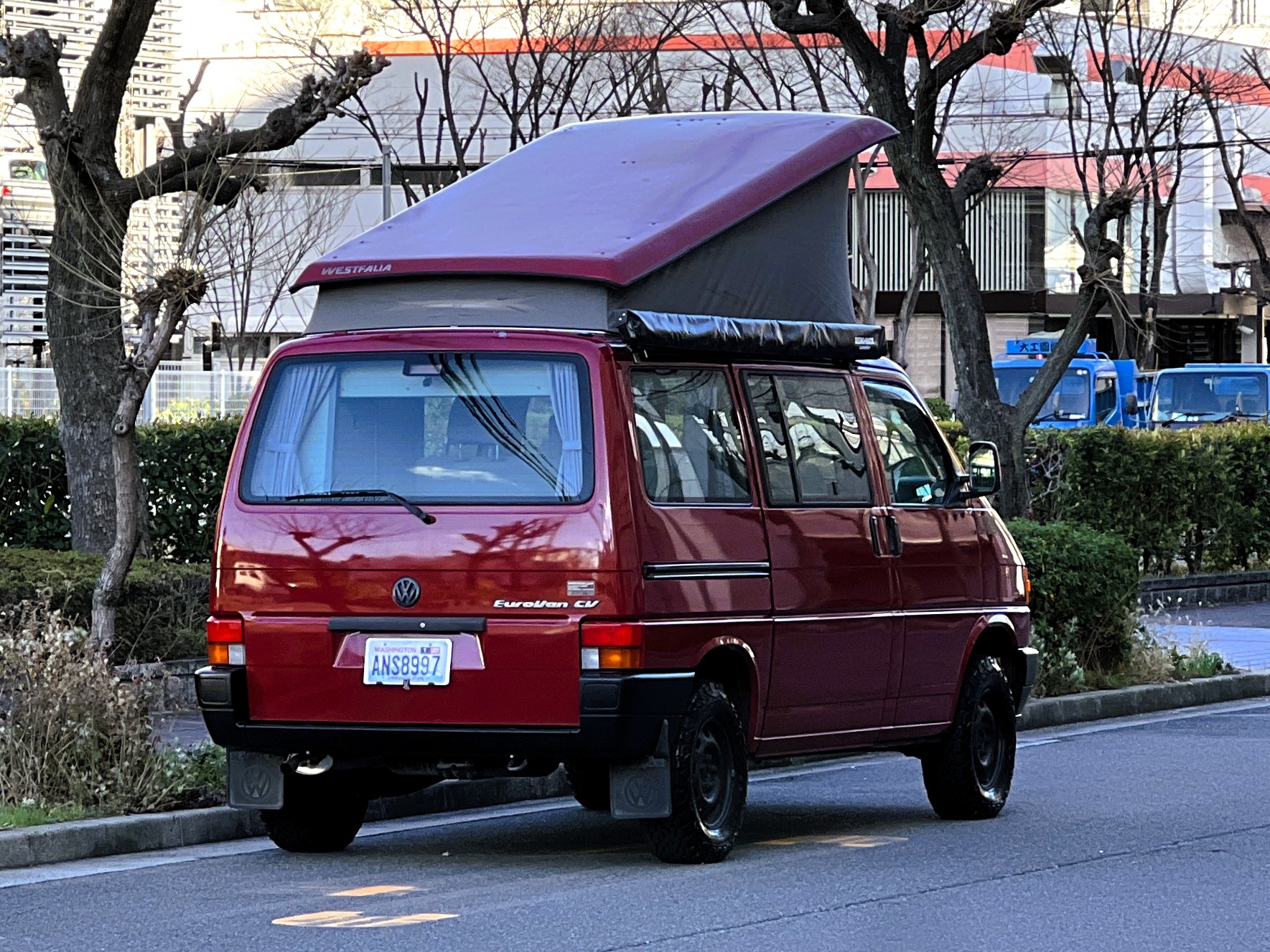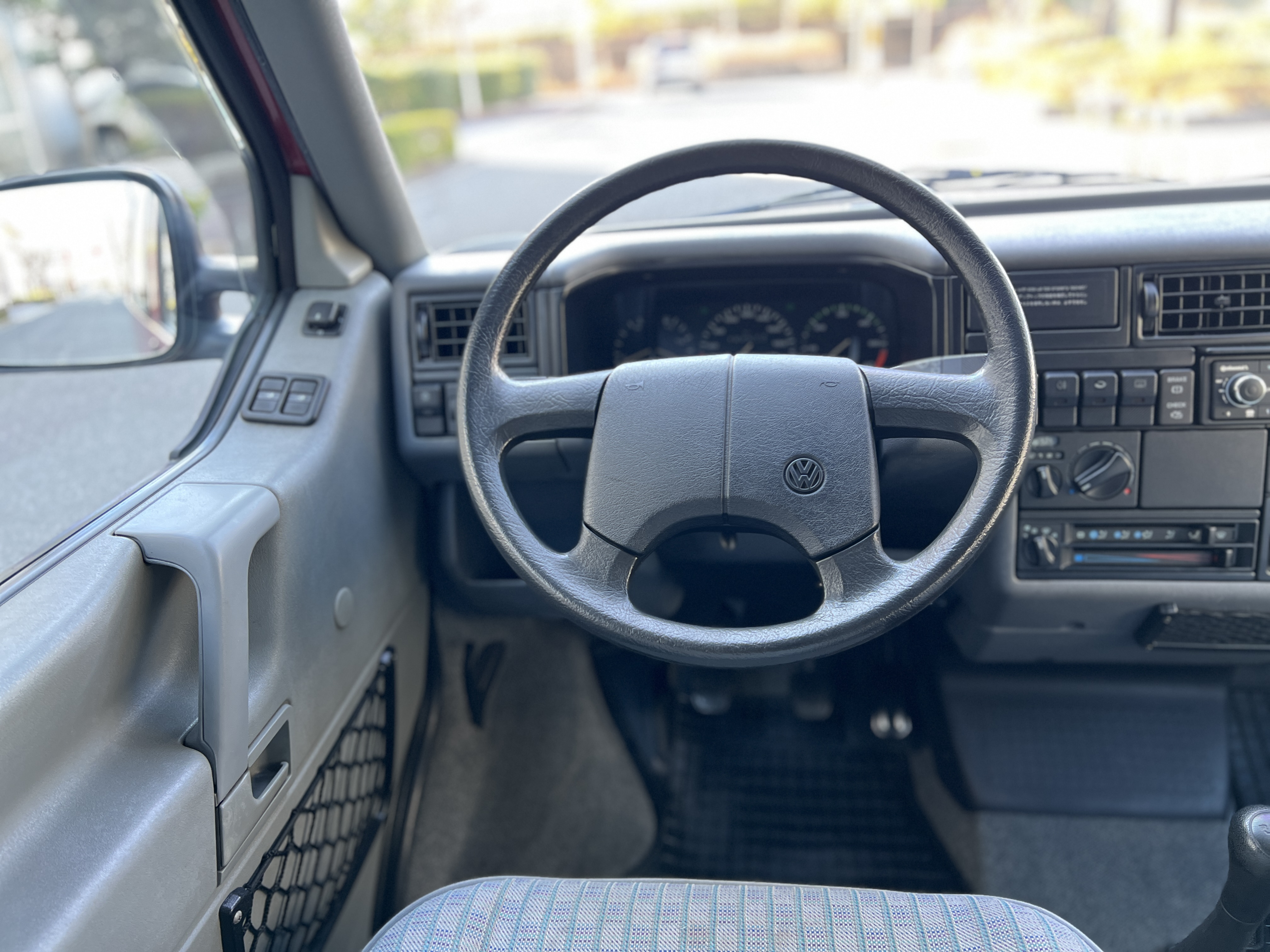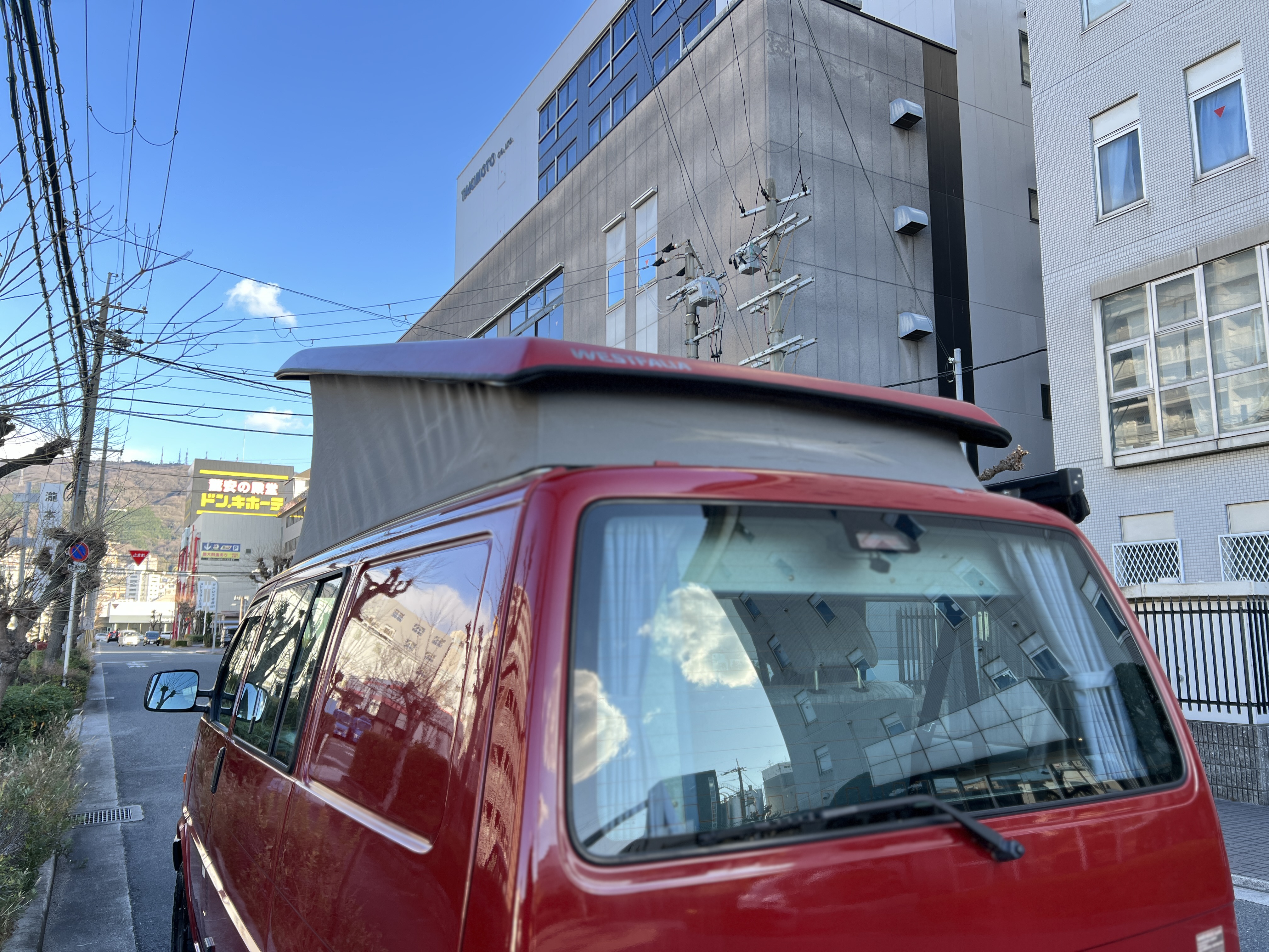 さて、そのWESTYを見ていきましょう♬ まず何といっても、このWESTYの魅力は5速マニュアル車👍 T4は比較的ATのトラブルに悩まされることがありますので、マニュアルという選択は、それだけで大きなメリット◎ そもそもT4はエンジンオーバーホールなんてほとんどありませんので、ある意味、マニュアルとの組み合わせが実は無敵で最強なのかも?!と思ってしまう一台です笑。ボディカラーは、深みと艶のあるボルドーレッド系。そこに合わせた前後の樹脂バンパー、さりげないリフトアップ、スチールホイール&テレーンタイヤの組み合わせで、フィールドが似合う、抜群の“旅バン”スタイルが完成しています👍 リアのマッドフラップがまたいい味出してるんですよね。このあたりのこだわりは、やっぱり好きな人が乗ってた感が出てますね◎ ちなみにこのWESTY、本来は北米仕様のため、フロントバンパーが少し長いロングバージョンなのですが、このT4は欧州仕様のショートタイプに換装済み。つまり、ルックス的には“T4カリフォルニアコーチ仕様”になっているんです◎ ポップアップルーフの前面には一部補修跡があります、使用には問題なしですが気になる方は張り替えなどの対応もご相談OKです◎ そしてサイドオーニングには、ライノラック製のオーニングをチョイス。控えめなのに、センスが光ってますね👍
