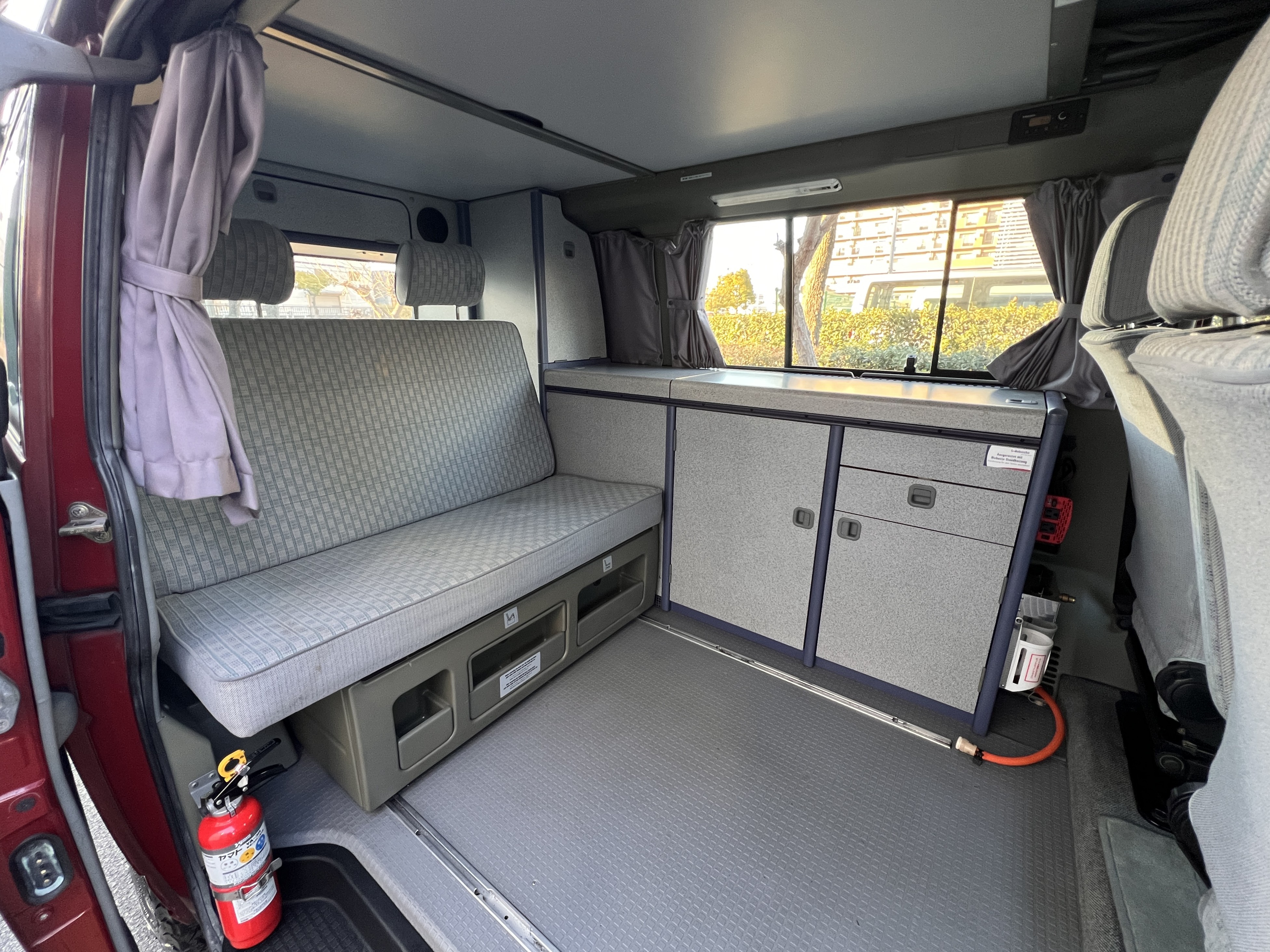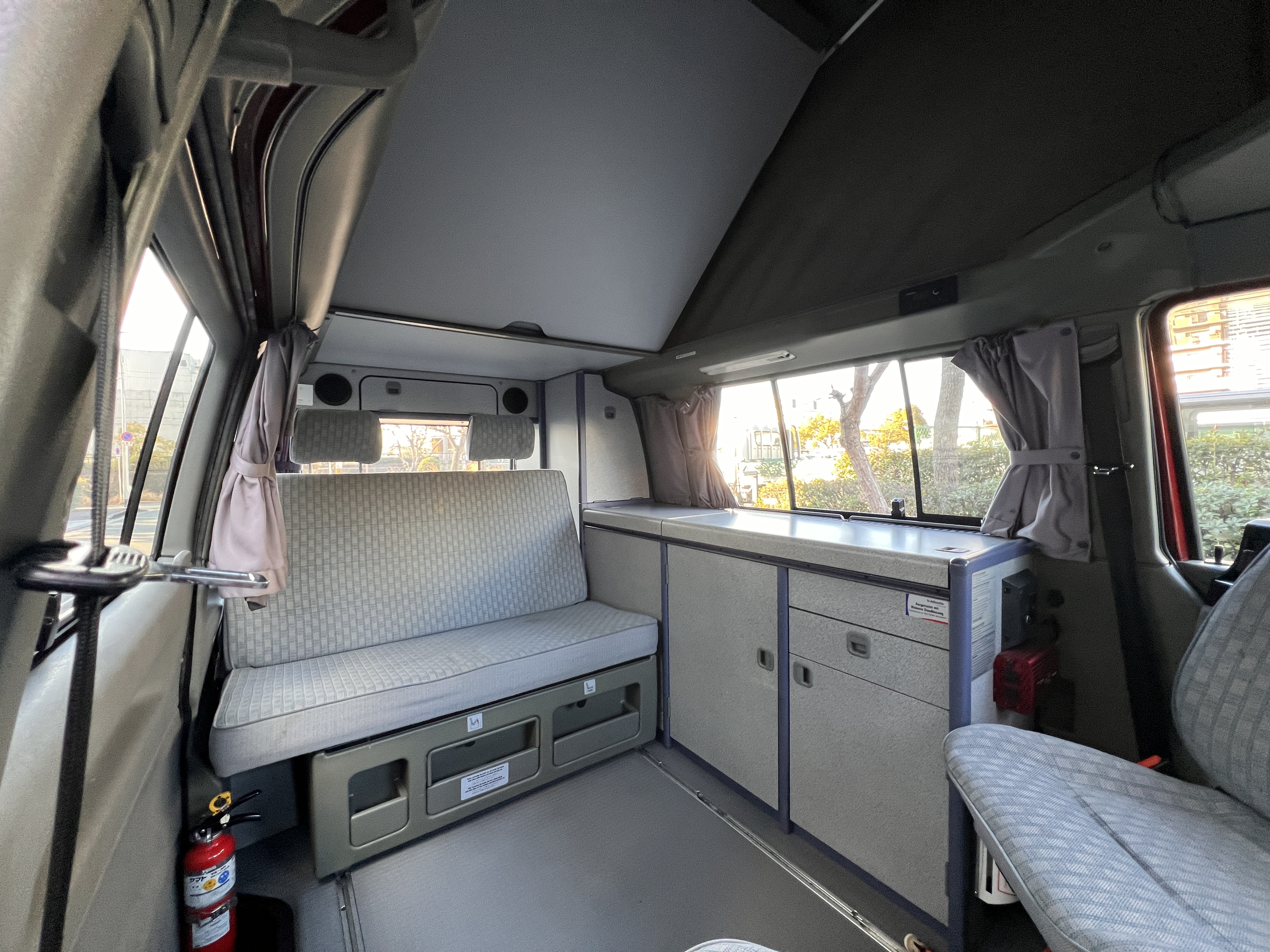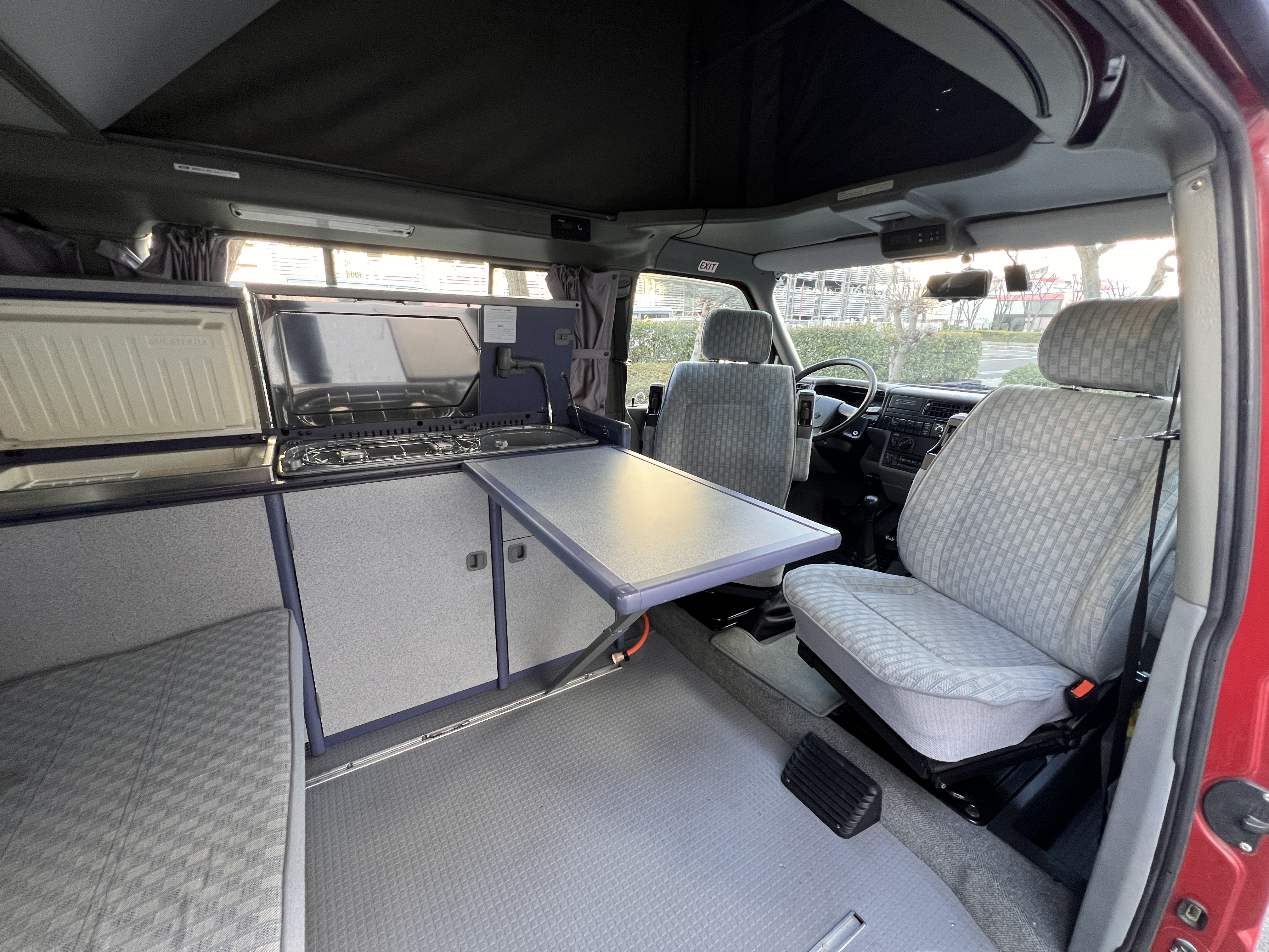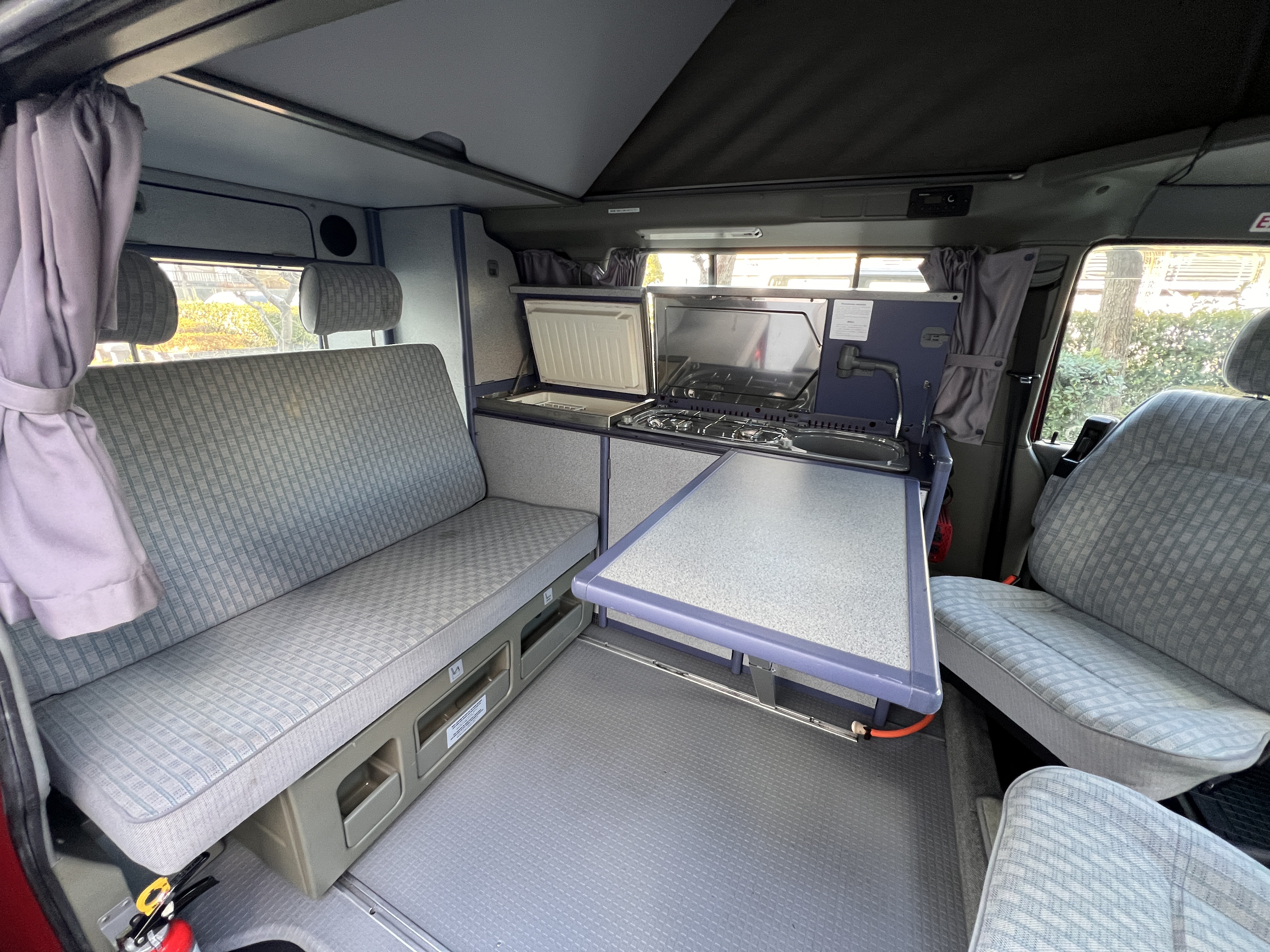お次はインテリア♬ 年式を考えると、かなり清潔感のある車内です。リアシートにうっすらとしたシミこそありますが、全体的にはとてもきれいで気持ちの良い空間です◎ 装備面も魅力たっぷり。シンク・コンロ・冷蔵庫が完備されており、さらに、冬場にも心強いベバスト製のFFヒーターも装備済みで、これはもうテンションMAX状態です👍 二口コンロの左側のノブがガスを保持できないようで、必要であれば部品交換のご相談も可能ですが、最近はコンパクトなカセットコンロなど調理グッズも充実していますので、あえて“アウトドアキッチン”を楽しむスタイルも◎ ちなみに、このコンロはカセットガス仕様に変更済みなので、手軽に・安全に使用できるのも嬉しいポイント。また、小型インバーターも装備されており、スマホやPCの充電などにも便利。ノマドワークにもぴったりです♫ フロントシートは回転式。リアシート座面下に収納されている純正テーブルを設置すれば、そこはもう完全に“動くリビング”👍 お気に入りの川辺や森の中、旅先の静かな駐車場、どこに停めても、その瞬間に“自分だけの場所”が。仕事にも、ひとり時間にも、これ以上ないシチュエーションが完成しちゃいます◎