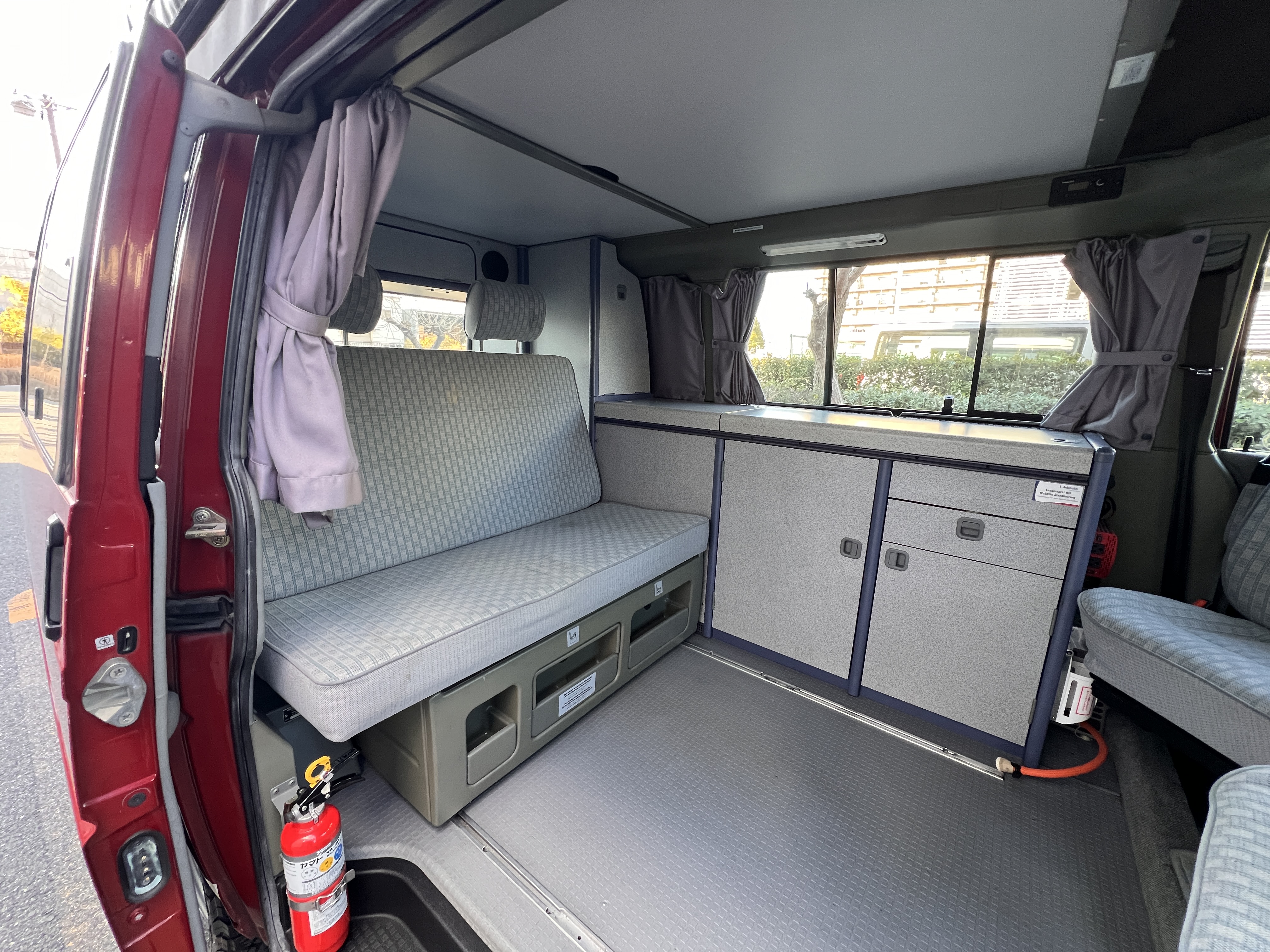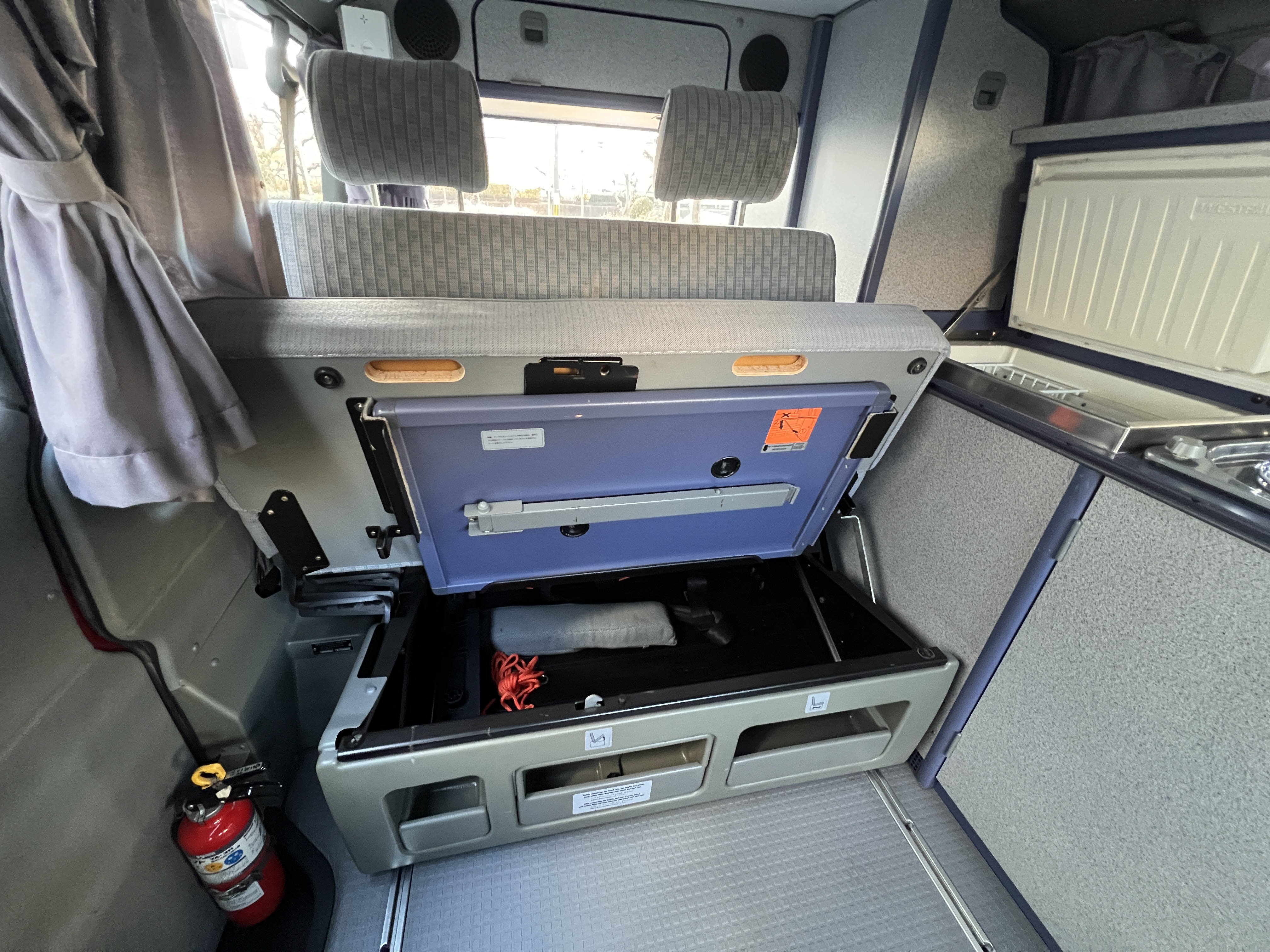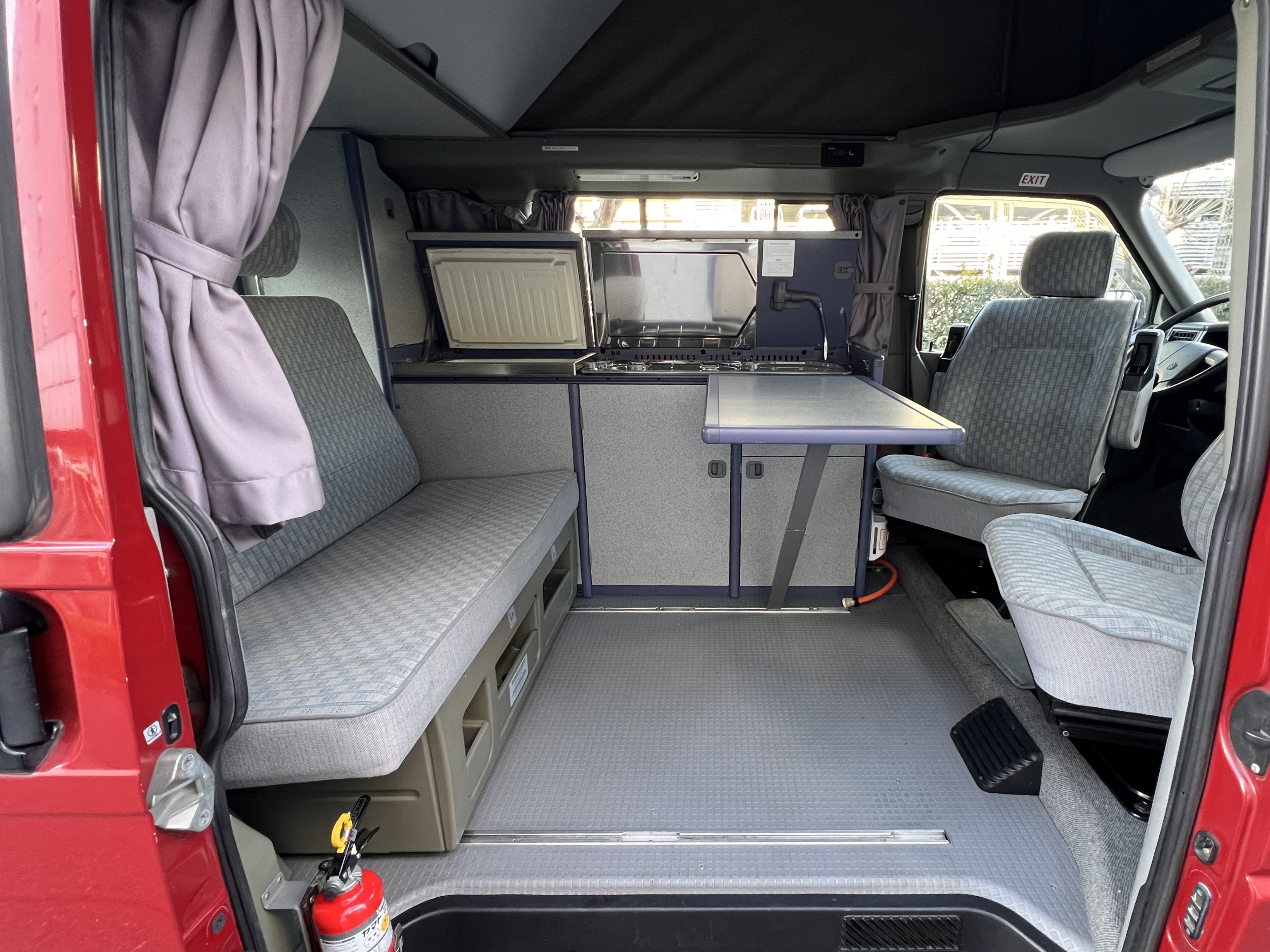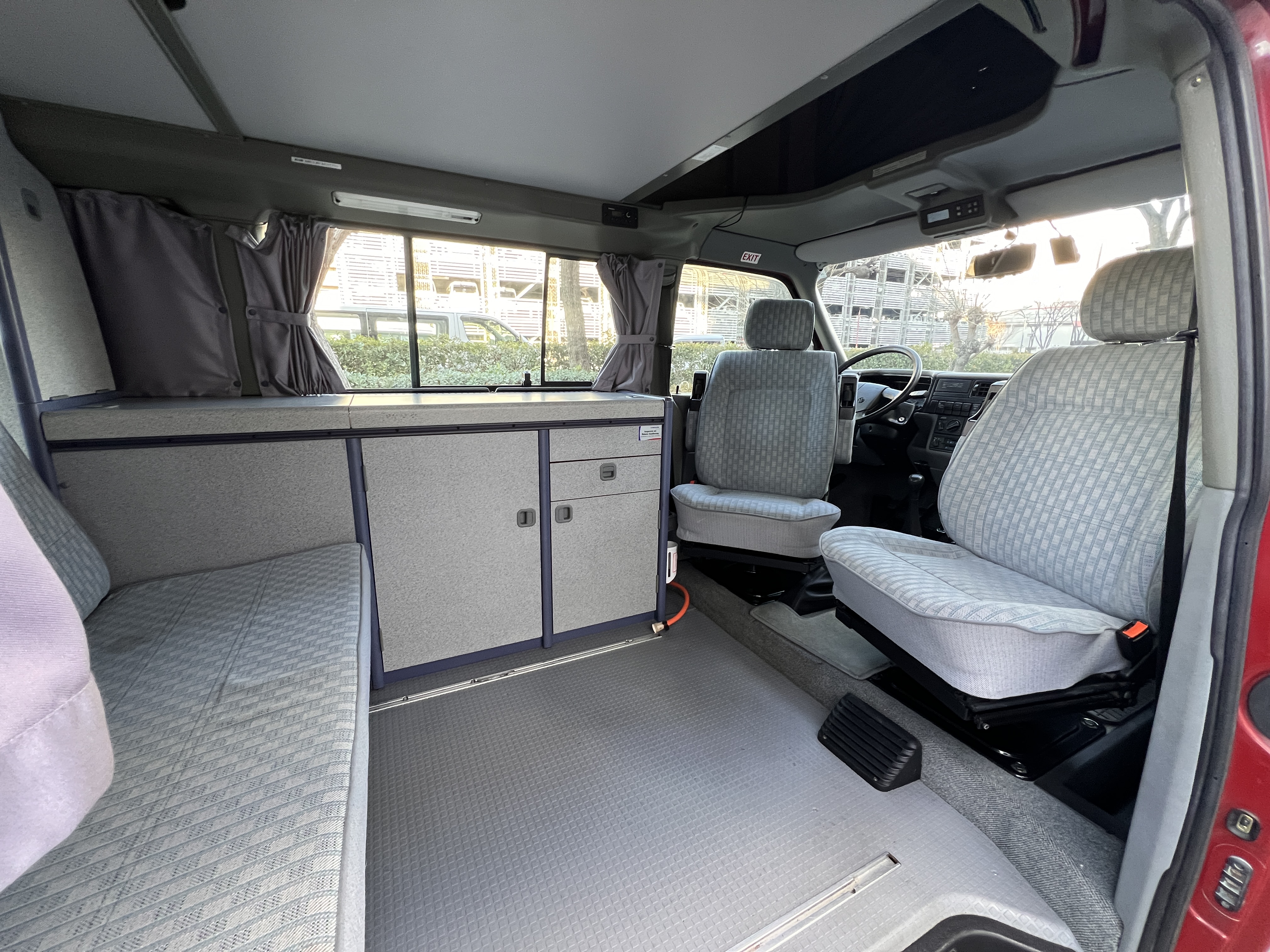 お次はインテリア♬ 年式を考えると、かなり清潔感のある車内です。リアシートにうっすらとしたシミこそありますが、全体的にはとてもきれいで気持ちの良い空間です◎ 装備面も魅力たっぷり。シンク・コンロ・冷蔵庫が完備されており、さらに、冬場にも心強いベバスト製のFFヒーターも装備済みで、これはもうテンションMAX状態です👍 二口コンロの左側のノブがガスを保持できないようで、必要であれば部品交換のご相談も可能ですが、最近はコンパクトなカセットコンロなど調理グッズも充実していますので、あえて“アウトドアキッチン”を楽しむスタイルも◎ ちなみに、このコンロはカセットガス仕様に変更済みなので、手軽に・安全に使用できるのも嬉しいポイント。また、小型インバーターも装備されており、スマホやPCの充電などにも便利。ノマドワークにもぴったりです♫ フロントシートは回転式。リアシート座面下に収納されている純正テーブルを設置すれば、そこはもう完全に“動くリビング”👍 お気に入りの川辺や森の中、旅先の静かな駐車場、どこに停めても、その瞬間に“自分だけの場所”が。仕事にも、ひとり時間にも、これ以上ないシチュエーションが完成しちゃいます◎