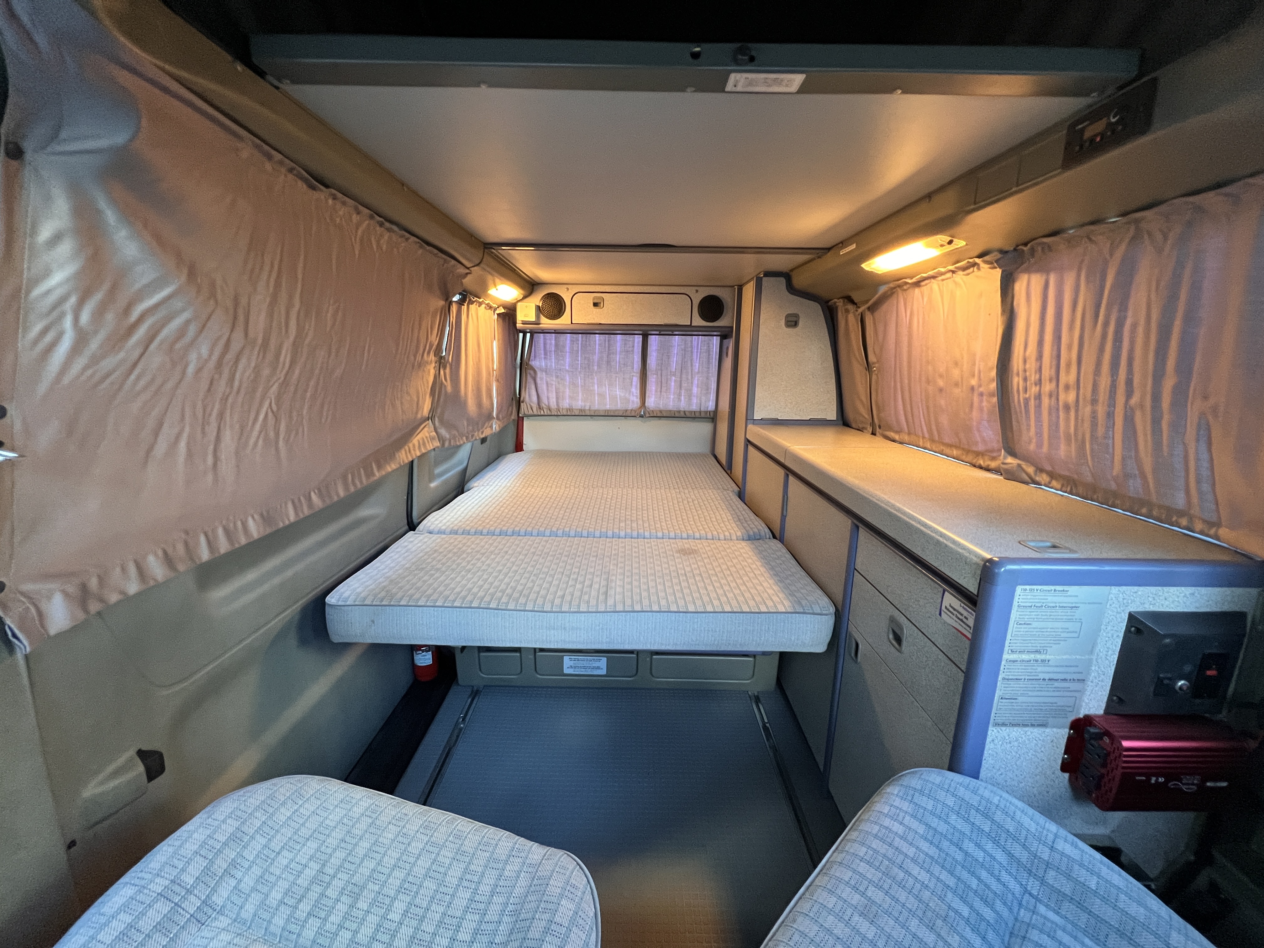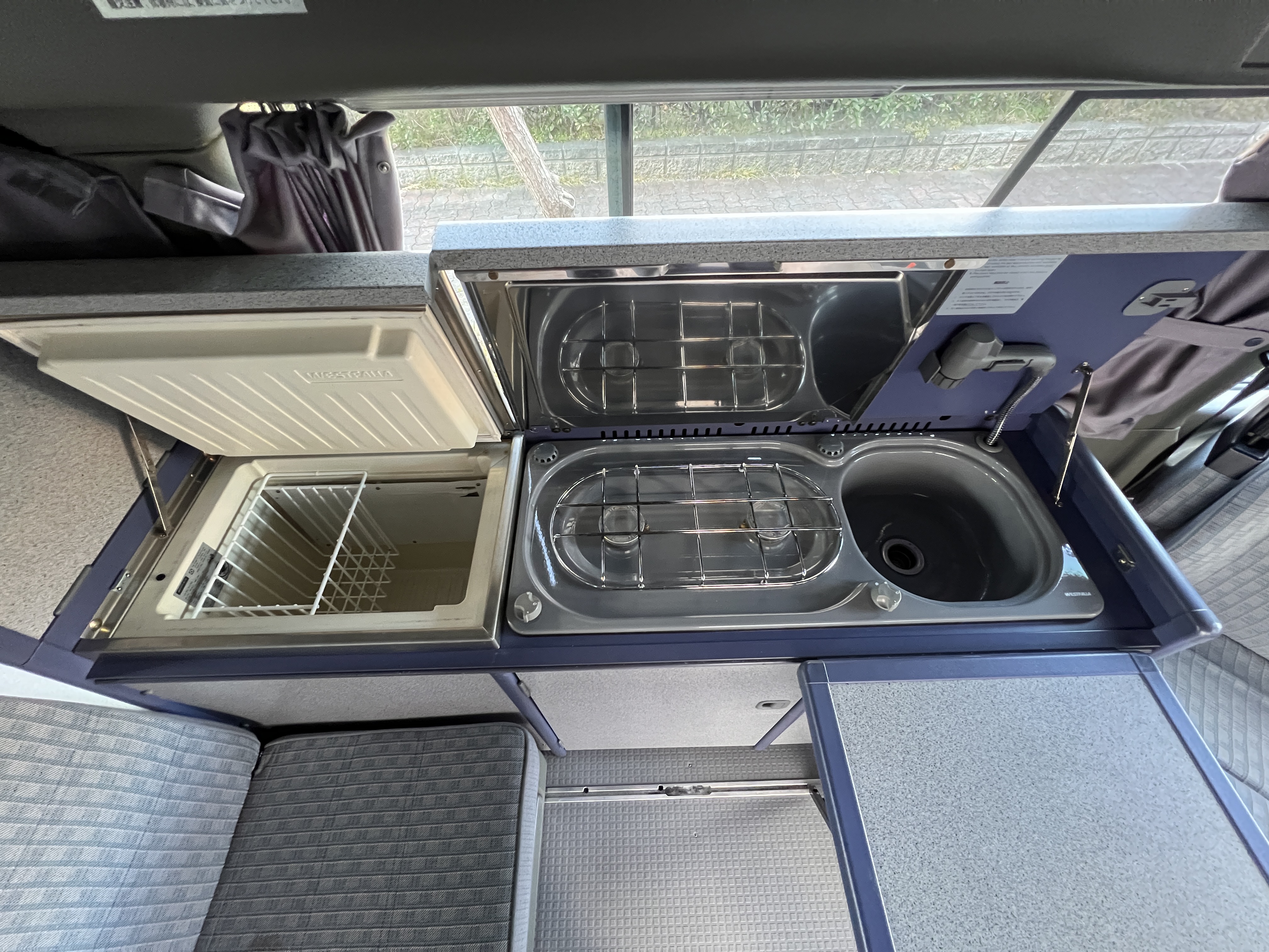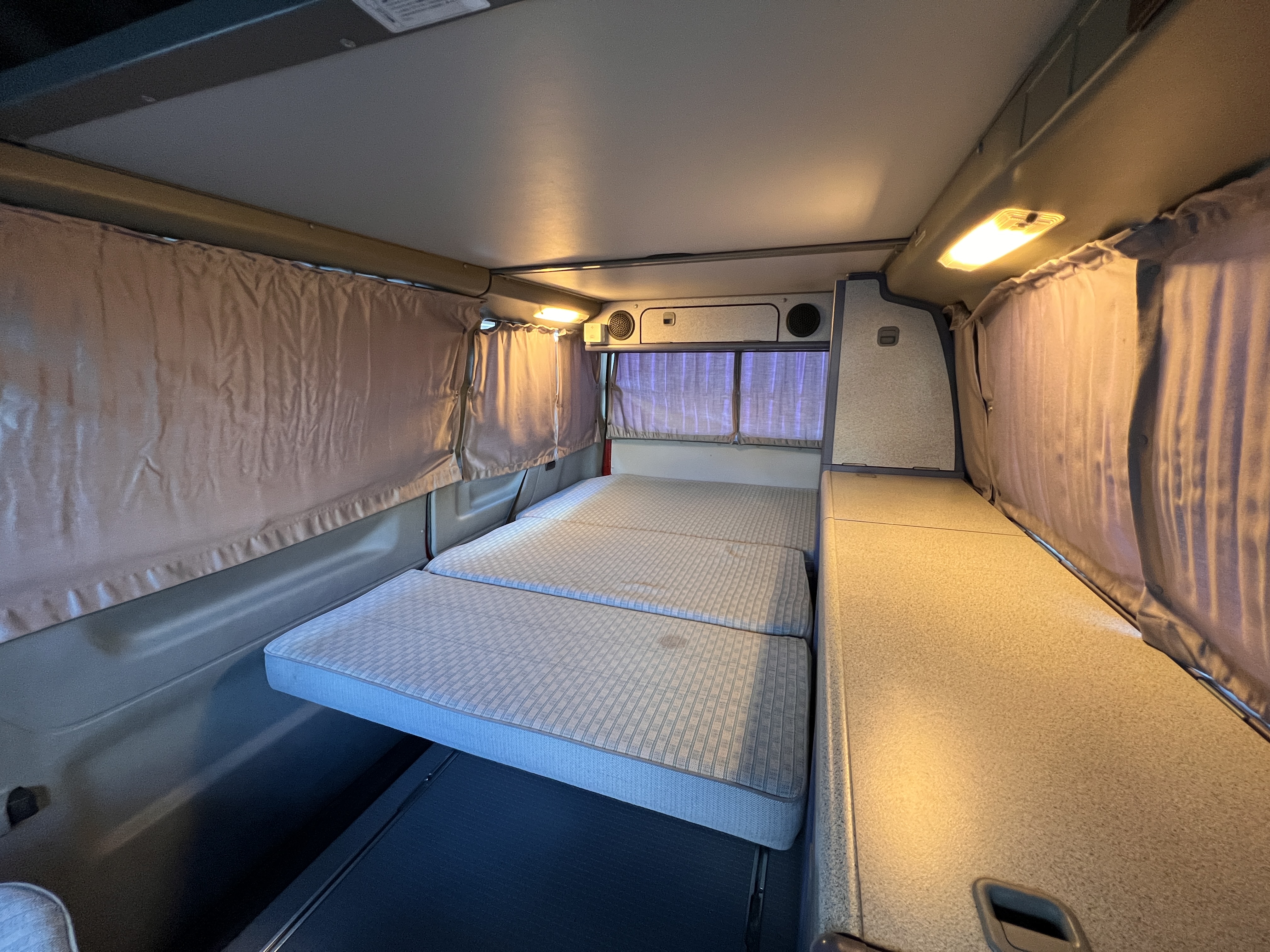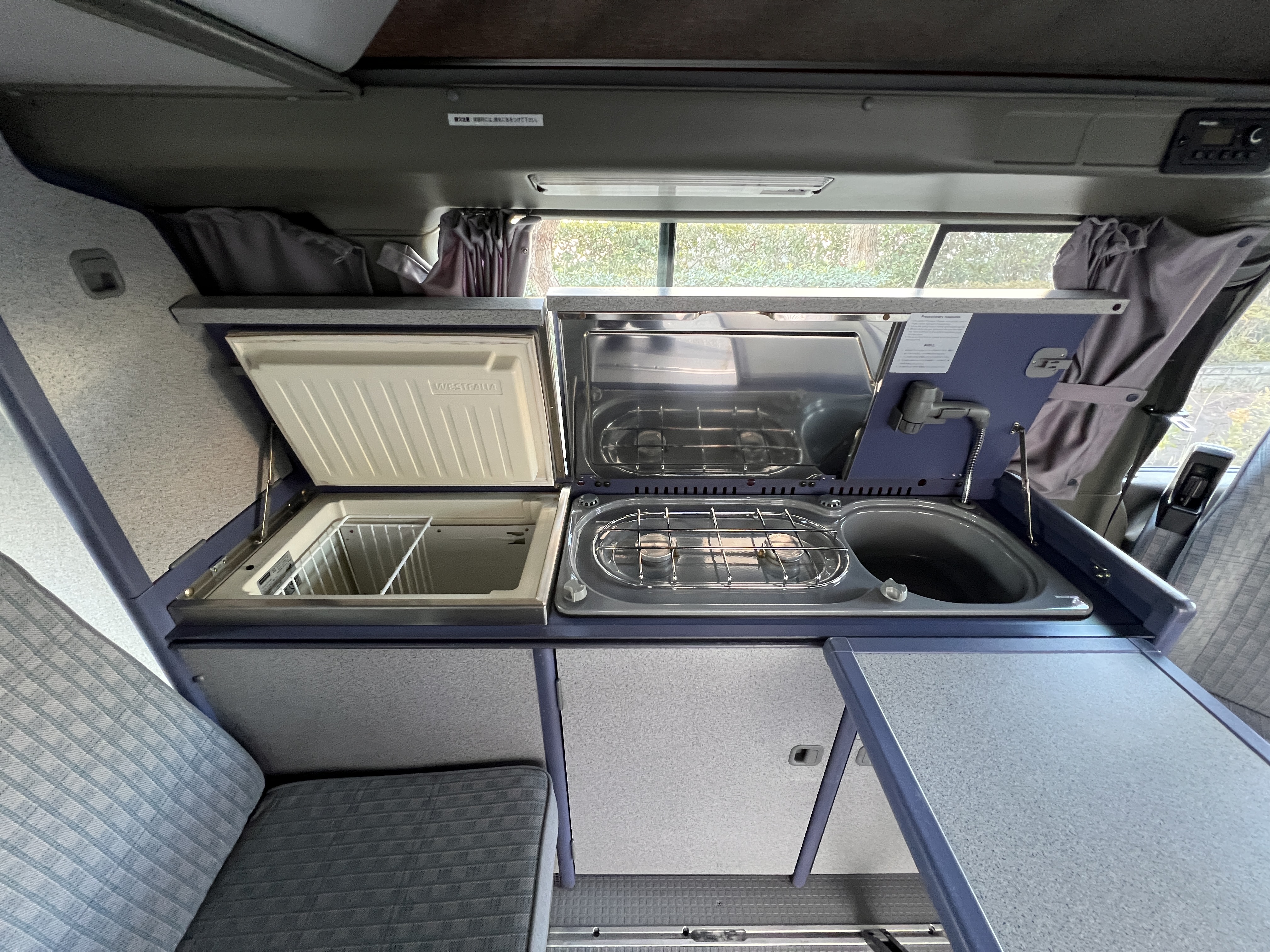 お次はインテリア♬ 年式を考えると、かなり清潔感のある車内です。リアシートにうっすらとしたシミこそありますが、全体的にはとてもきれいで気持ちの良い空間です◎ 装備面も魅力たっぷり。シンク・コンロ・冷蔵庫が完備されており、さらに、冬場にも心強いベバスト製のFFヒーターも装備済みで、これはもうテンションMAX状態です👍 二口コンロの左側のノブがガスを保持できないようで、必要であれば部品交換のご相談も可能ですが、最近はコンパクトなカセットコンロなど調理グッズも充実していますので、あえて“アウトドアキッチン”を楽しむスタイルも◎ ちなみに、このコンロはカセットガス仕様に変更済みなので、手軽に・安全に使用できるのも嬉しいポイント。また、小型インバーターも装備されており、スマホやPCの充電などにも便利。ノマドワークにもぴったりです♫ フロントシートは回転式。リアシート座面下に収納されている純正テーブルを設置すれば、そこはもう完全に“動くリビング”👍 お気に入りの川辺や森の中、旅先の静かな駐車場、どこに停めても、その瞬間に“自分だけの場所”が。仕事にも、ひとり時間にも、これ以上ないシチュエーションが完成しちゃいます◎
