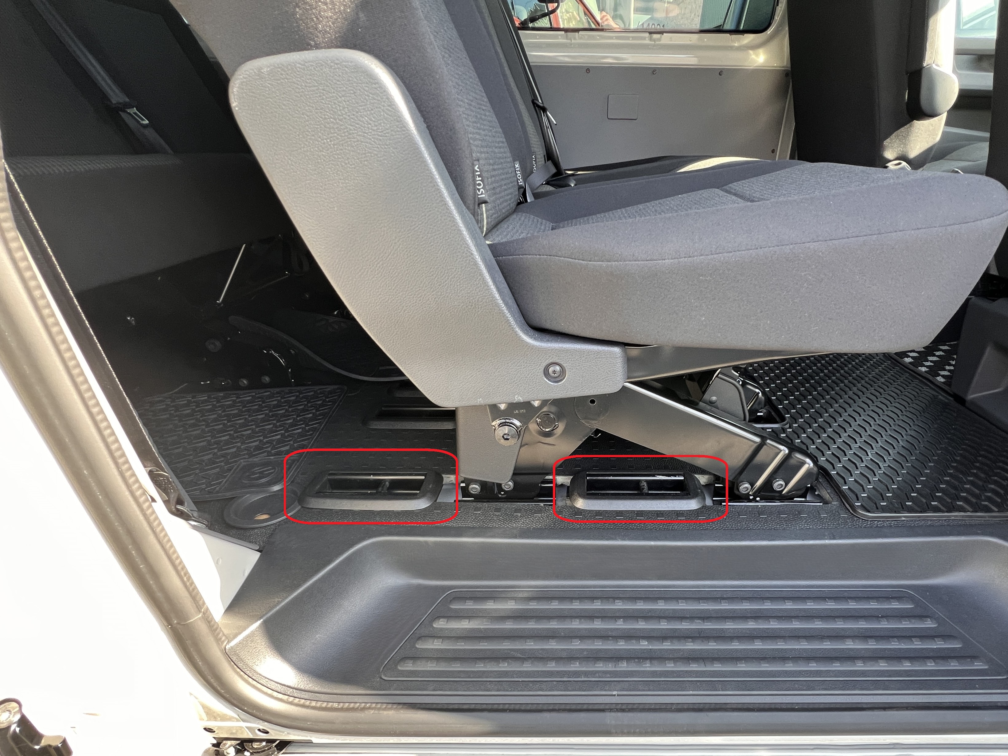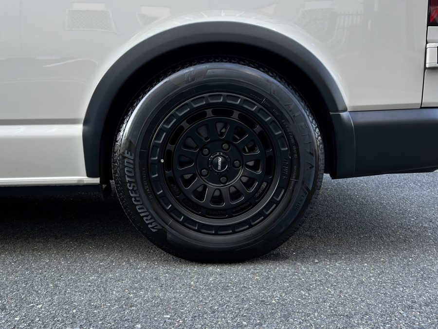 お次はインテリア。これまたベリーグッドコンディションです👍 大変綺麗なうえ、フロント足元にはGAKUYAオリジナルのフロアマットを装着し、清潔感は文句なし◎ 先述のとおり、Aピラーにはまるで標準装備かのように美しく成形されたスピーカーが取り付けられており、さらにドアガラスは、標準よりも分厚い遮音ガラスを後付けインストール。走行中の静粛性が高まり、ドライブと音楽がより快適で楽しい時間になりますね♪ そして、ここからが驚きの仕掛けがふたつ。その1は純正オーディオ前面にワンオフ製作のiPadホルダーを装着。世界にひとつだけの仕様で、充電も問題なく対応。グーグルマップもネトフリもHuluもなんでも楽しめちゃいます◎ もちろんご必要なければ取り外しも可能です。続いて仕掛けその2。なんと、セカンドシートを約15cm後方へスライドバック可能な仕様になっているのです。基本レイアウトは2-3-3の8人乗り。セカンドシートは「2人+1人」が連結された3人掛けベンチ、サードシートも3人掛けのベンチシートですが、8人フル乗車の機会はそう多くないはず。「5人快適に座れれば十分」という発想から、純正部品を使ってシート固定ステーをもう1セット追加。これにより、サードシートを外せば2-3の5人乗り仕様となり、足元に余裕のある、快適なセカンドシートポジションを実現しているのです👍 正直、これはもう開いた口がふさがりません状態です笑。