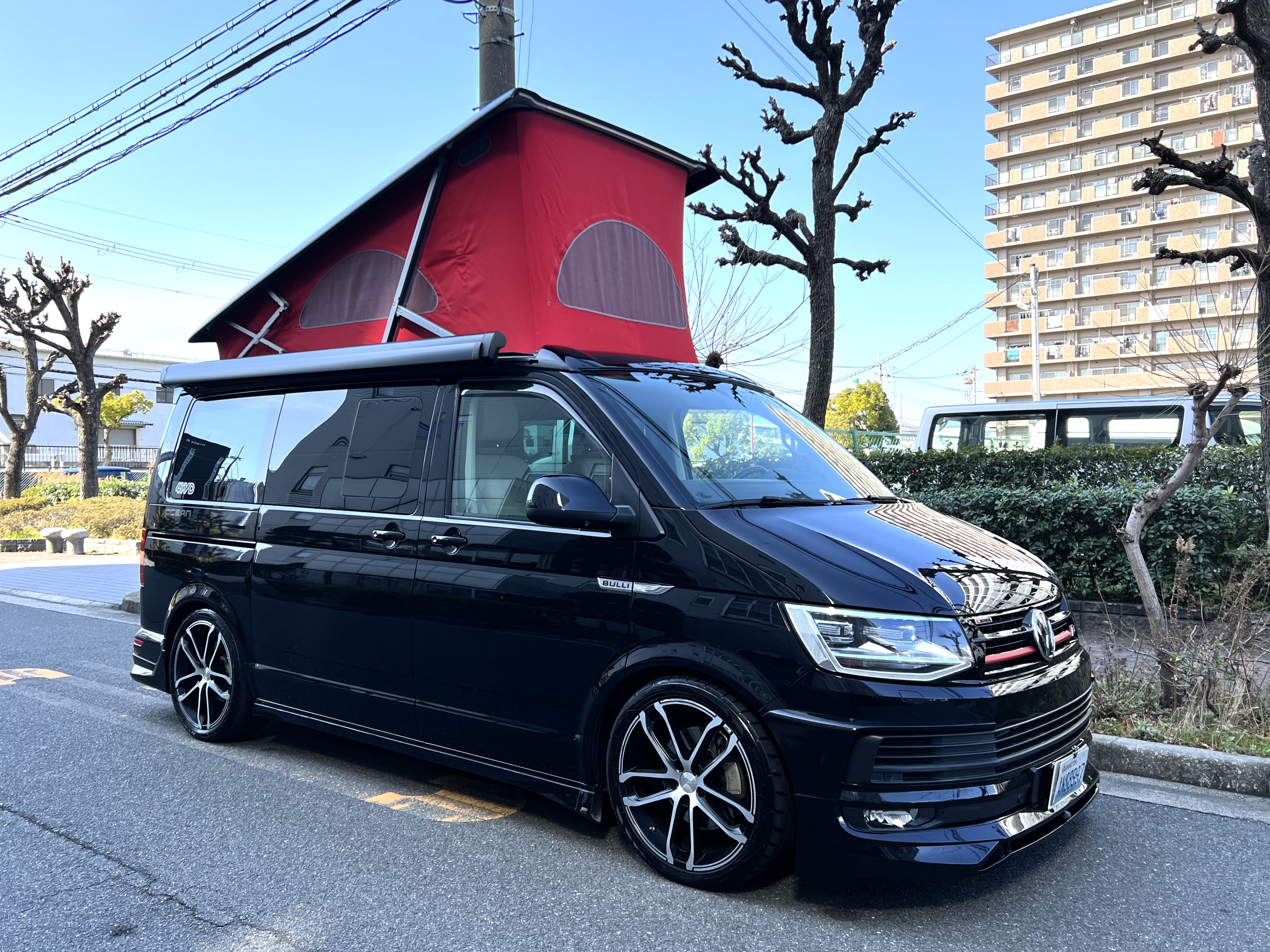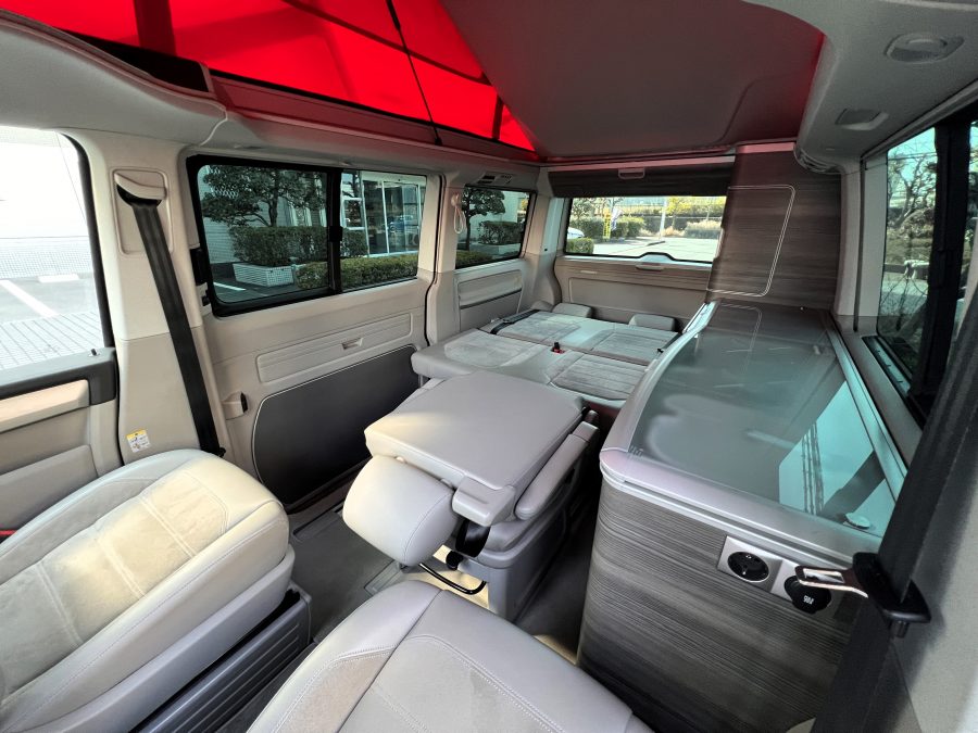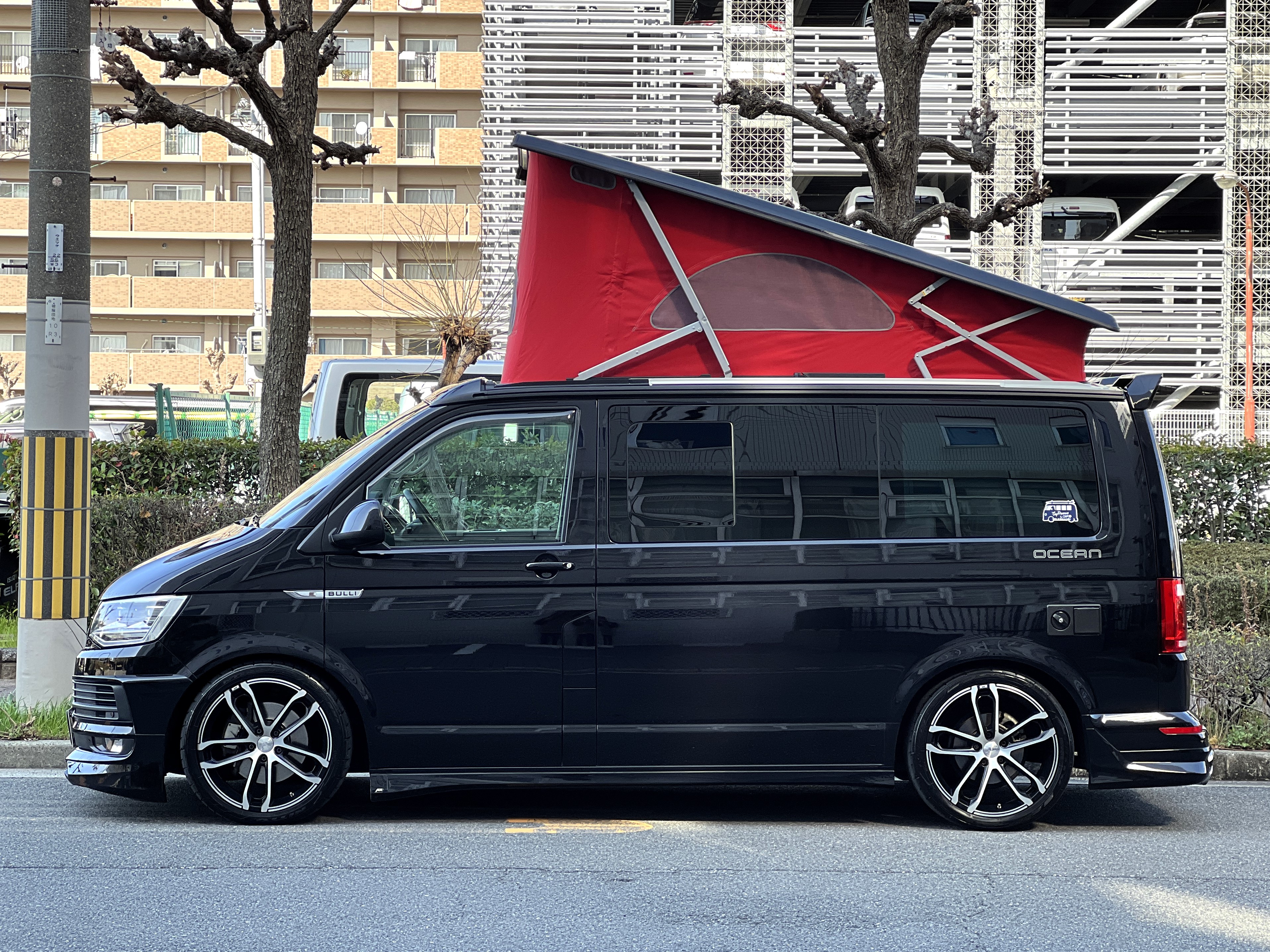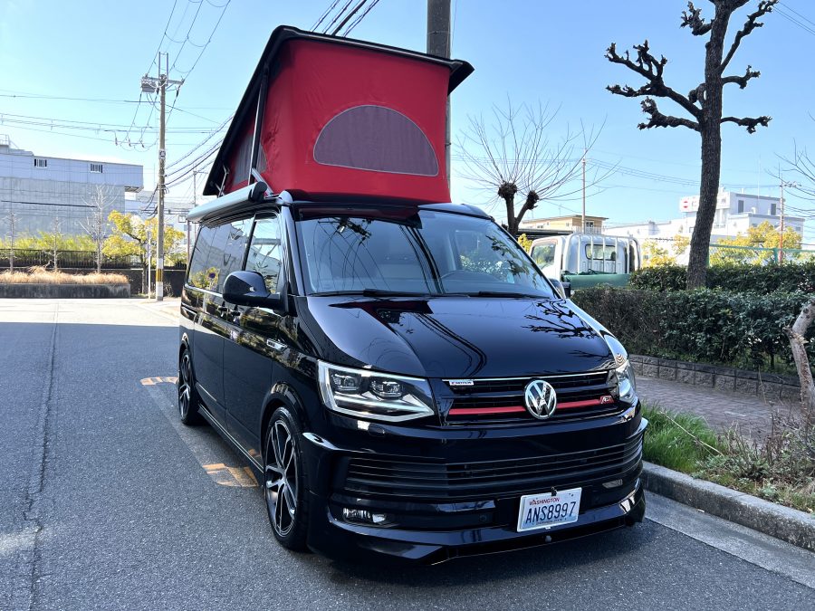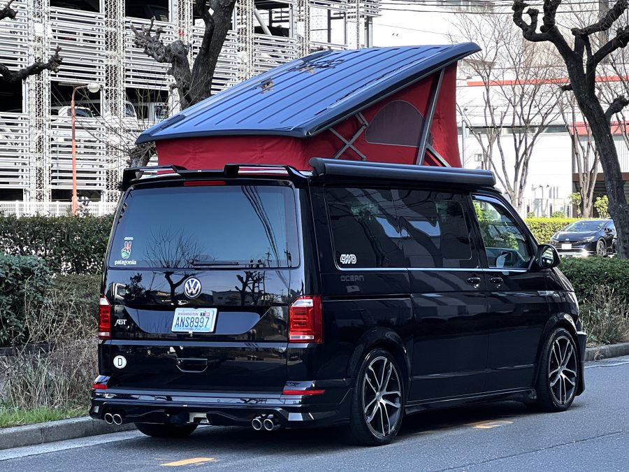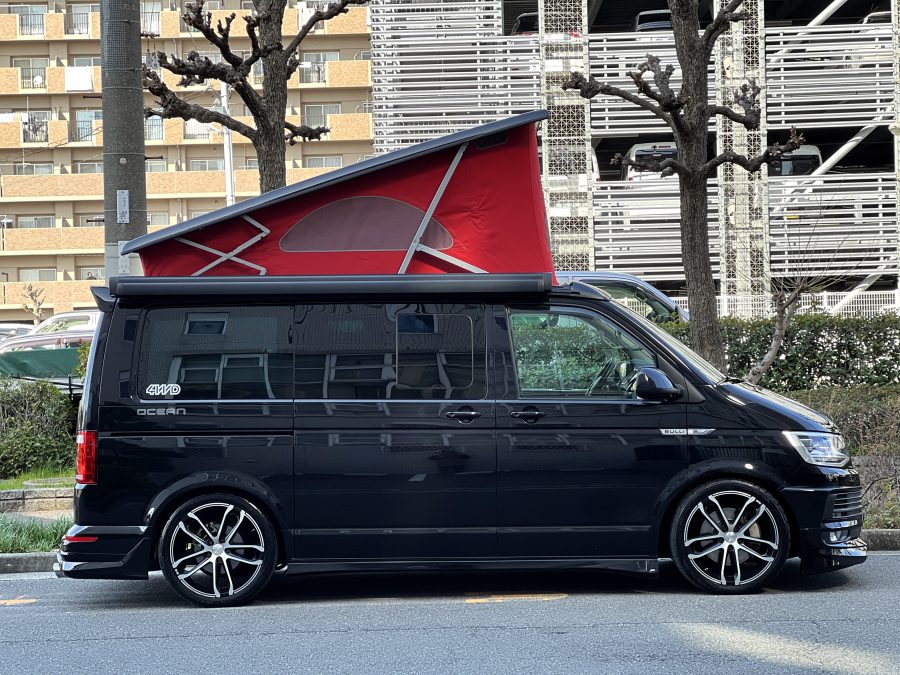 大変珍しい仕様のカリフォルニアオーシャン、登場です♬ 今回ご紹介するのは、ひと味違う特別なカリフォルニアオーシャン。なかなかお目にかかれない仕様で、思わず「おっ」となる一台です。現オーナーさまがこのオーシャンを手にされたのは約6年前。いわゆるキャンプ中心の使い方というよりは、このクルマが持つ“室内の広さ”を活かした別荘感覚の使い方で、全国津々浦々を旅してこられました♫行き先に着けば、そこはもう“もうひとつの自分の部屋”。そんな時間の使い方を、このカリフォルニアとともに楽しまれていたそうです。そしてもうひとつの魅力が、そのスタイル。“ドイツ人が泣いて喜びそうな”仕上がりの雰囲気を楽しみながら、ドライブそのものも満喫されていたとのこと◎ しかし今回、車両整理のため惜しまれつつも手放す決断をされました。「ぜひ、このカリフォルニアを気に入ってもらえたら嬉しいです。」とのコメントをいただいております。さて、そんなドイツ仕込みのオーシャンを見てまいりましょう♫ まず気になるのは、やはりそのルックスでしょう。なんとこのオーシャン、我々世代が憧れたABTスタイルをまとっているのです♫ 足元にもABTの20インチホイール。フロントグリルにはレッドラインが入り、スポーティな印象を演出・・・と思いきや、なんとポップアップルーフの生地もレッドで統一👍 ドイツ人が・・・というよりは、どちらかというとイギリス的なセンスが光る“遊びの効いたコーディネート”かもしれませんね◎ 大径ホイール+やんわりローダウン、そこに上品なエアロをまといながらも、芝生へスッと乗り入れてサイドオーニングを出してポップアップルーフを展開。かと思えば、都会ではビルの谷間を颯爽と駆け抜ける。この“アーバン×アウトドア”の絶妙なバランス感。もしかすると、近い将来日本でもこのスタイルが主流になるのかも?!と思わせてくれる一台です◎ そしてコンディションですが、ボディは新車のような輝き。思わず「ほんとにこの年式?」と疑ってしまうほどキレイです👍 なお、リアエアロのセンターカバーは撮影時点では外れておりますが、現オーナーさまご負担にてしっかり装着してからのお引き渡しとなりますのでご安心くださいませ。