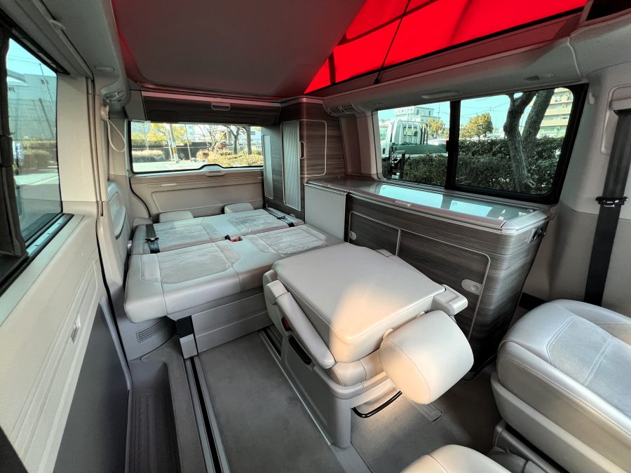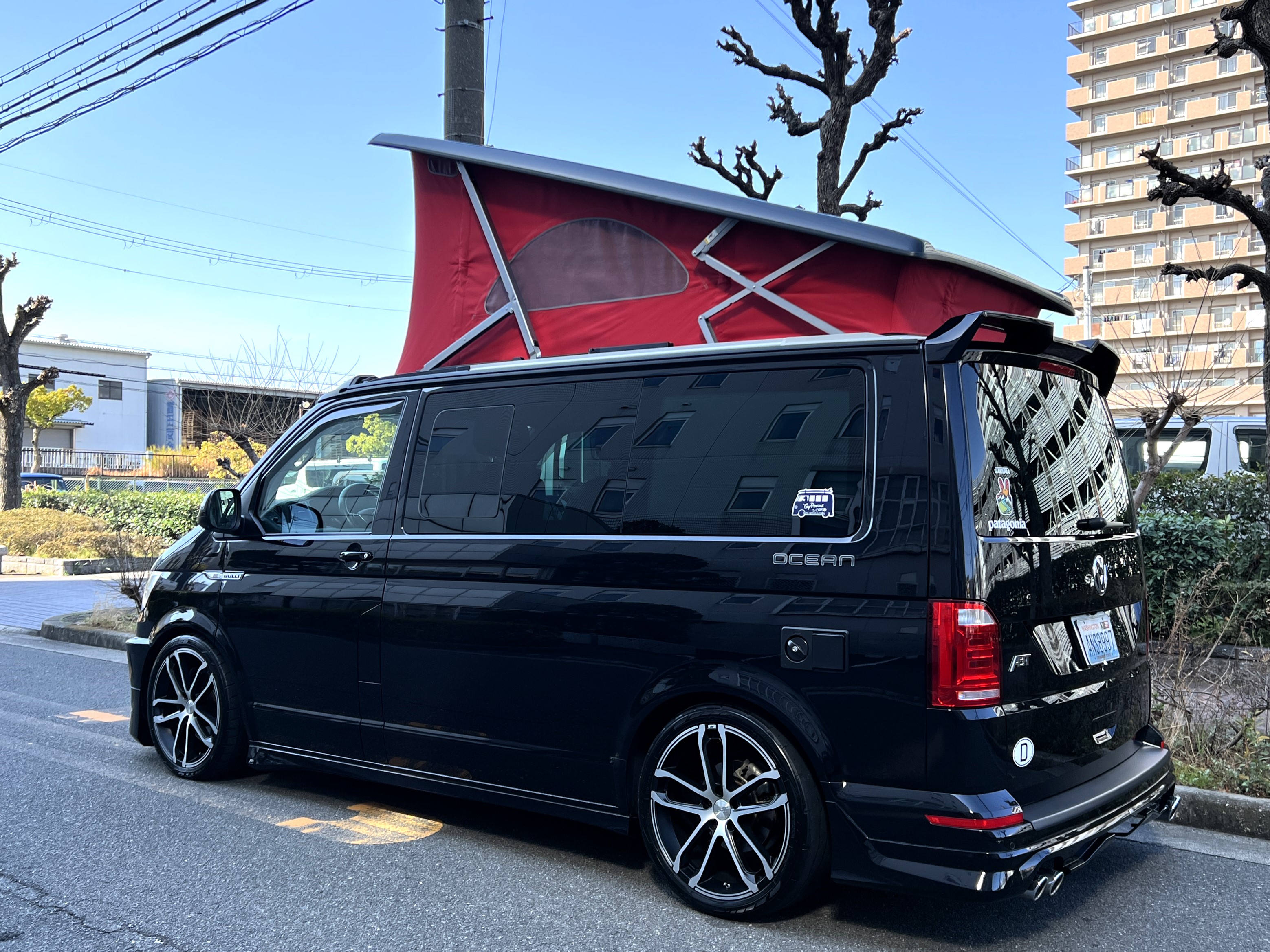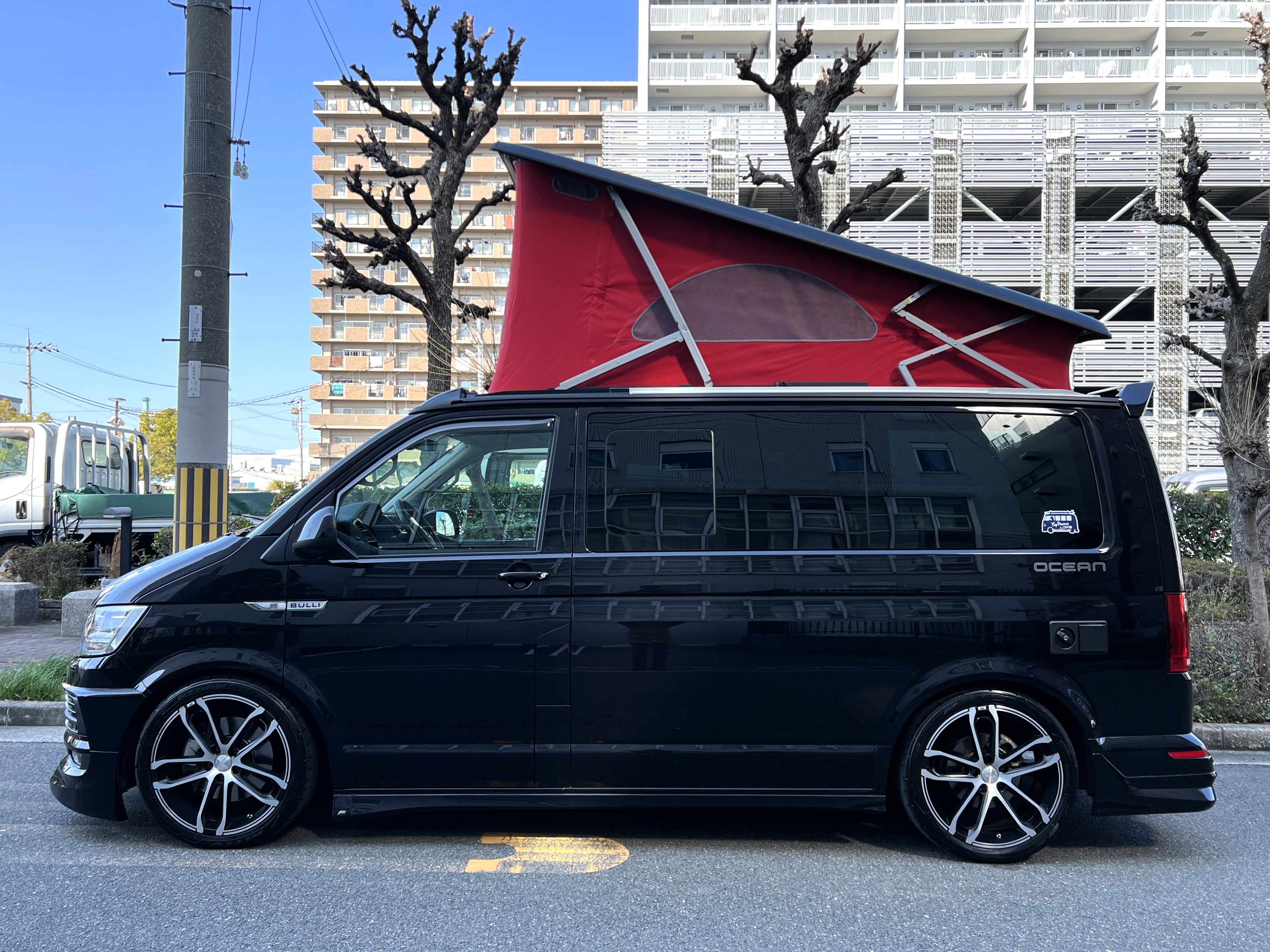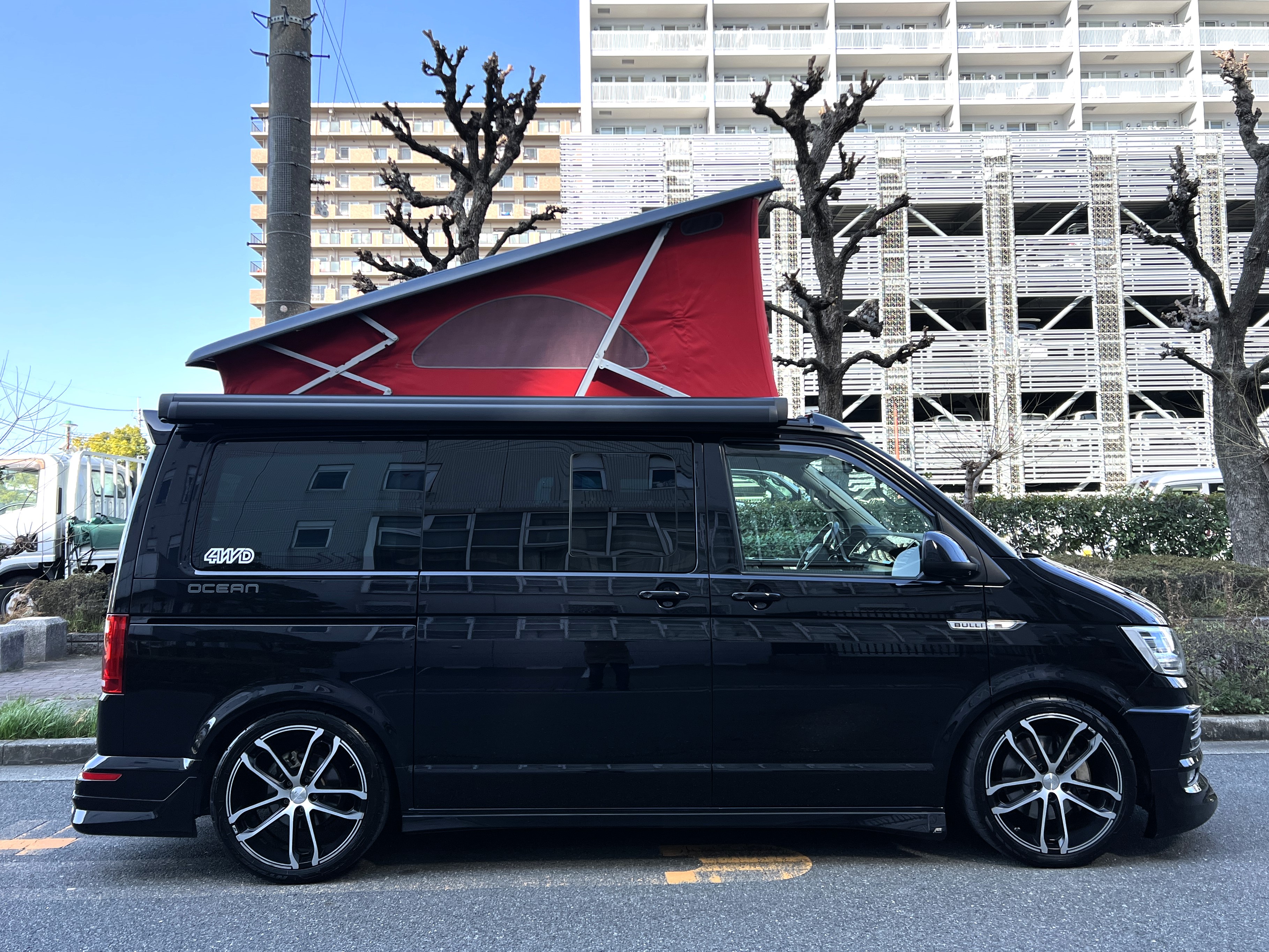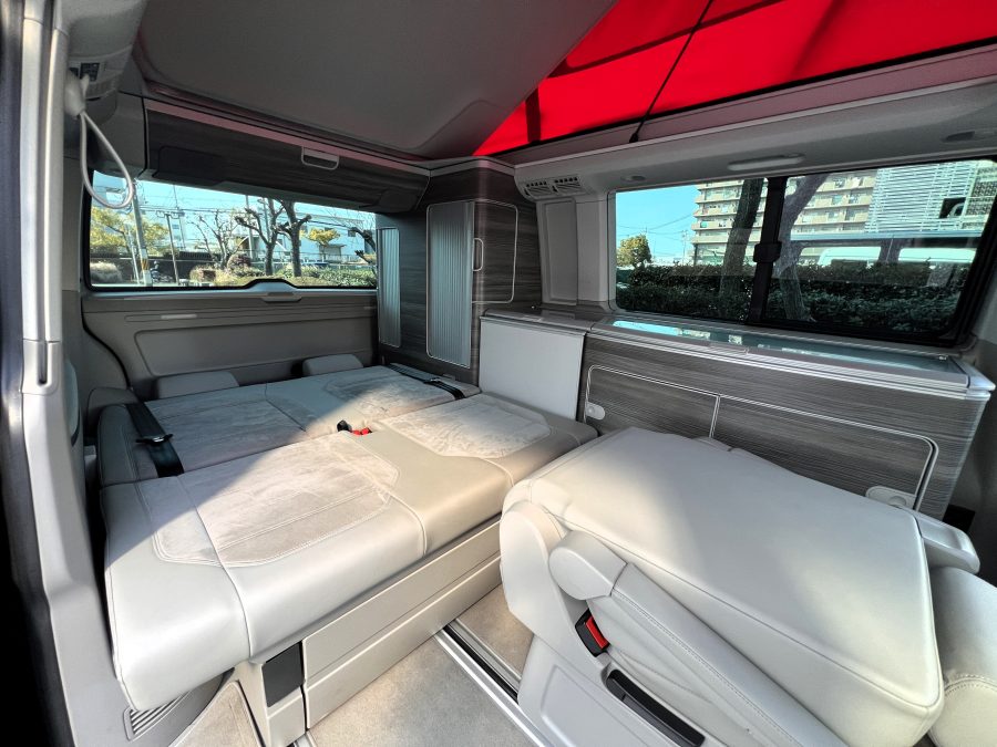 大変珍しい仕様のカリフォルニアオーシャン、登場です♬ 今回ご紹介するのは、ひと味違う特別なカリフォルニアオーシャン。なかなかお目にかかれない仕様で、思わず「おっ」となる一台です。現オーナーさまがこのオーシャンを手にされたのは約6年前。いわゆるキャンプ中心の使い方というよりは、このクルマが持つ“室内の広さ”を活かした別荘感覚の使い方で、全国津々浦々を旅してこられました♫行き先に着けば、そこはもう“もうひとつの自分の部屋”。そんな時間の使い方を、このカリフォルニアとともに楽しまれていたそうです。そしてもうひとつの魅力が、そのスタイル。“ドイツ人が泣いて喜びそうな”仕上がりの雰囲気を楽しみながら、ドライブそのものも満喫されていたとのこと◎ しかし今回、車両整理のため惜しまれつつも手放す決断をされました。「ぜひ、このカリフォルニアを気に入ってもらえたら嬉しいです。」とのコメントをいただいております。さて、そんなドイツ仕込みのオーシャンを見てまいりましょう♫ まず気になるのは、やはりそのルックスでしょう。なんとこのオーシャン、我々世代が憧れたABTスタイルをまとっているのです♫ 足元にもABTの20インチホイール。フロントグリルにはレッドラインが入り、スポーティな印象を演出・・・と思いきや、なんとポップアップルーフの生地もレッドで統一👍 ドイツ人が・・・というよりは、どちらかというとイギリス的なセンスが光る“遊びの効いたコーディネート”かもしれませんね◎ 大径ホイール+やんわりローダウン、そこに上品なエアロをまといながらも、芝生へスッと乗り入れてサイドオーニングを出してポップアップルーフを展開。かと思えば、都会ではビルの谷間を颯爽と駆け抜ける。この“アーバン×アウトドア”の絶妙なバランス感。もしかすると、近い将来日本でもこのスタイルが主流になるのかも?!と思わせてくれる一台です◎ そしてコンディションですが、ボディは新車のような輝き。思わず「ほんとにこの年式?」と疑ってしまうほどキレイです👍 なお、リアエアロのセンターカバーは撮影時点では外れておりますが、現オーナーさまご負担にてしっかり装着してからのお引き渡しとなりますのでご安心くださいませ。