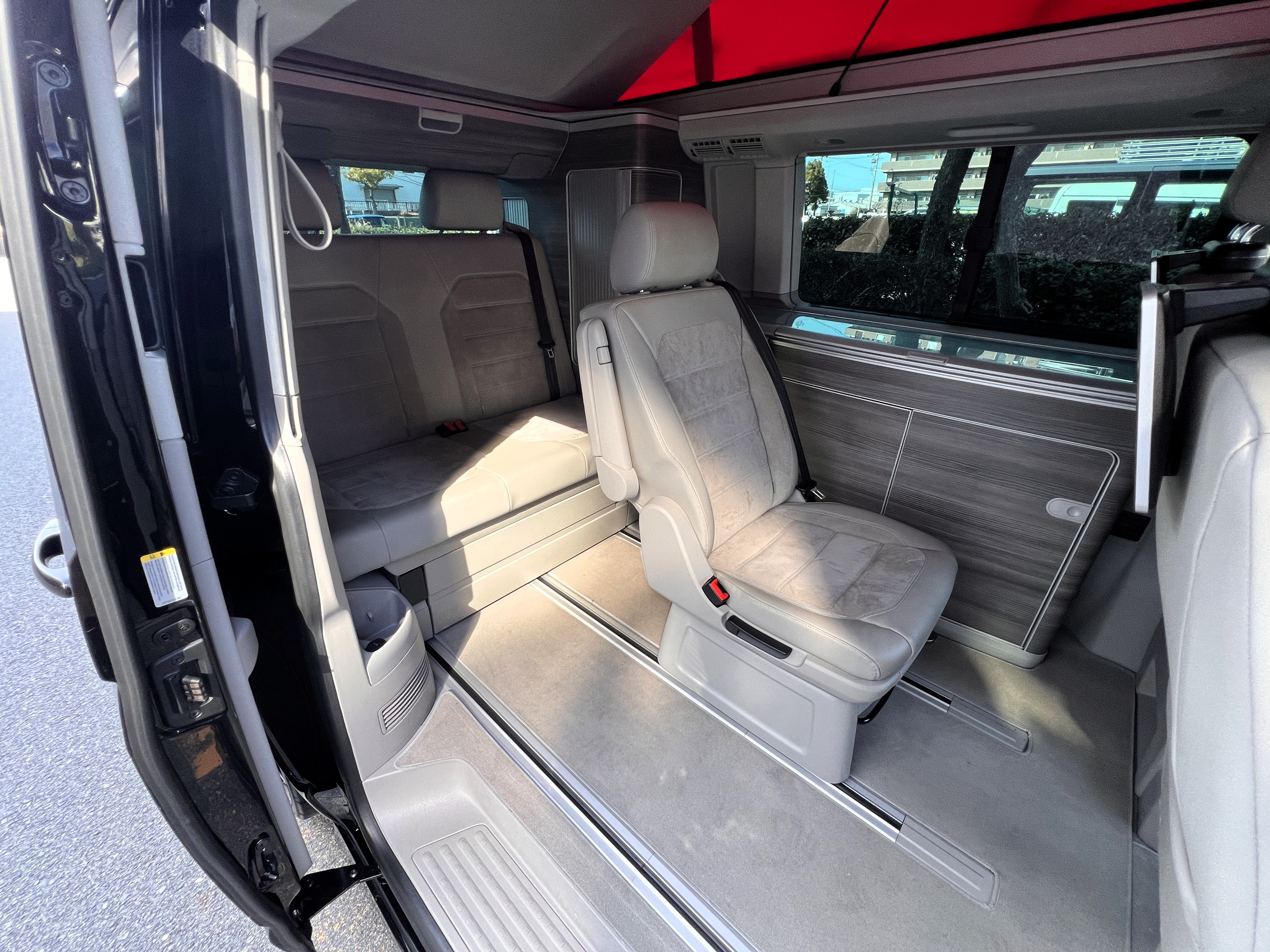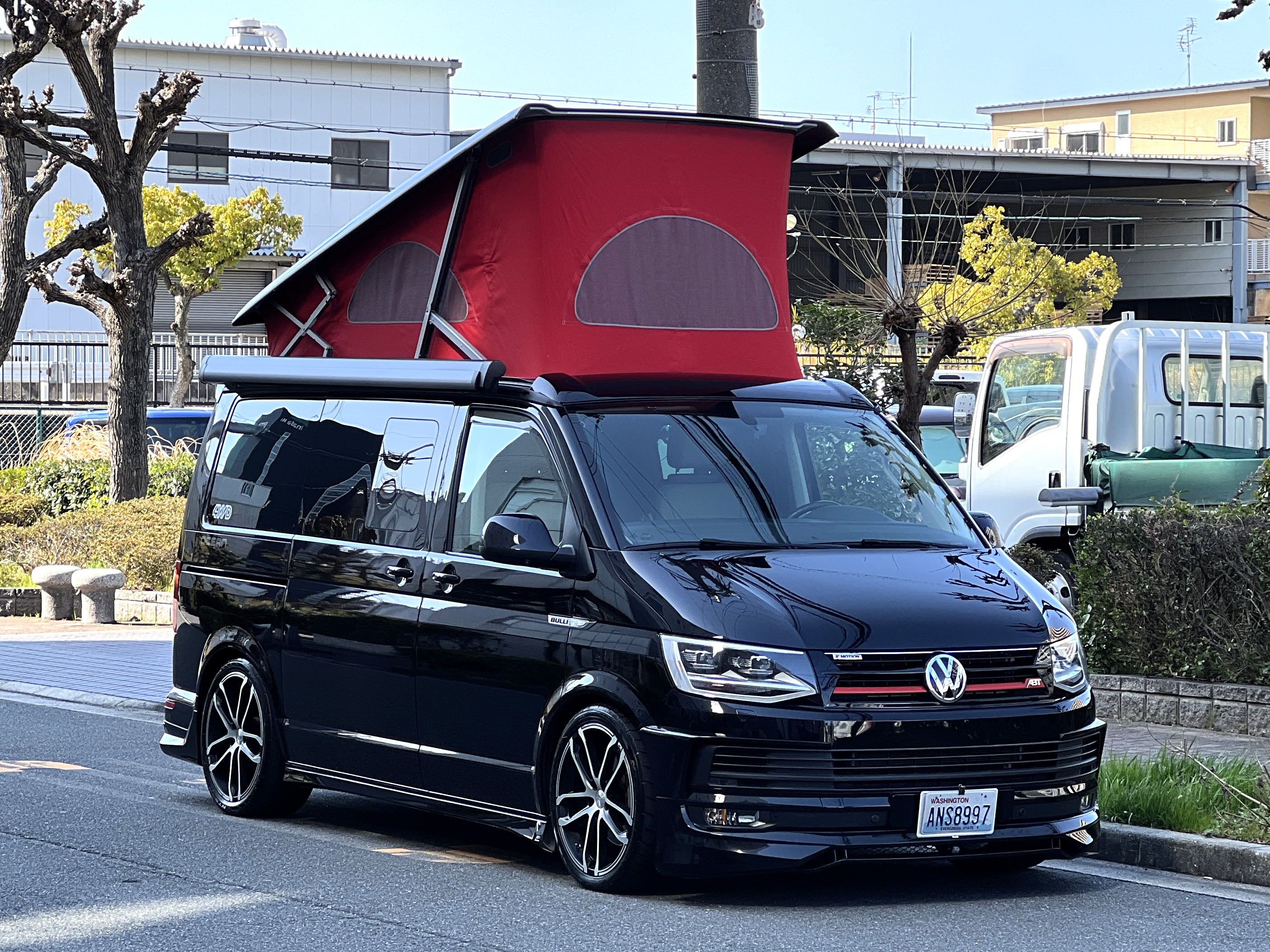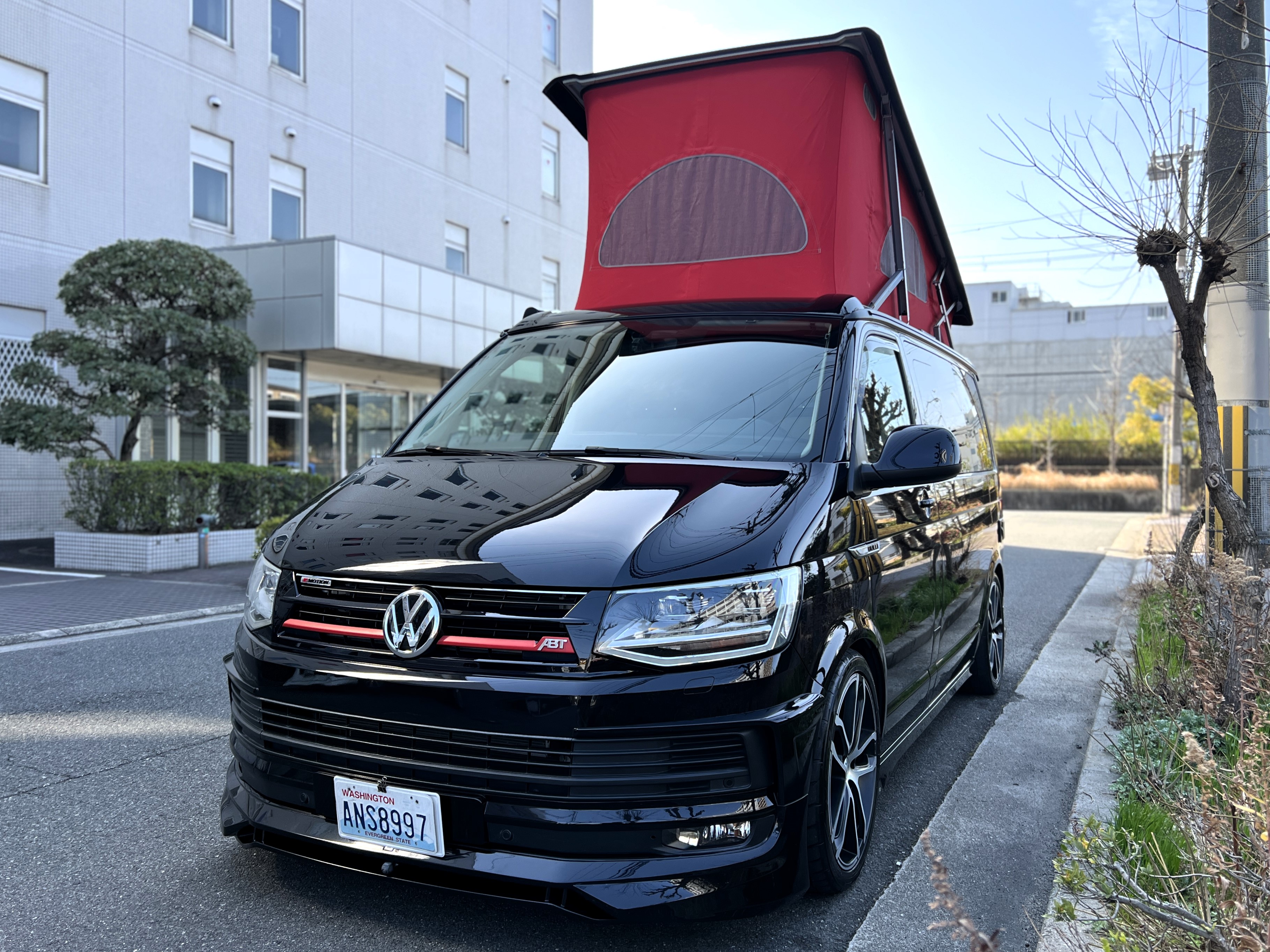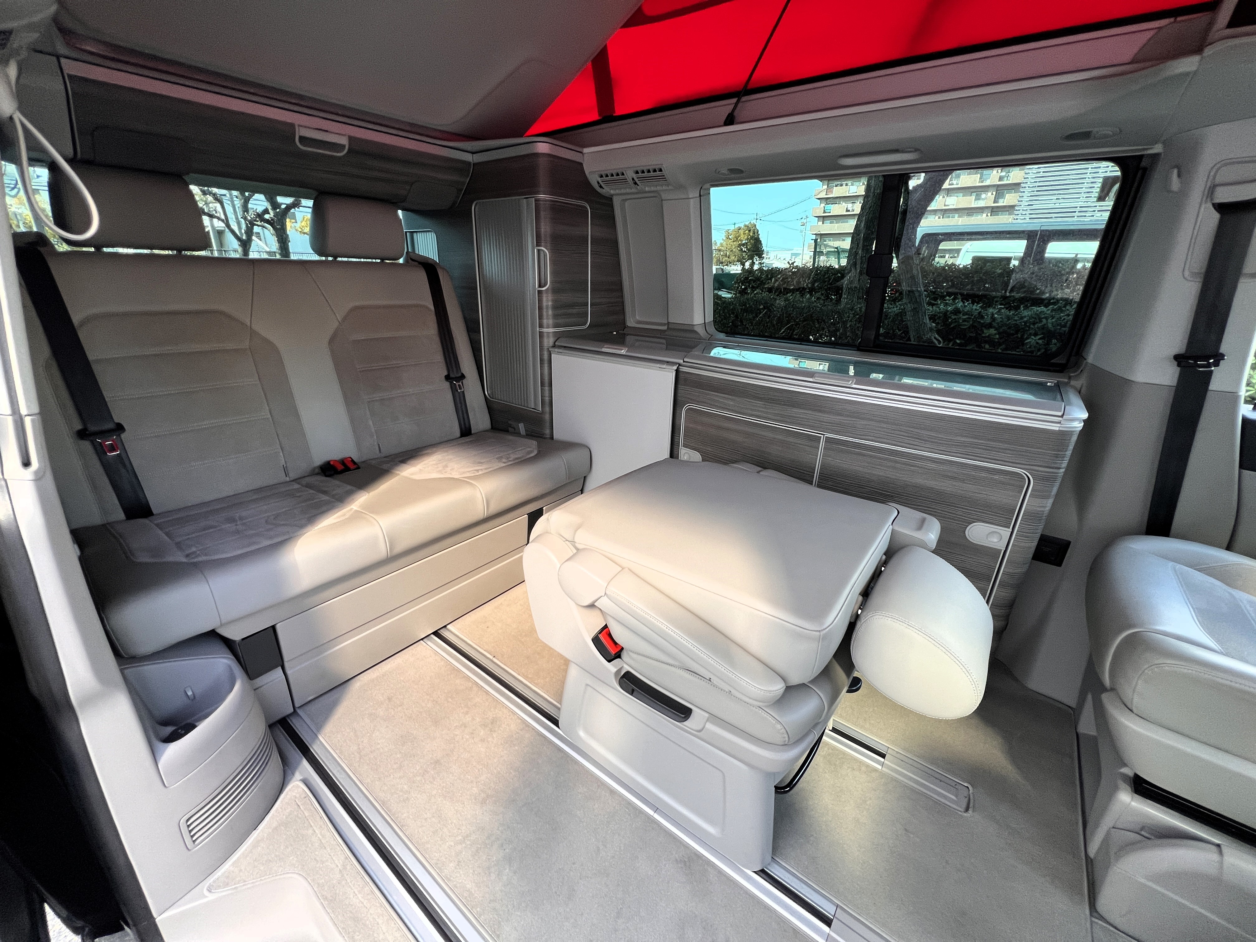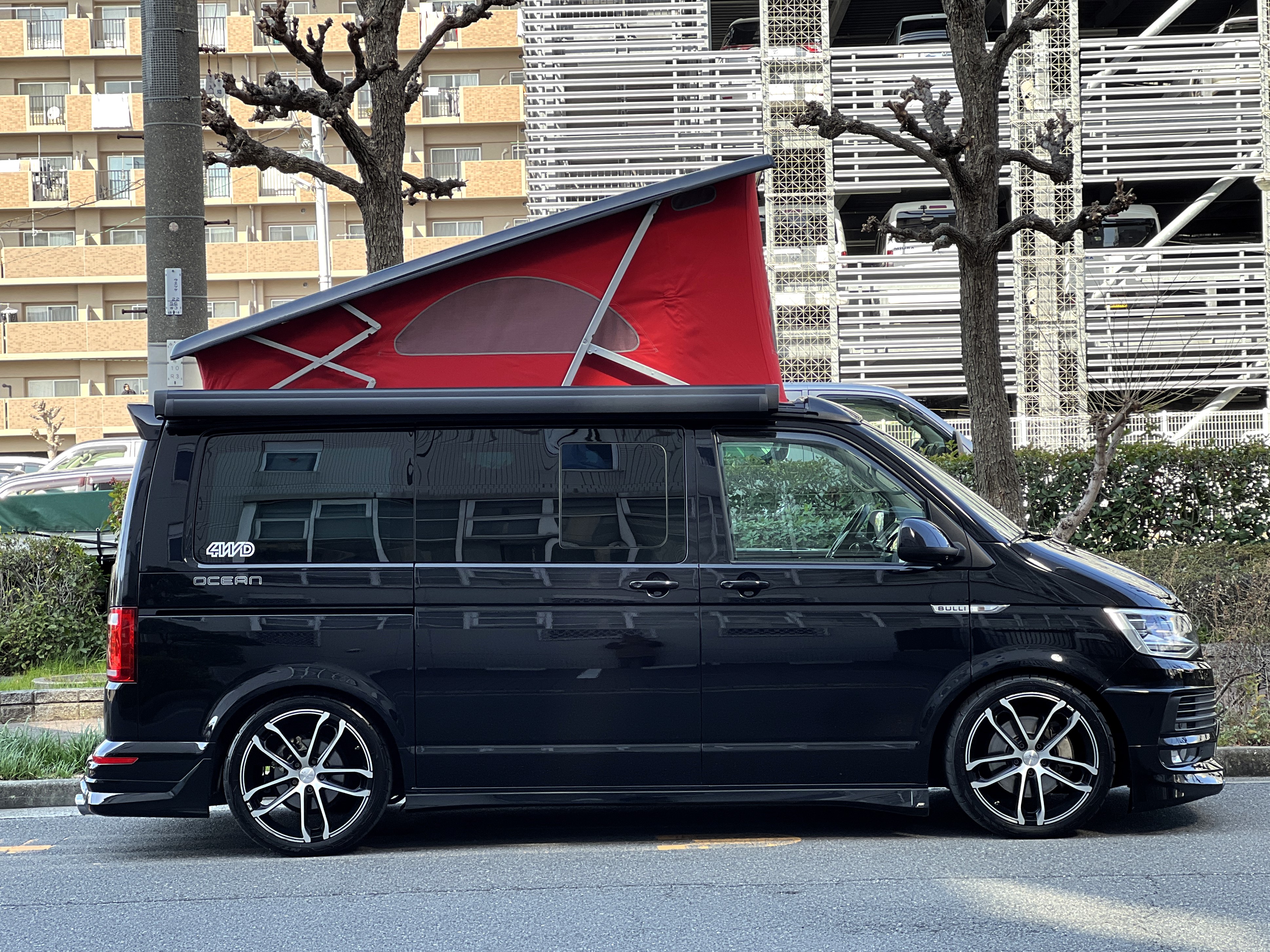 大変珍しい仕様のカリフォルニアオーシャン、登場です♬ 今回ご紹介するのは、ひと味違う特別なカリフォルニアオーシャン。なかなかお目にかかれない仕様で、思わず「おっ」となる一台です。現オーナーさまがこのオーシャンを手にされたのは約6年前。いわゆるキャンプ中心の使い方というよりは、このクルマが持つ“室内の広さ”を活かした別荘感覚の使い方で、全国津々浦々を旅してこられました♫行き先に着けば、そこはもう“もうひとつの自分の部屋”。そんな時間の使い方を、このカリフォルニアとともに楽しまれていたそうです。そしてもうひとつの魅力が、そのスタイル。“ドイツ人が泣いて喜びそうな”仕上がりの雰囲気を楽しみながら、ドライブそのものも満喫されていたとのこと◎ しかし今回、車両整理のため惜しまれつつも手放す決断をされました。「ぜひ、このカリフォルニアを気に入ってもらえたら嬉しいです。」とのコメントをいただいております。さて、そんなドイツ仕込みのオーシャンを見てまいりましょう♫ まず気になるのは、やはりそのルックスでしょう。なんとこのオーシャン、我々世代が憧れたABTスタイルをまとっているのです♫ 足元にもABTの20インチホイール。フロントグリルにはレッドラインが入り、スポーティな印象を演出・・・と思いきや、なんとポップアップルーフの生地もレッドで統一👍 ドイツ人が・・・というよりは、どちらかというとイギリス的なセンスが光る“遊びの効いたコーディネート”かもしれませんね◎ 大径ホイール+やんわりローダウン、そこに上品なエアロをまといながらも、芝生へスッと乗り入れてサイドオーニングを出してポップアップルーフを展開。かと思えば、都会ではビルの谷間を颯爽と駆け抜ける。この“アーバン×アウトドア”の絶妙なバランス感。もしかすると、近い将来日本でもこのスタイルが主流になるのかも?!と思わせてくれる一台です◎ そしてコンディションですが、ボディは新車のような輝き。思わず「ほんとにこの年式?」と疑ってしまうほどキレイです👍 なお、リアエアロのセンターカバーは撮影時点では外れておりますが、現オーナーさまご負担にてしっかり装着してからのお引き渡しとなりますのでご安心くださいませ。